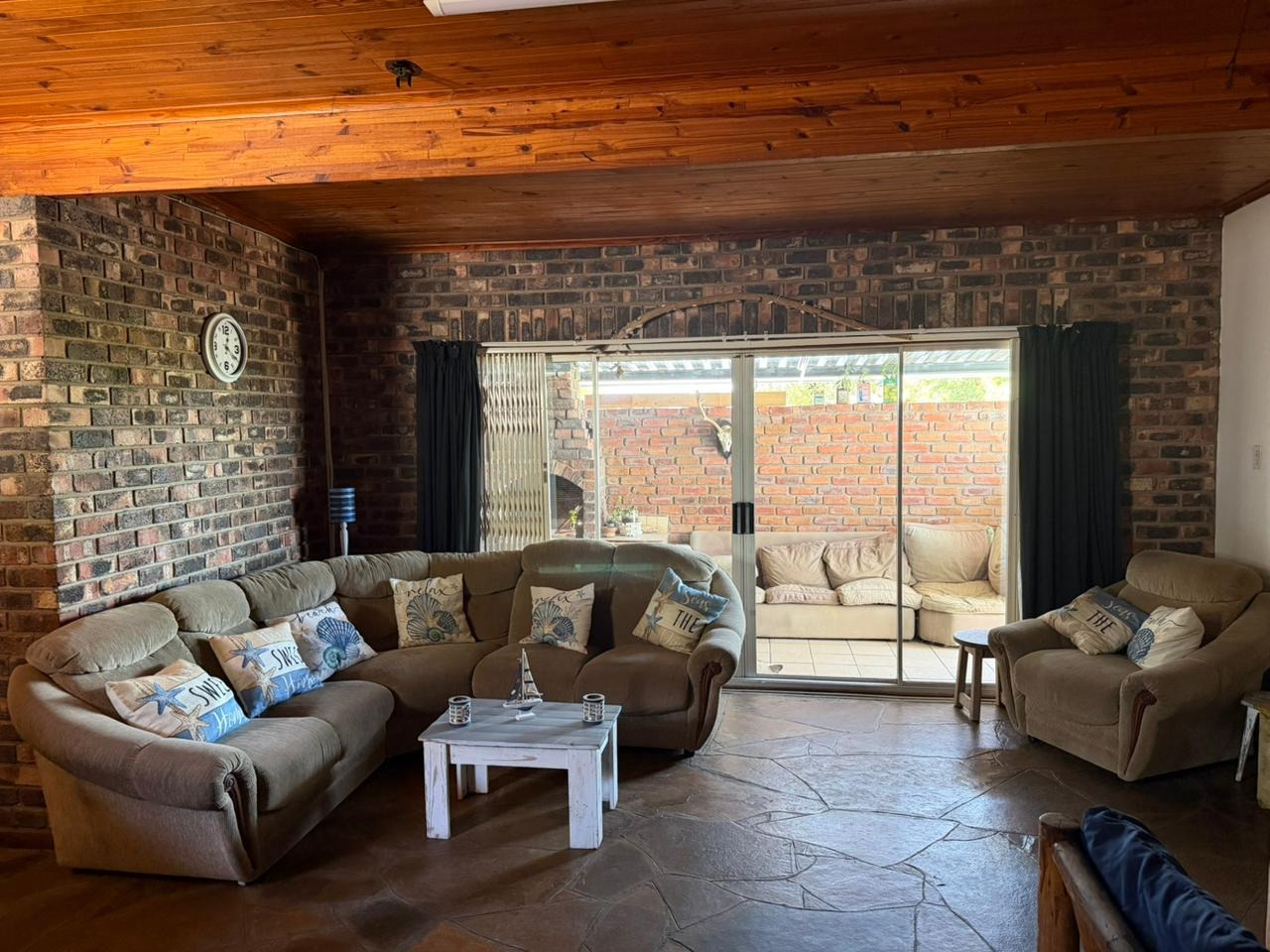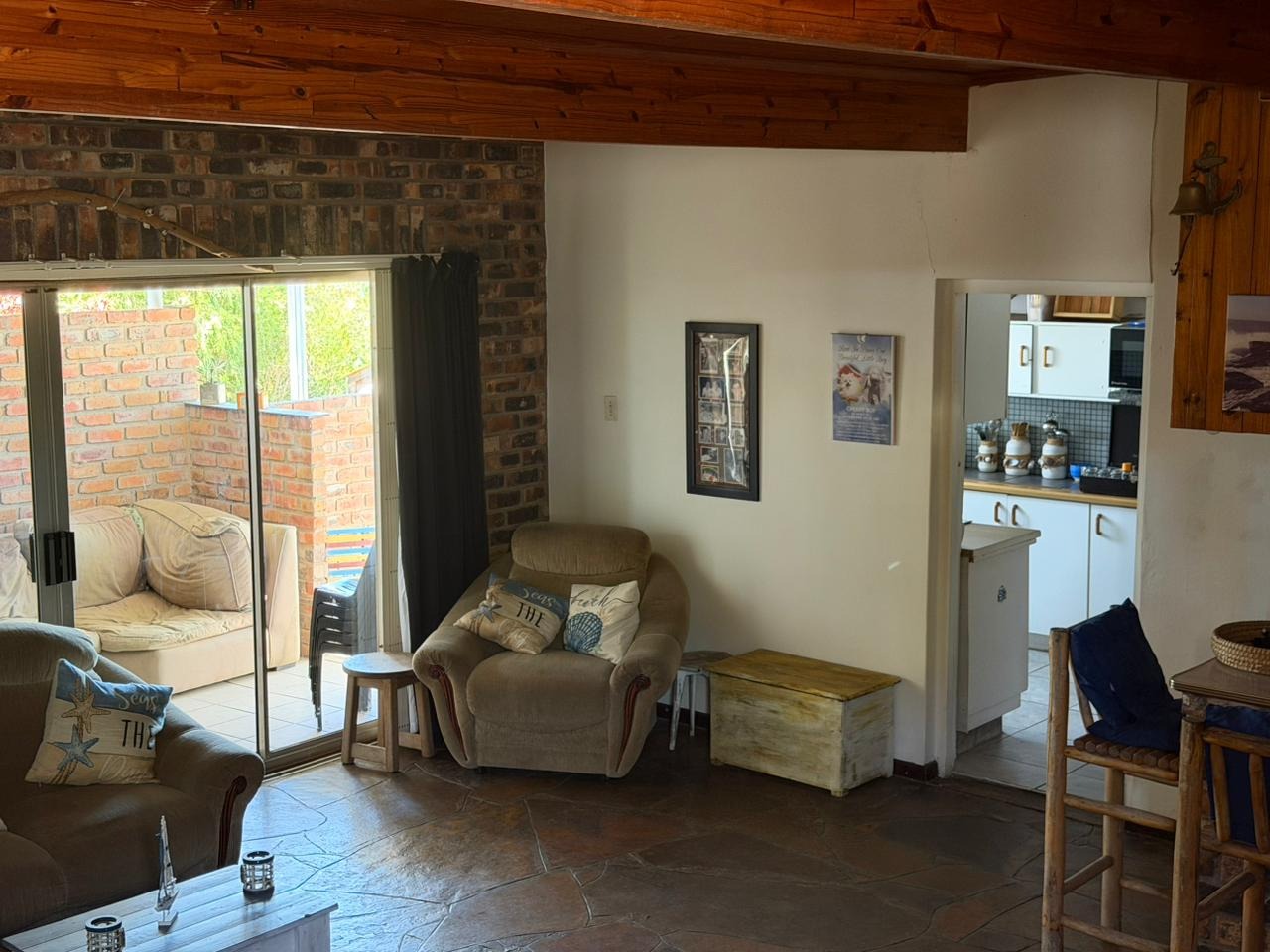 One of the two-bedroom flats boasts a very spacious lounge featuring a built-in bar, as well as a dedicated entertainment area with a braai, making it ideal for hosting guests.