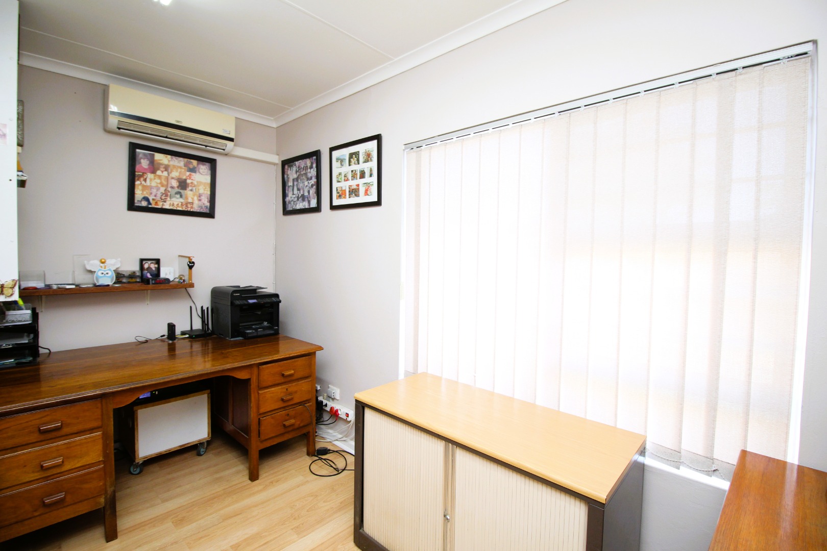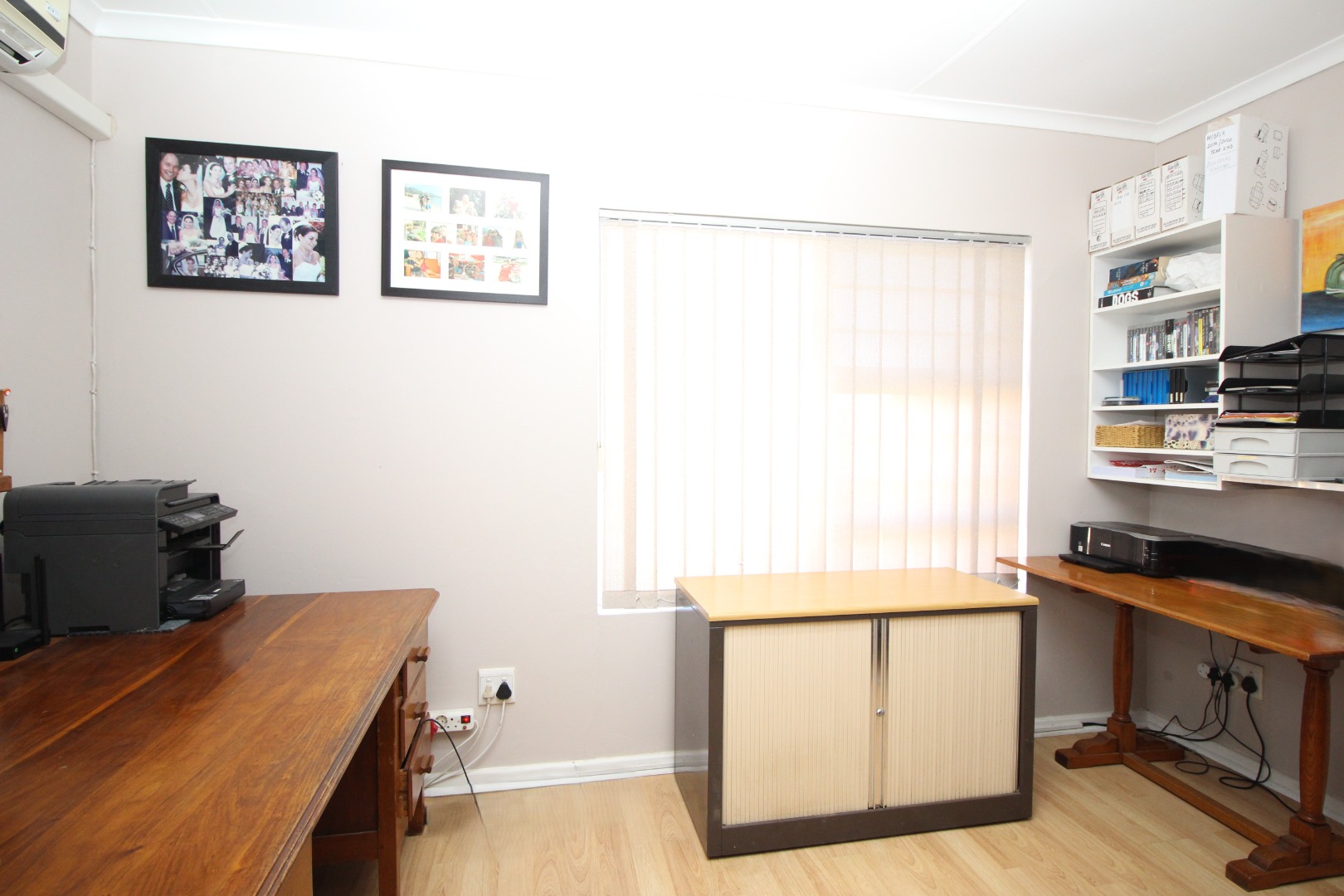 The home features two lounges, one with a built-in bar and fireplace, as well as a dining area. The study is fitted with air-conditioning. The kitchen includes a separate scullery and laundry area, adding to the home’s practicality.