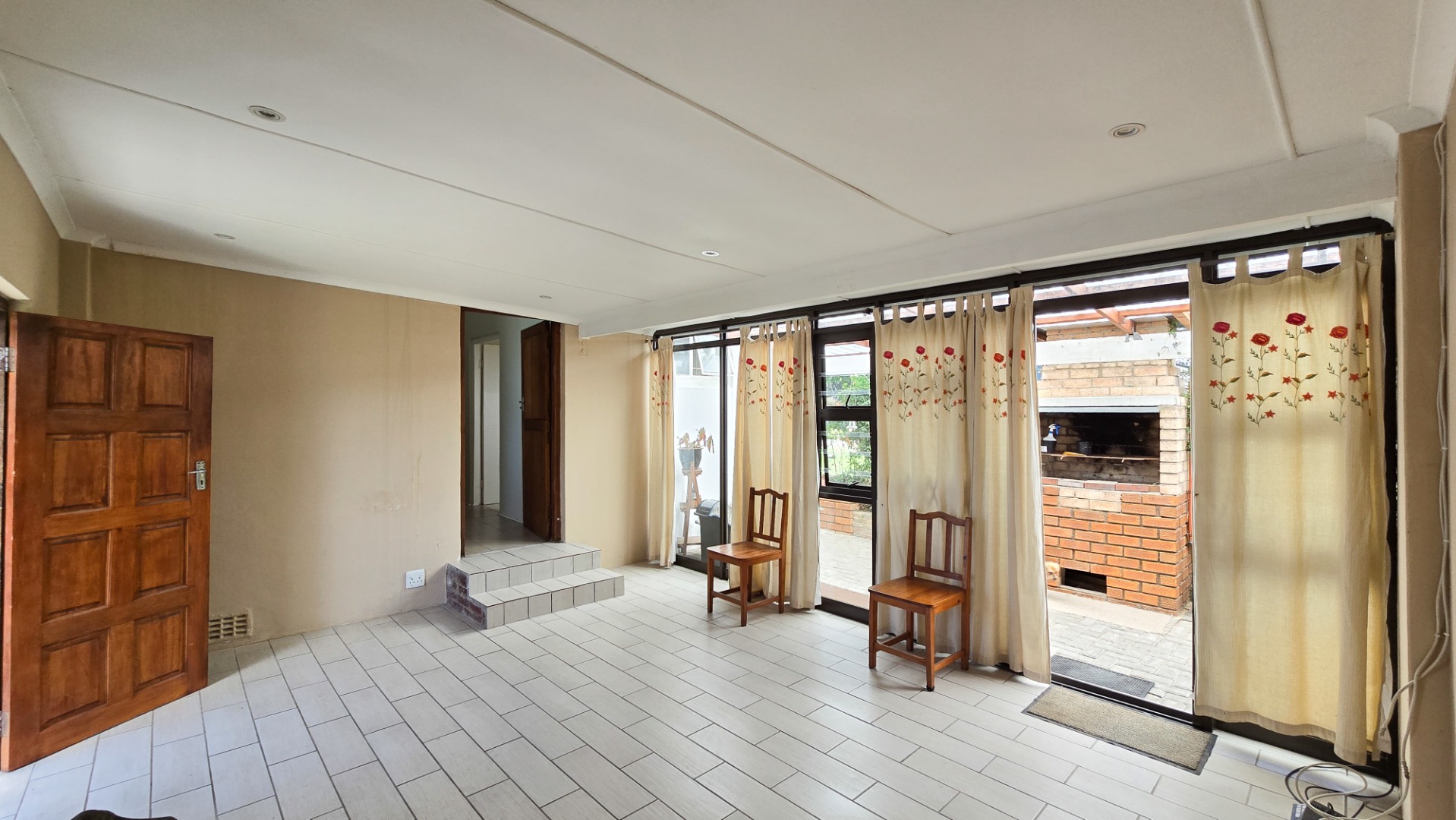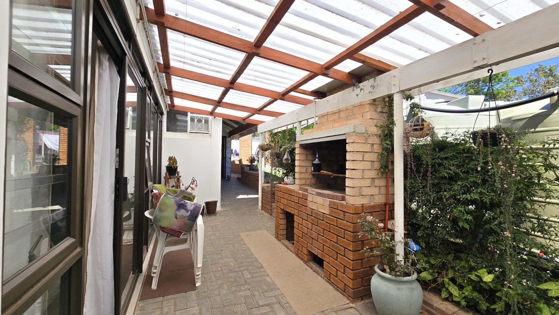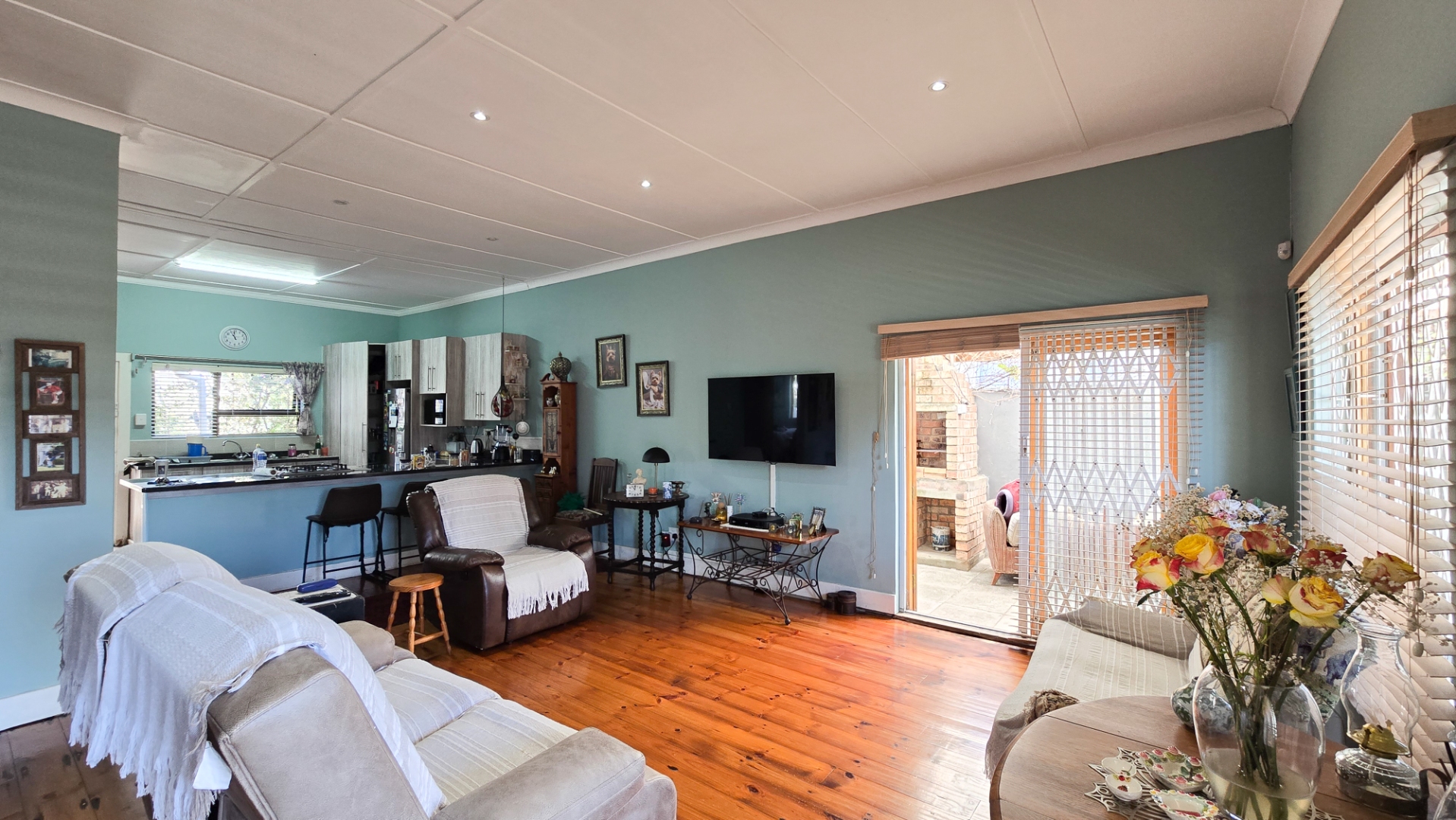 The open-plan kitchen, lounge, and dining area create a welcoming space for family gatherings, while the outdoor braai area is perfect for entertaining.