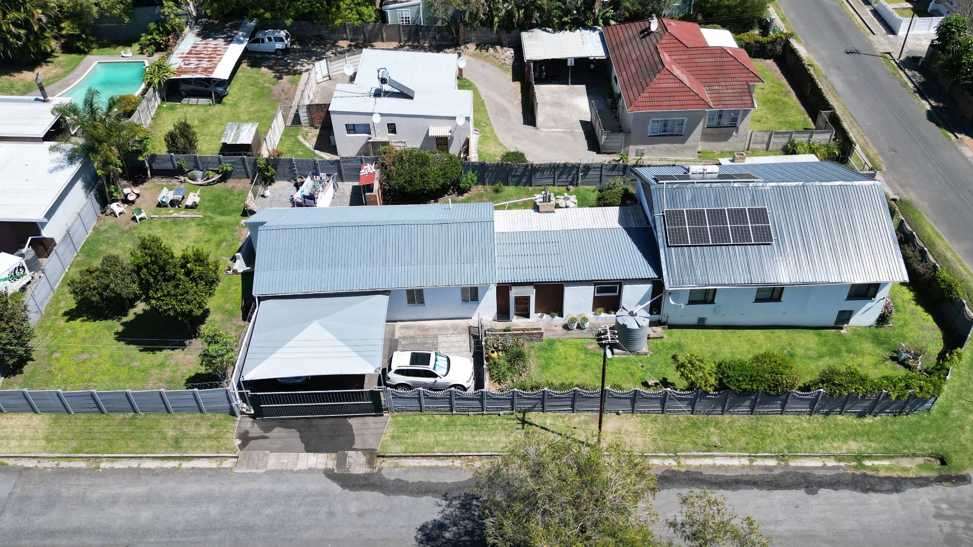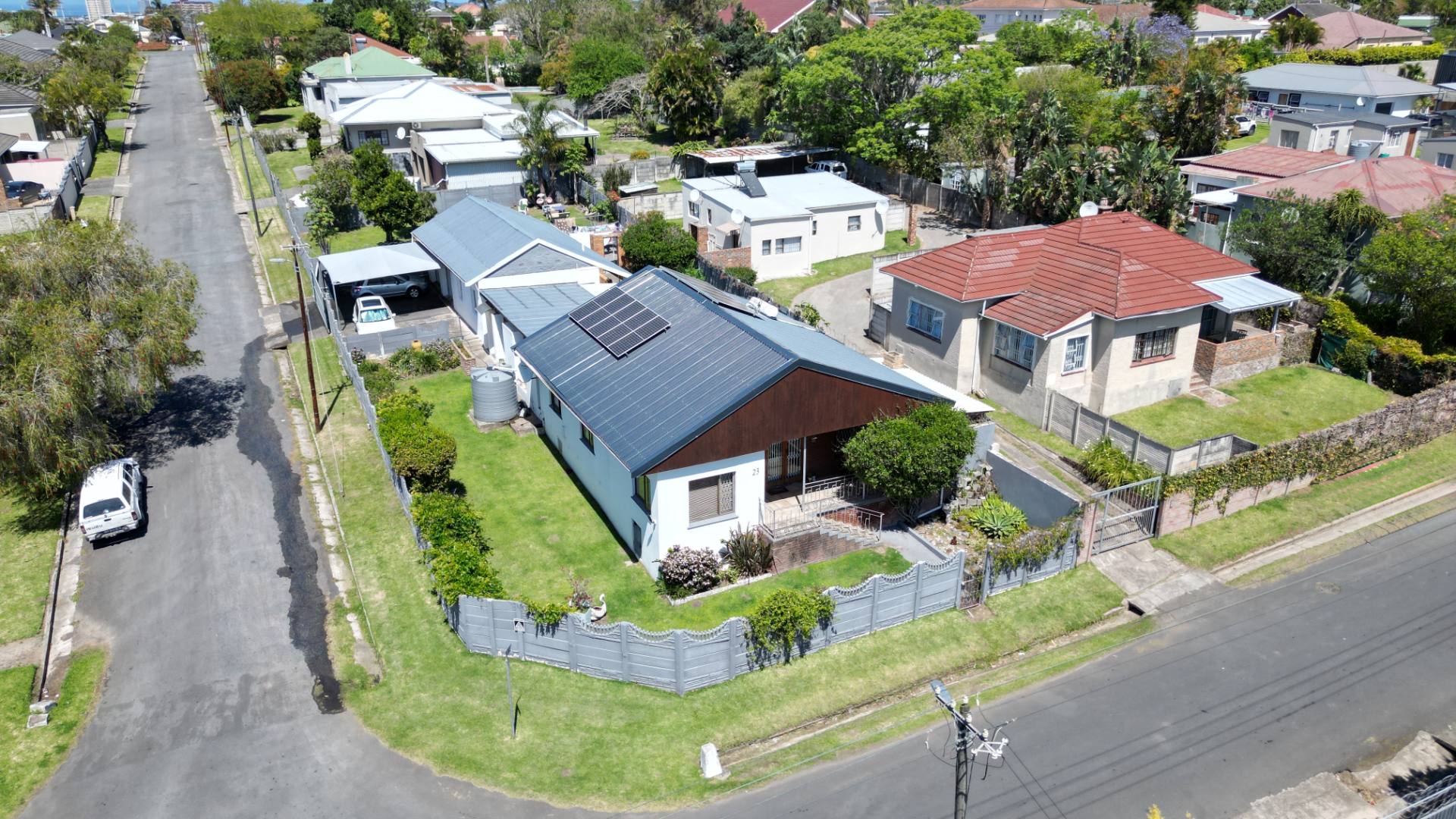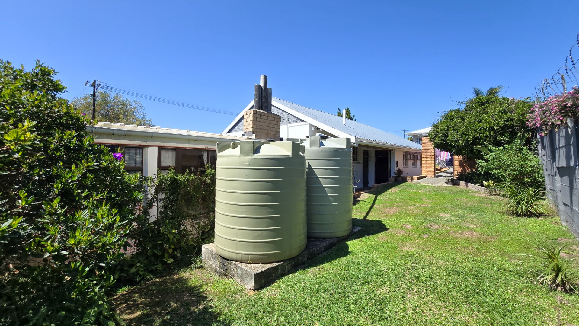 Sustainability is at the forefront with solar panels connected to an inverter and three JoJo water tanks ensuring efficient water management. The home also includes a double garage and a carport for ample parking.