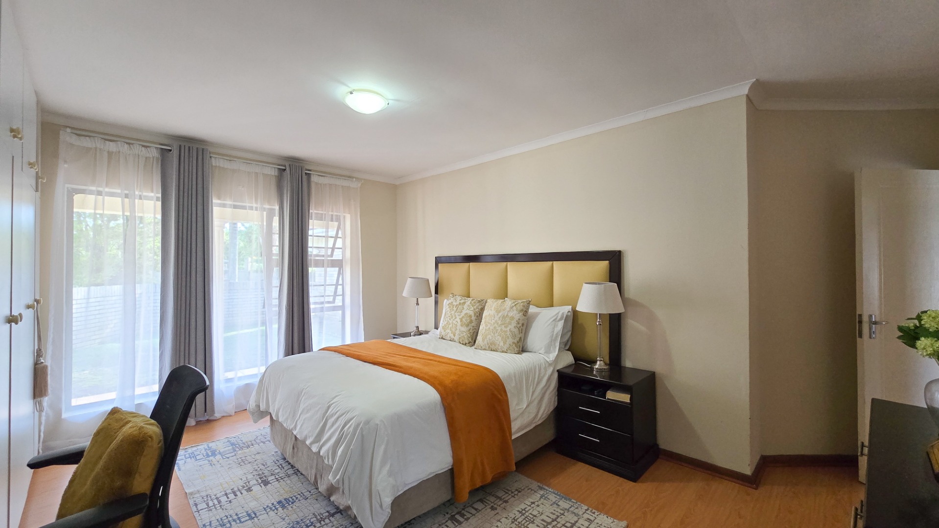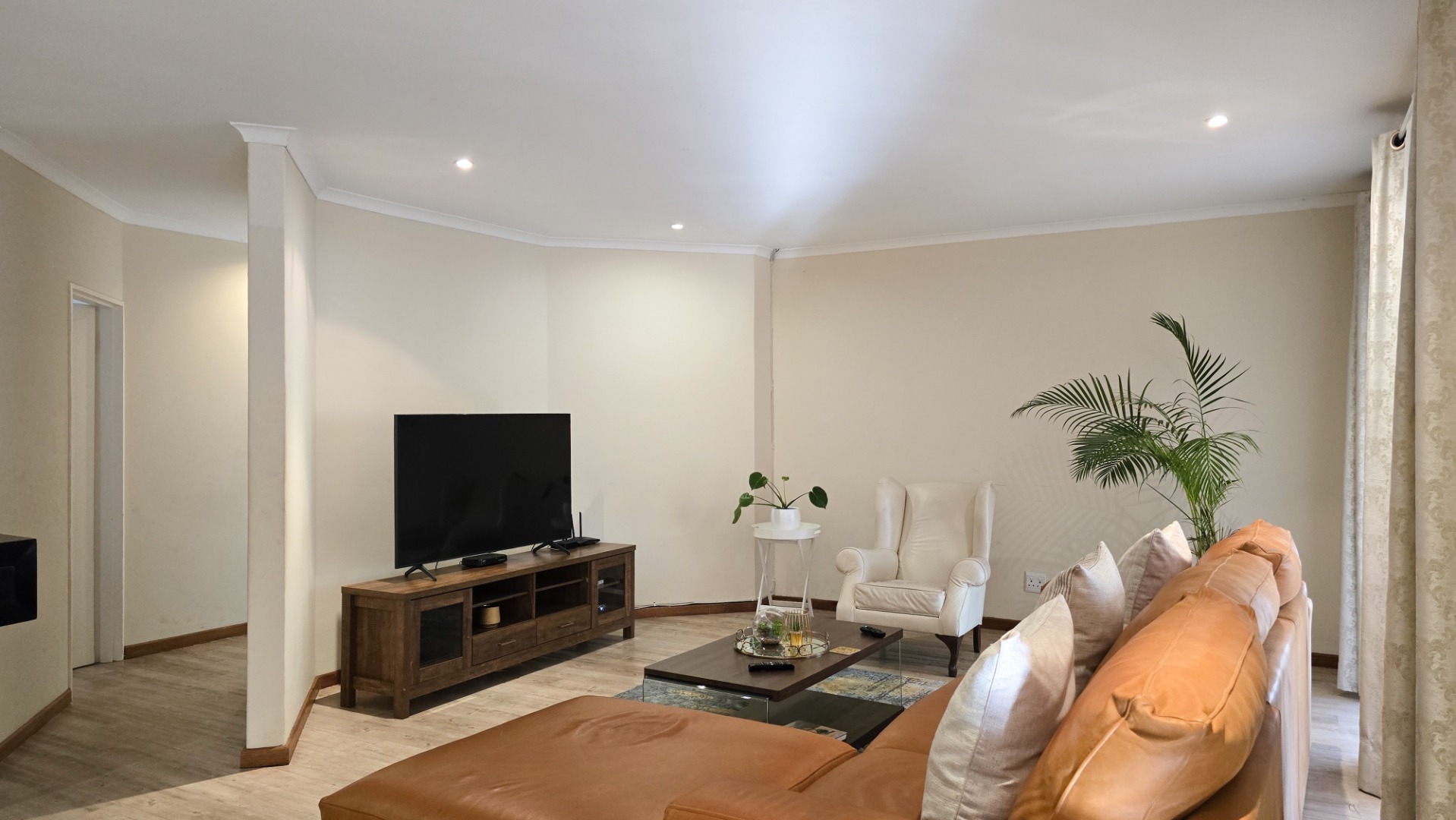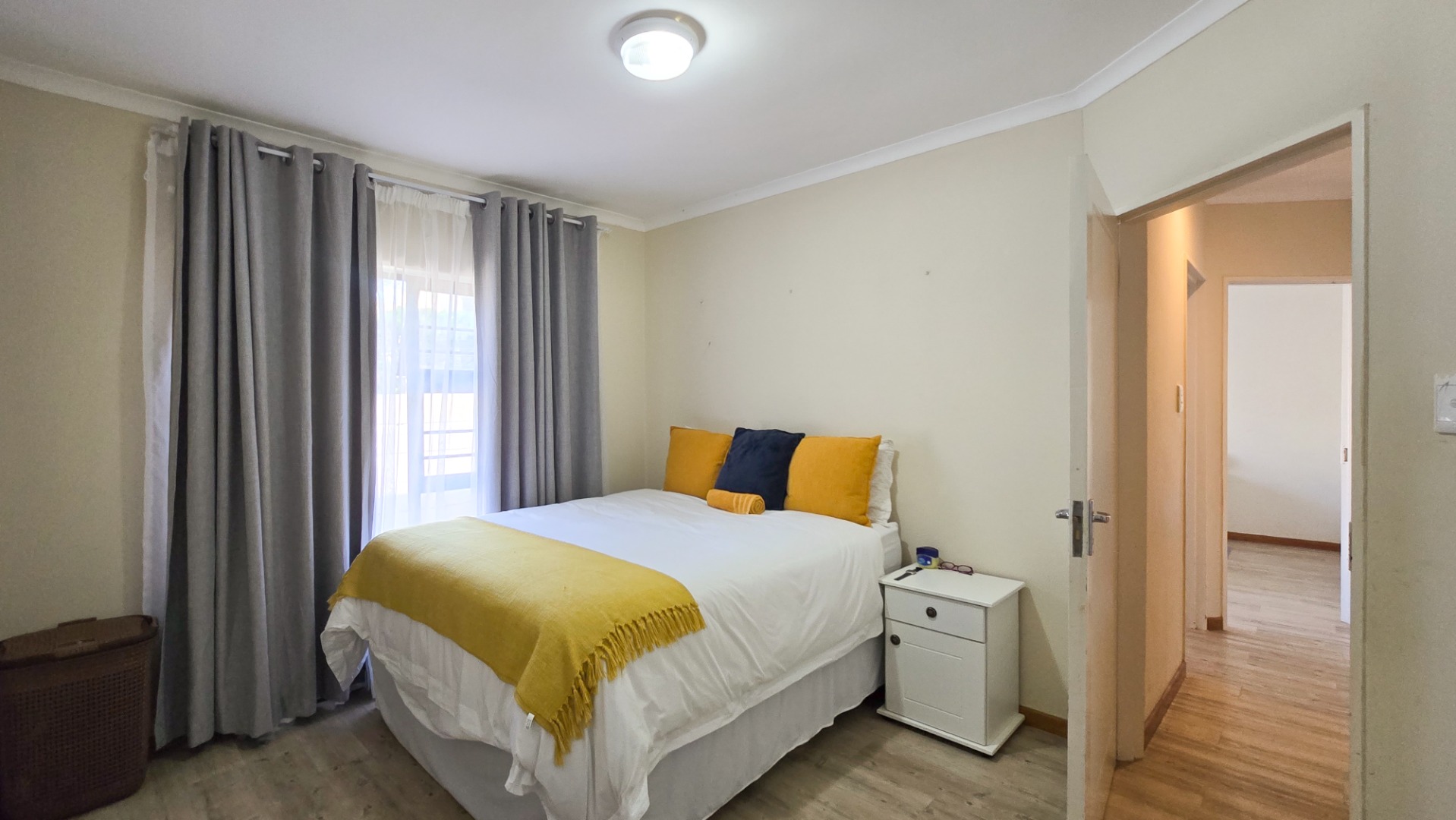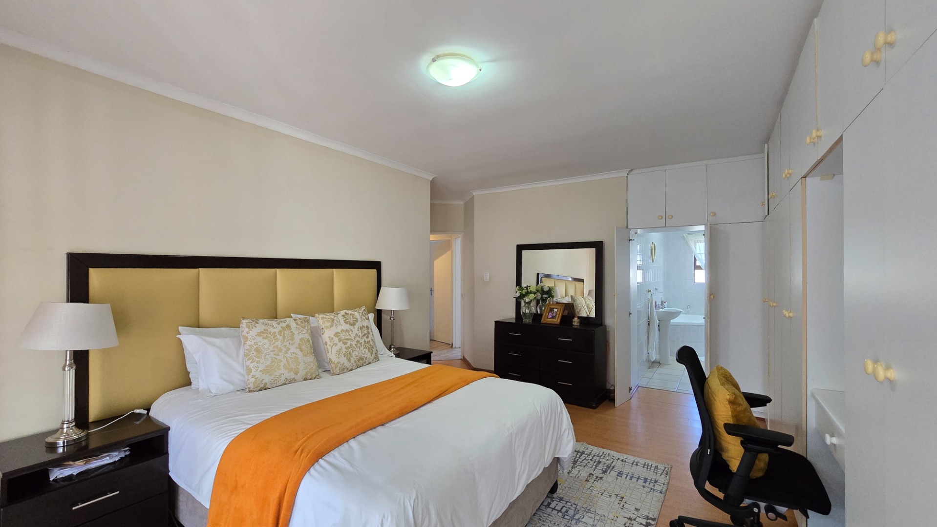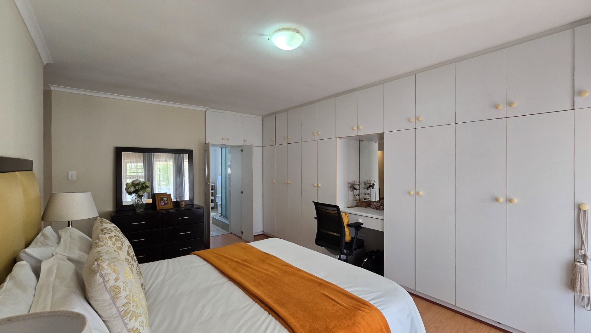 The property boasts three generously sized bedrooms; all fitted with built-in cupboards. The main bedroom features a full en-suite bathroom, while a second full bathroom caters to the remaining bedrooms and guests.