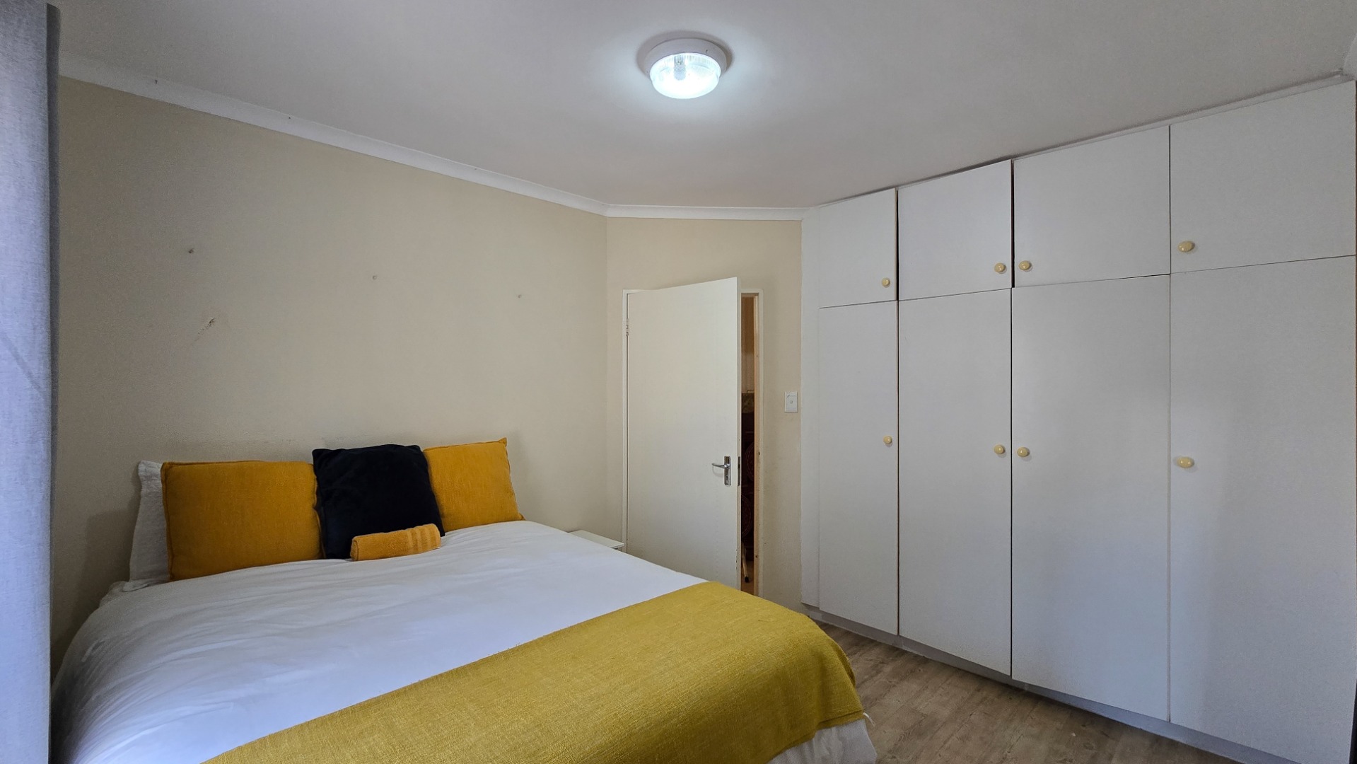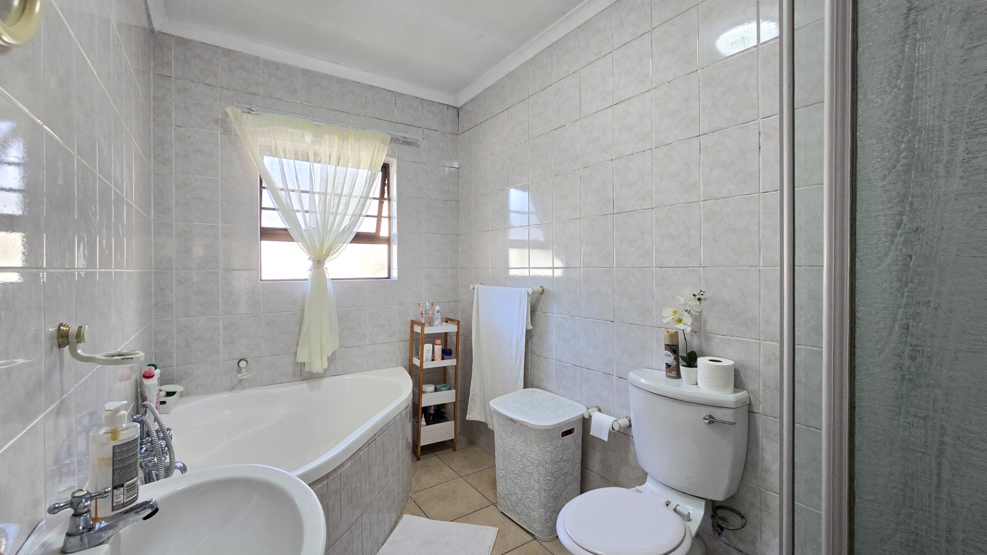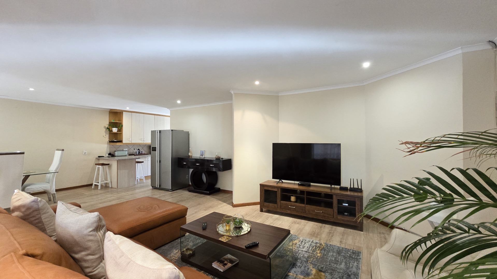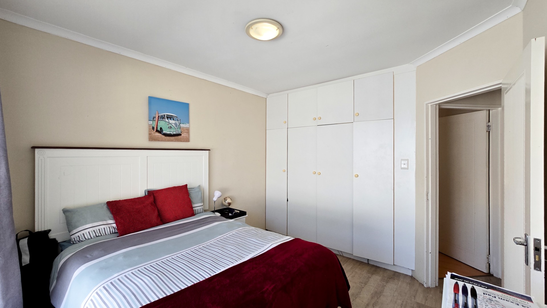 The property boasts three generously sized bedrooms; all fitted with built-in cupboards. The main bedroom features a full en-suite bathroom, while a second full bathroom caters to the remaining bedrooms and guests.