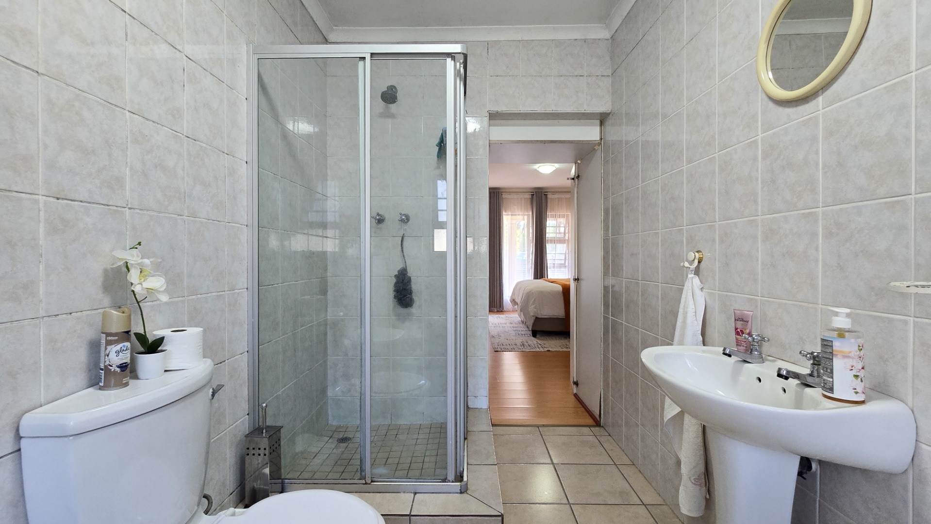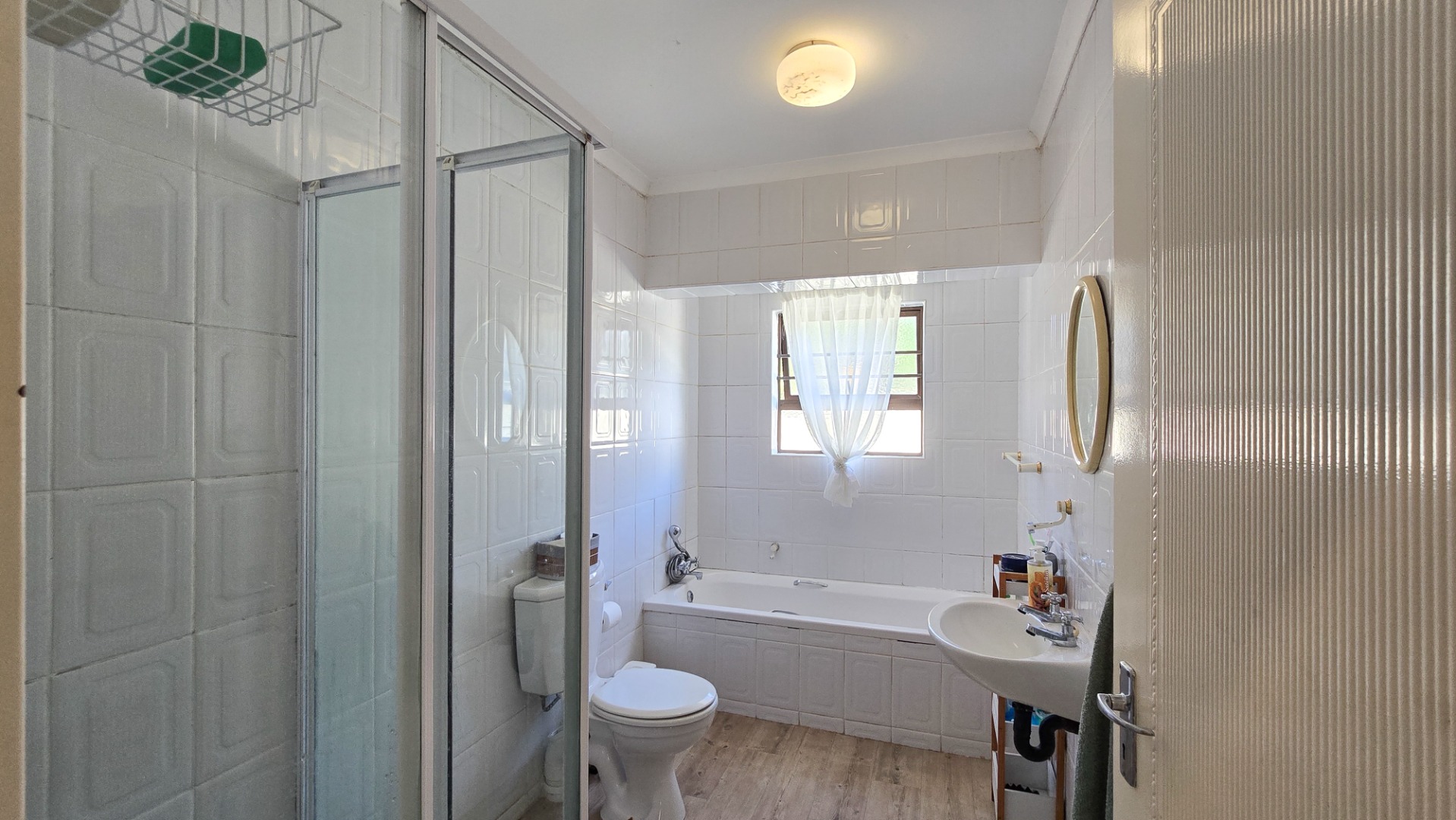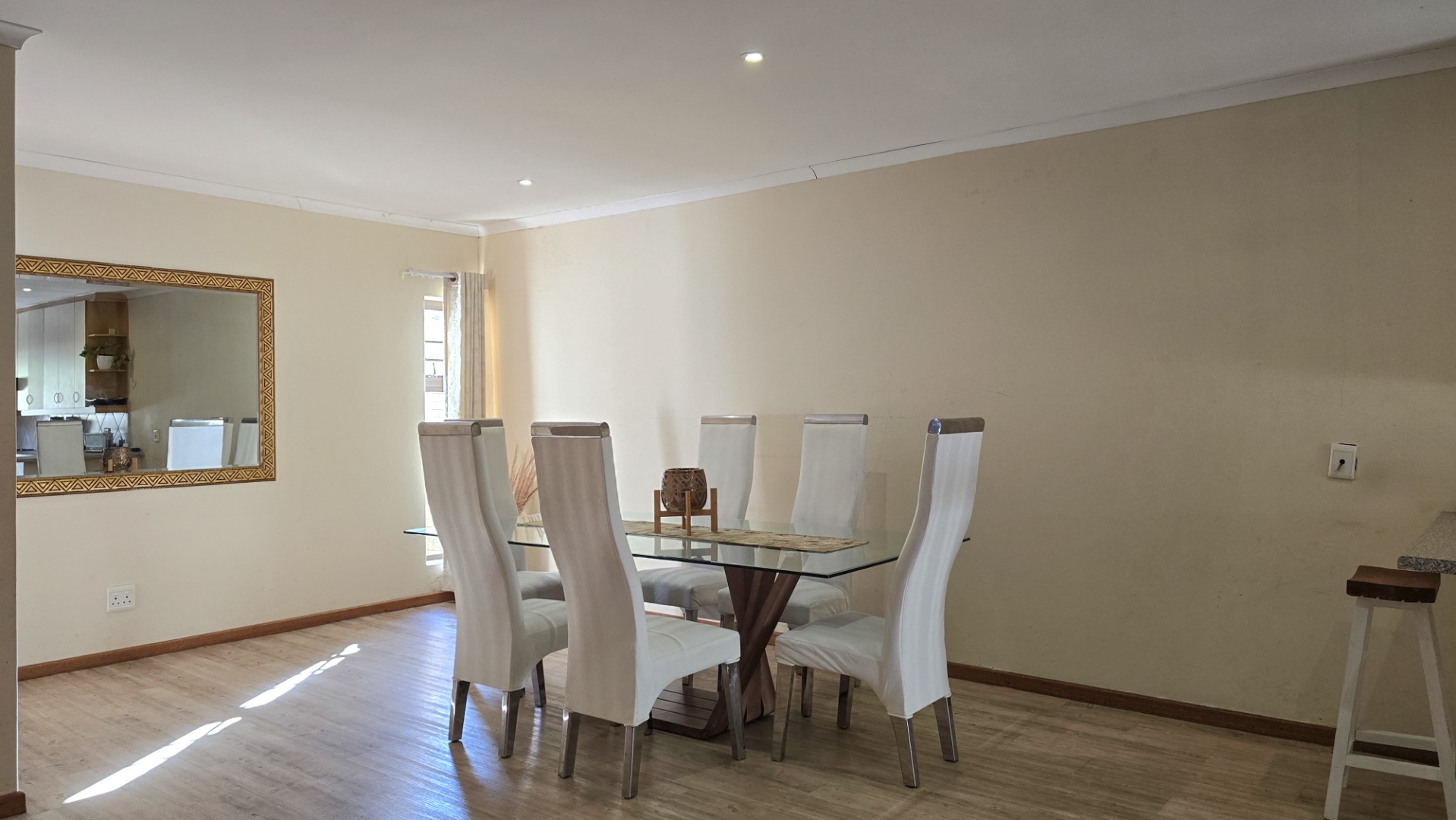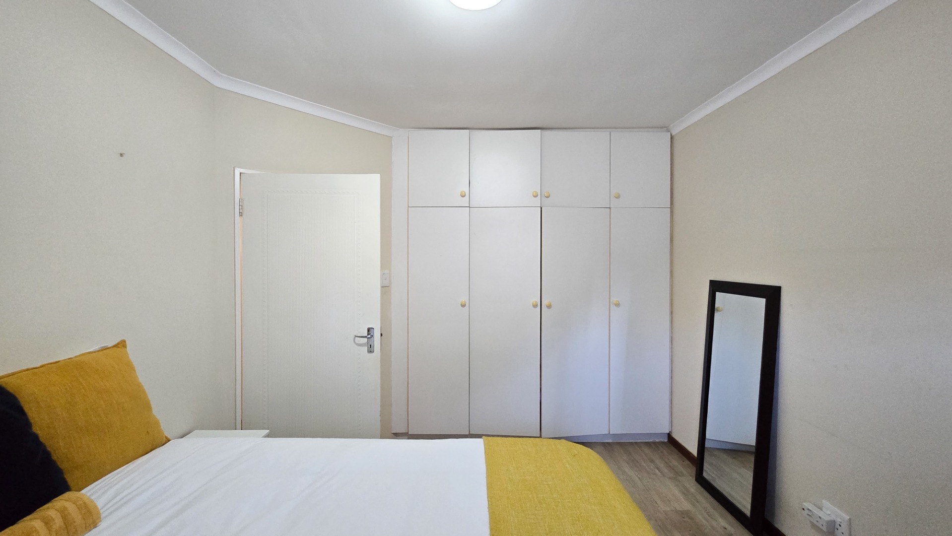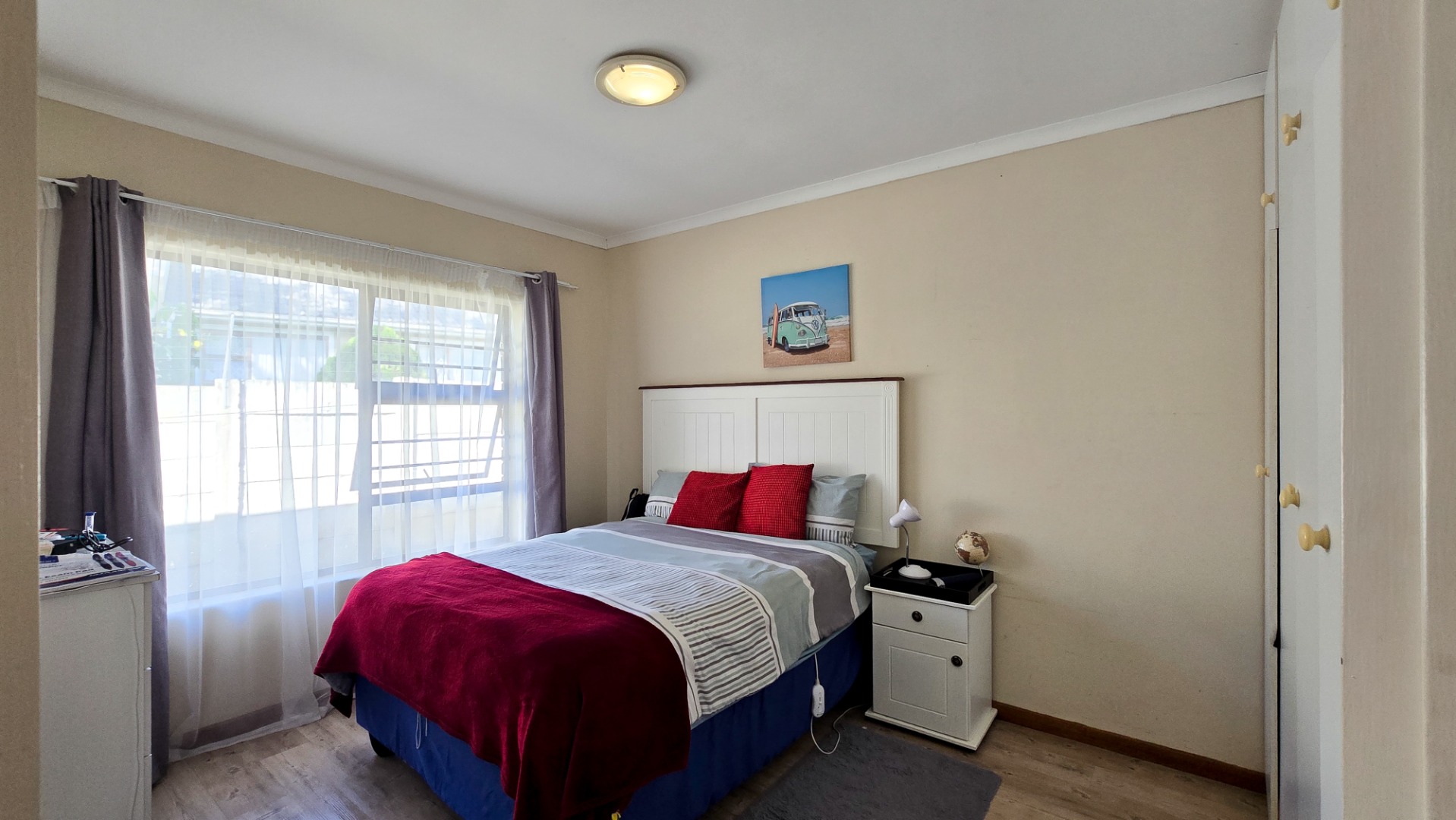 The property boasts three generously sized bedrooms; all fitted with built-in cupboards. The main bedroom features a full en-suite bathroom, while a second full bathroom caters to the remaining bedrooms and guests.