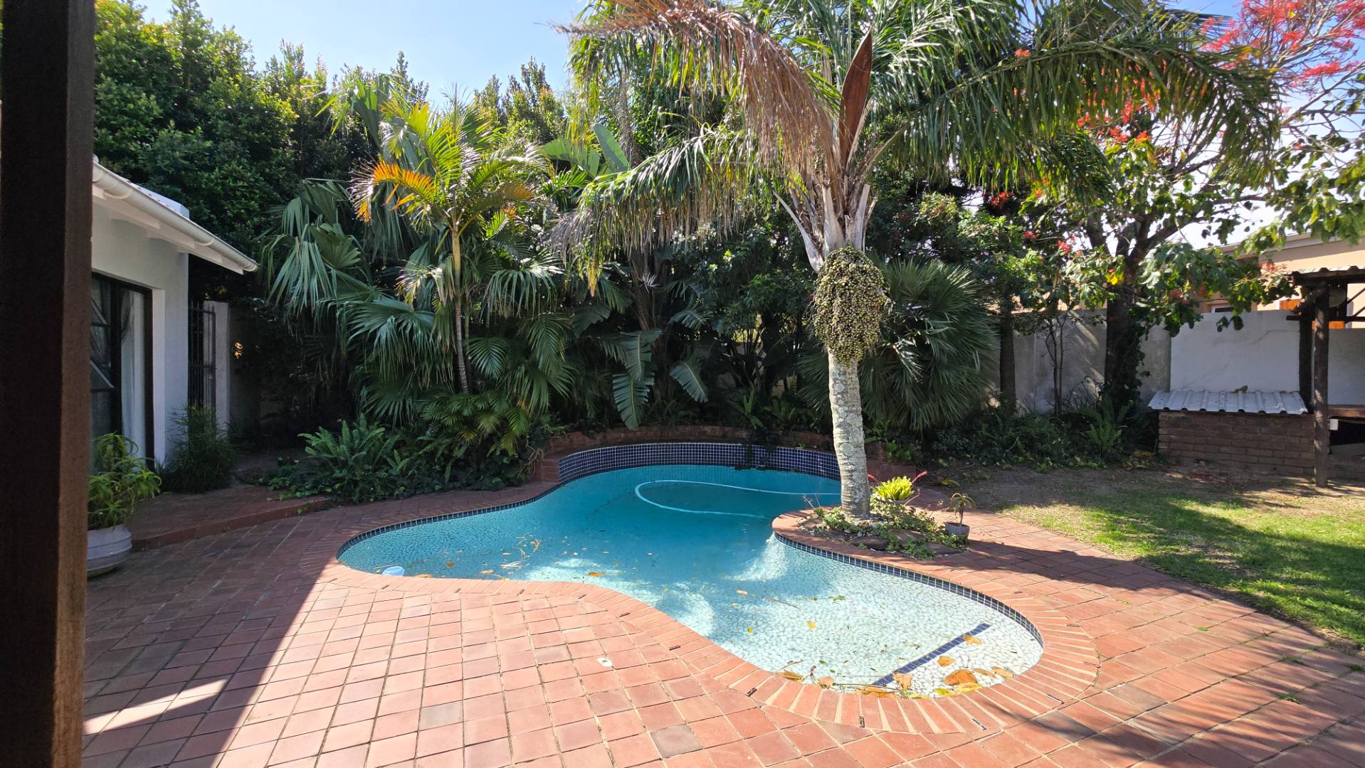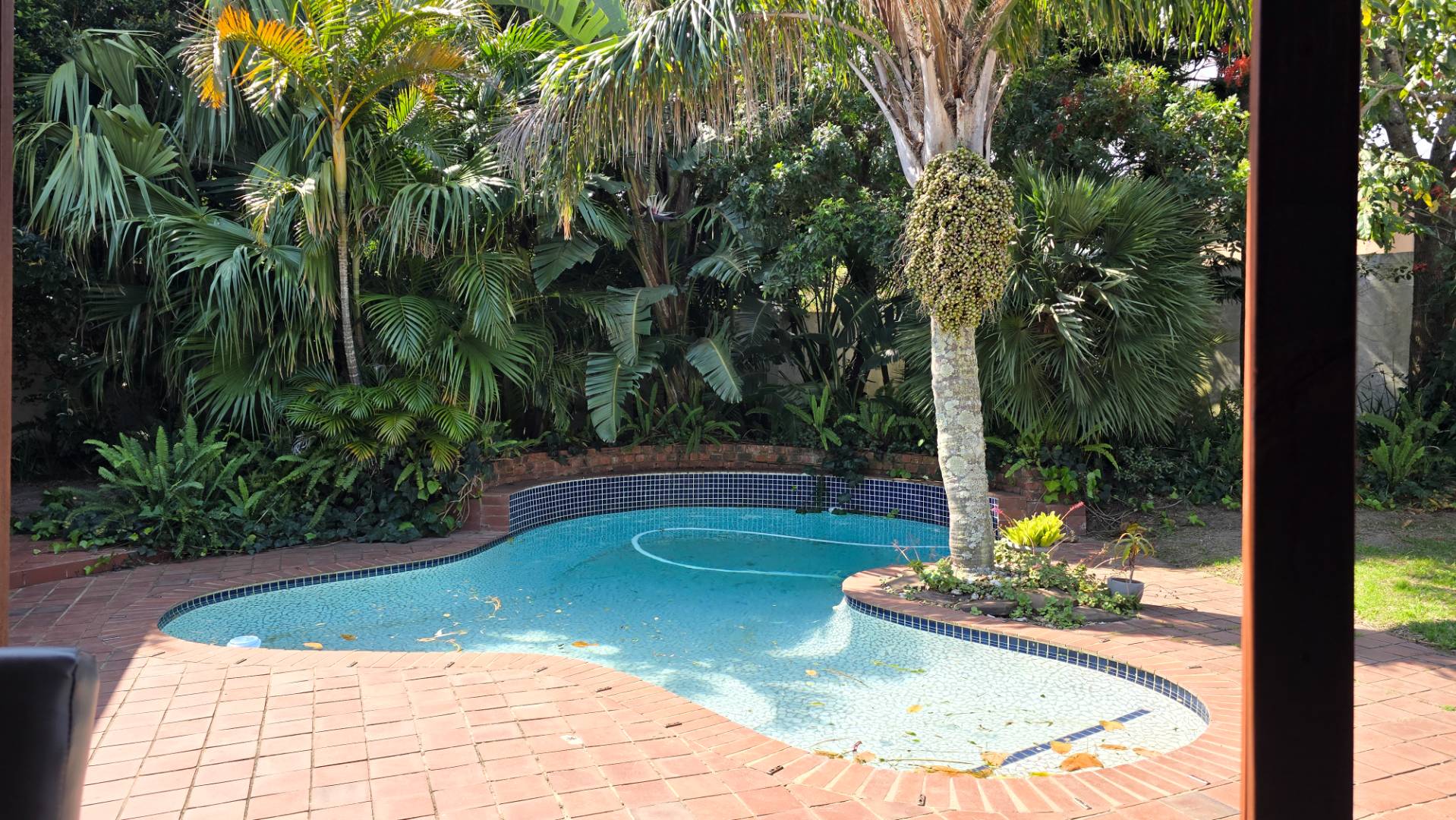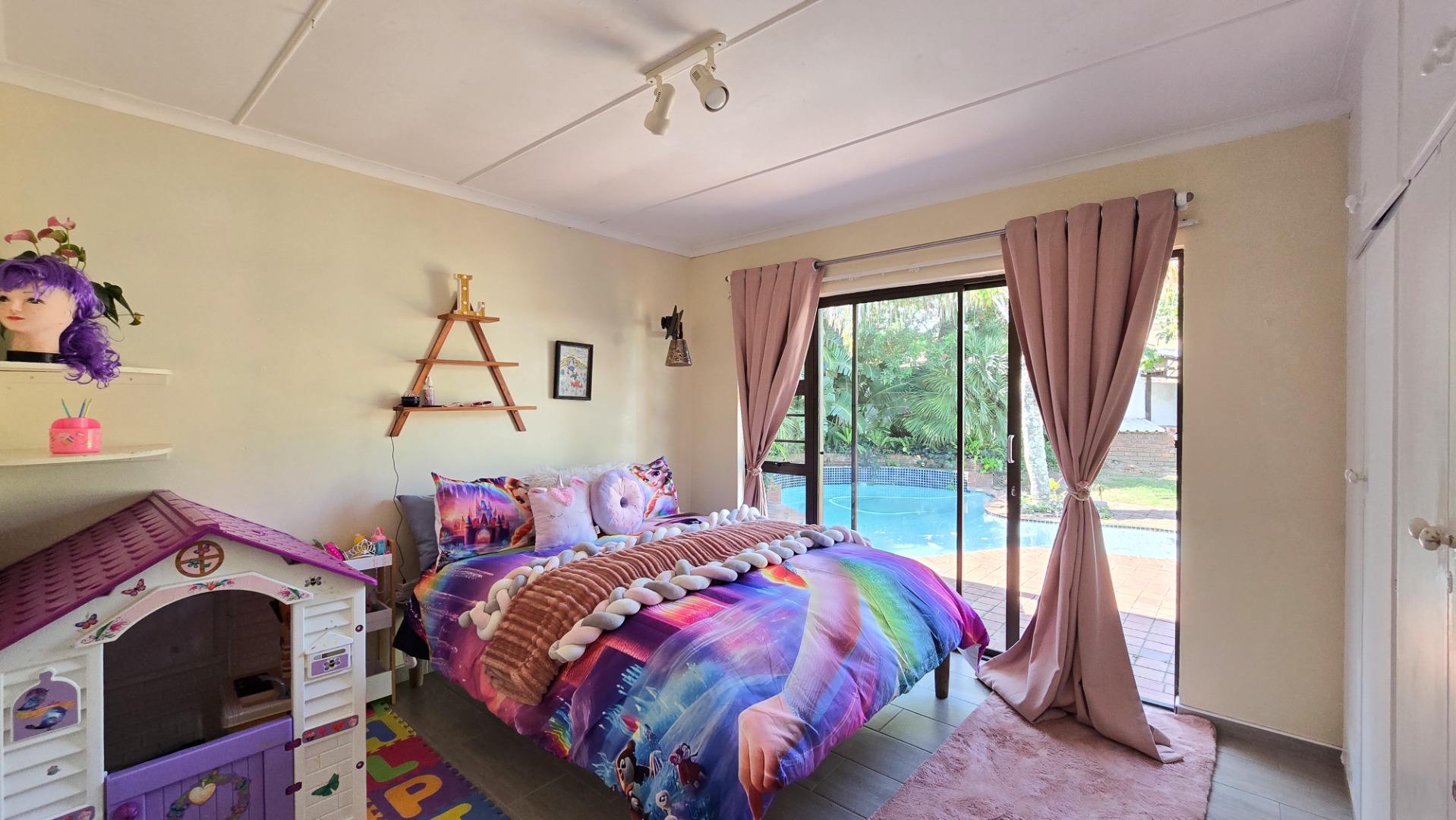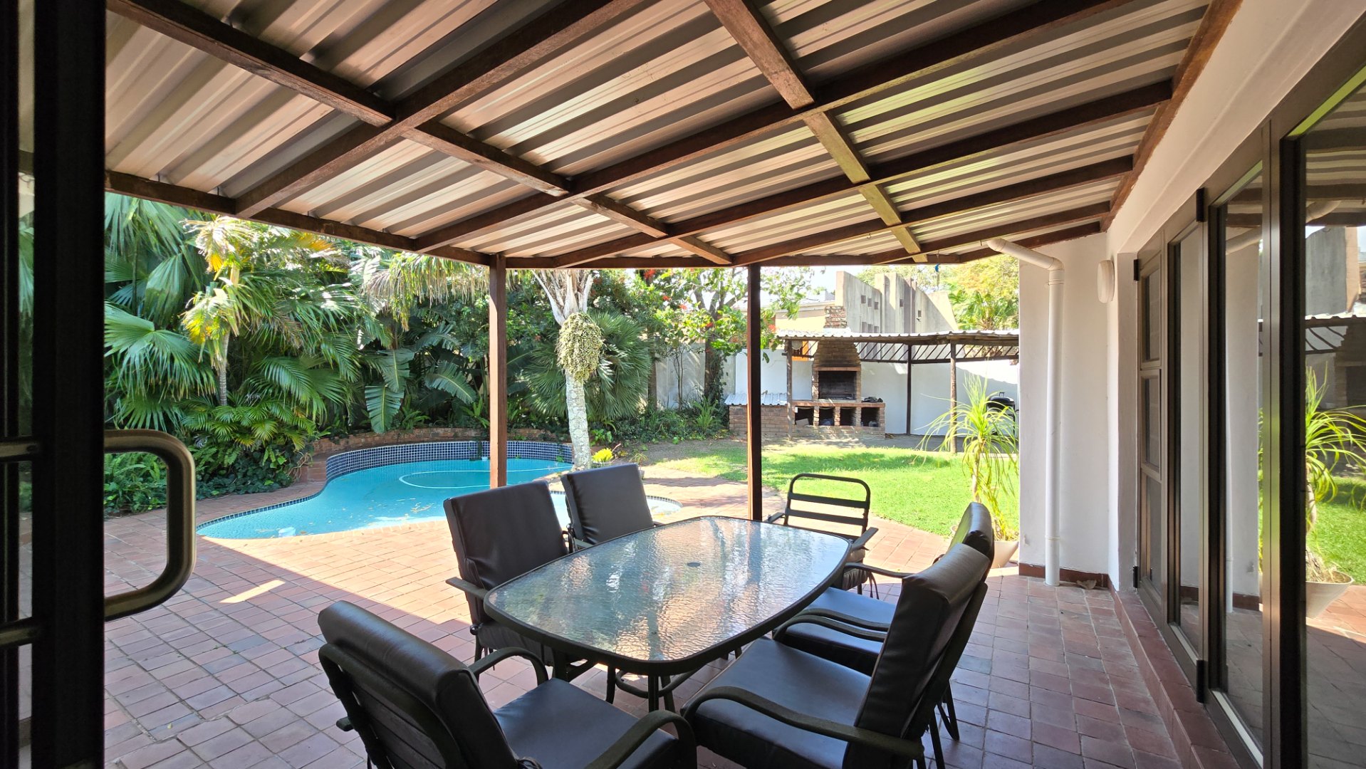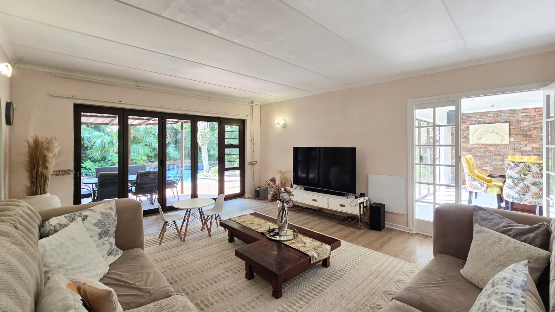 The main house surrounds a tropical braai/entertainment area and sparkling pool, and offers 4 Bedrooms (3 of which have sliding doors onto the swimming pool), 2 Bathrooms (main is en-suite), 2 lounges (one with stacking doors opening onto a terracotta tiled patio and the garden), a study, a dining room which is open to the kitchen (includes a scullery), double garage (automated) with direct access to the kitchen and additional Parking for 2 cars. The level front garden provides space for children to play and is fully walled.