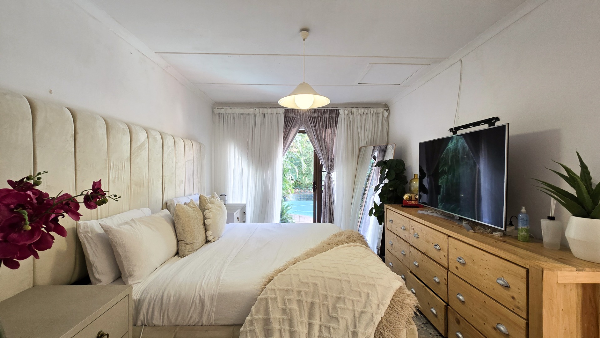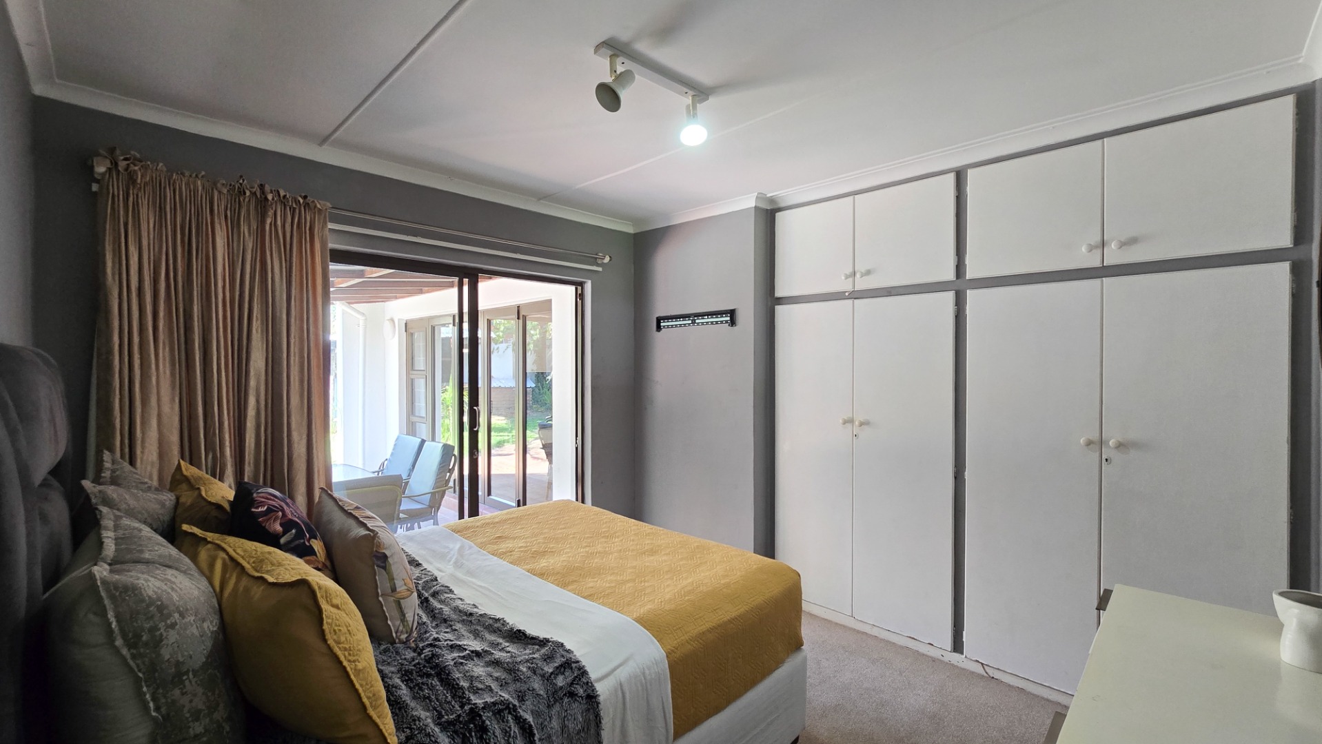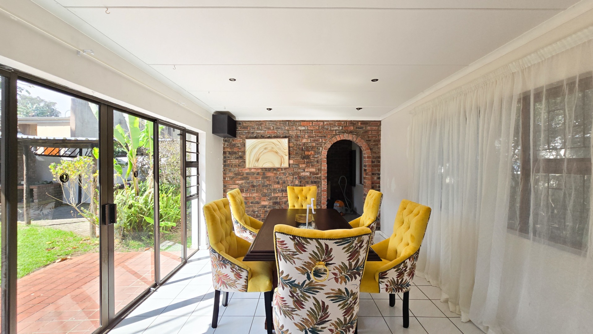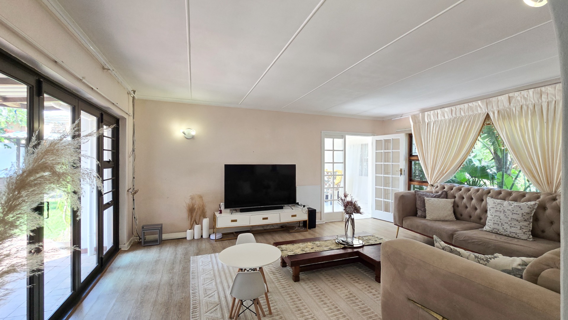 The main house surrounds a tropical braai/entertainment area and sparkling pool, and offers 4 Bedrooms (3 of which have sliding doors onto the swimming pool), 2 Bathrooms (main is en-suite), 2 lounges (one with stacking doors opening onto a terracotta tiled patio and the garden), a study, a dining room which is open to the kitchen (includes a scullery), double garage (automated) with direct access to the kitchen and additional Parking for 2 cars. The level front garden provides space for children to play and is fully walled.
