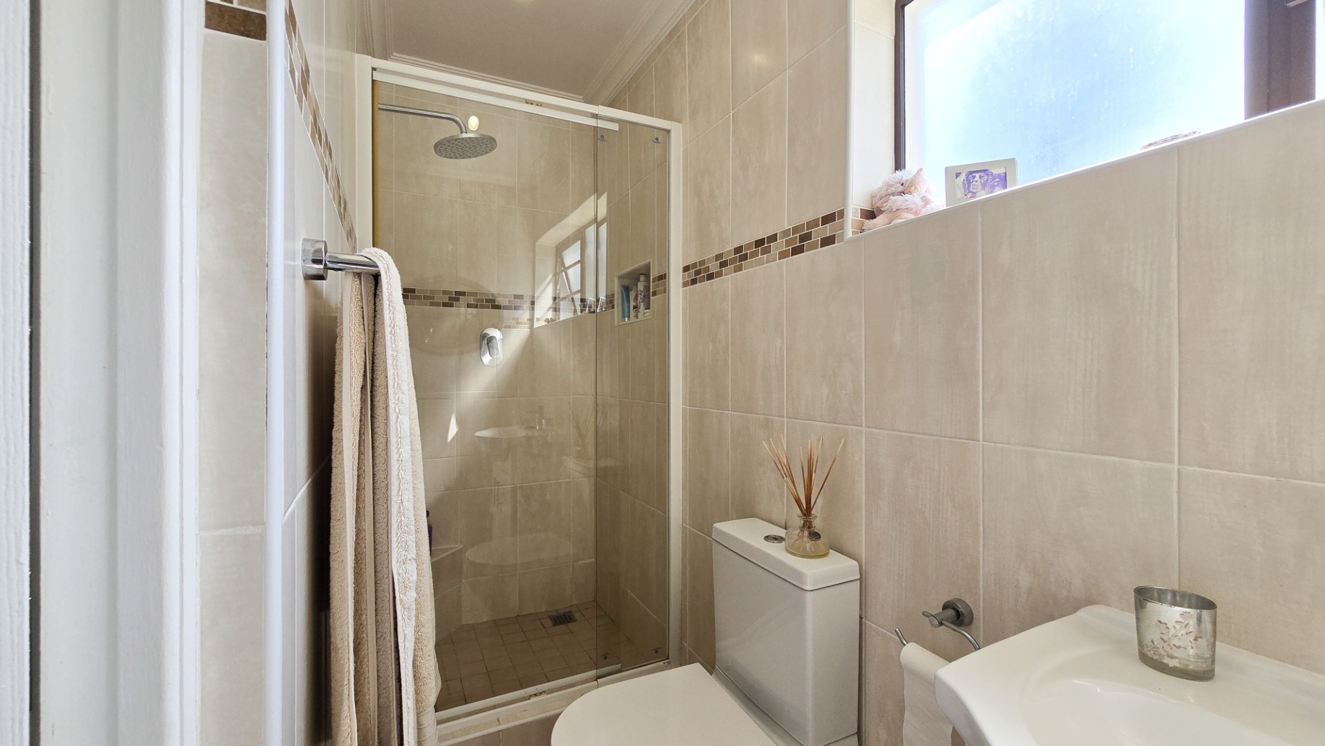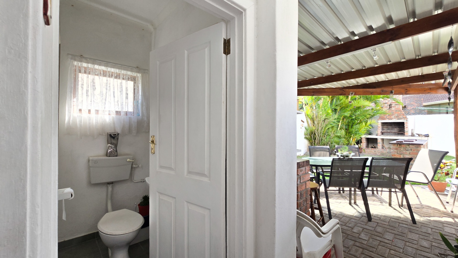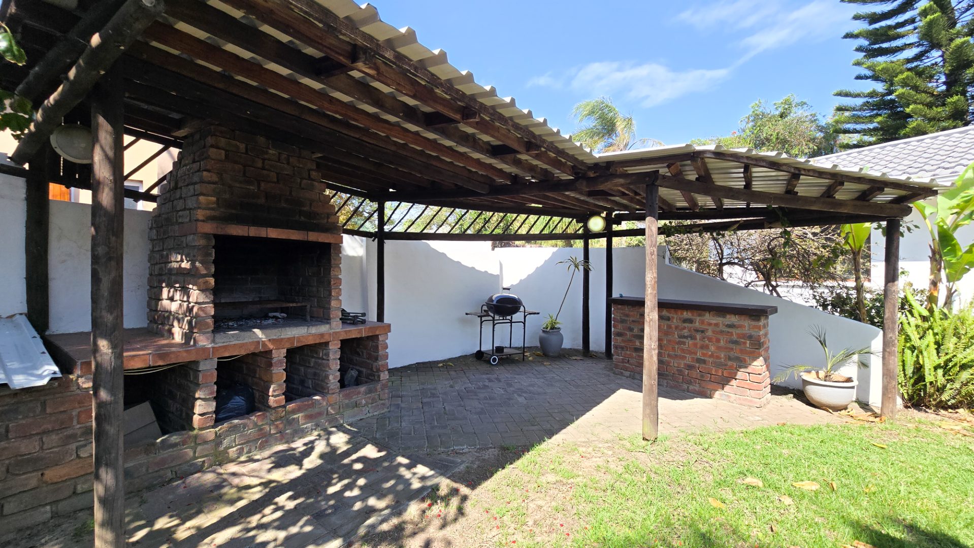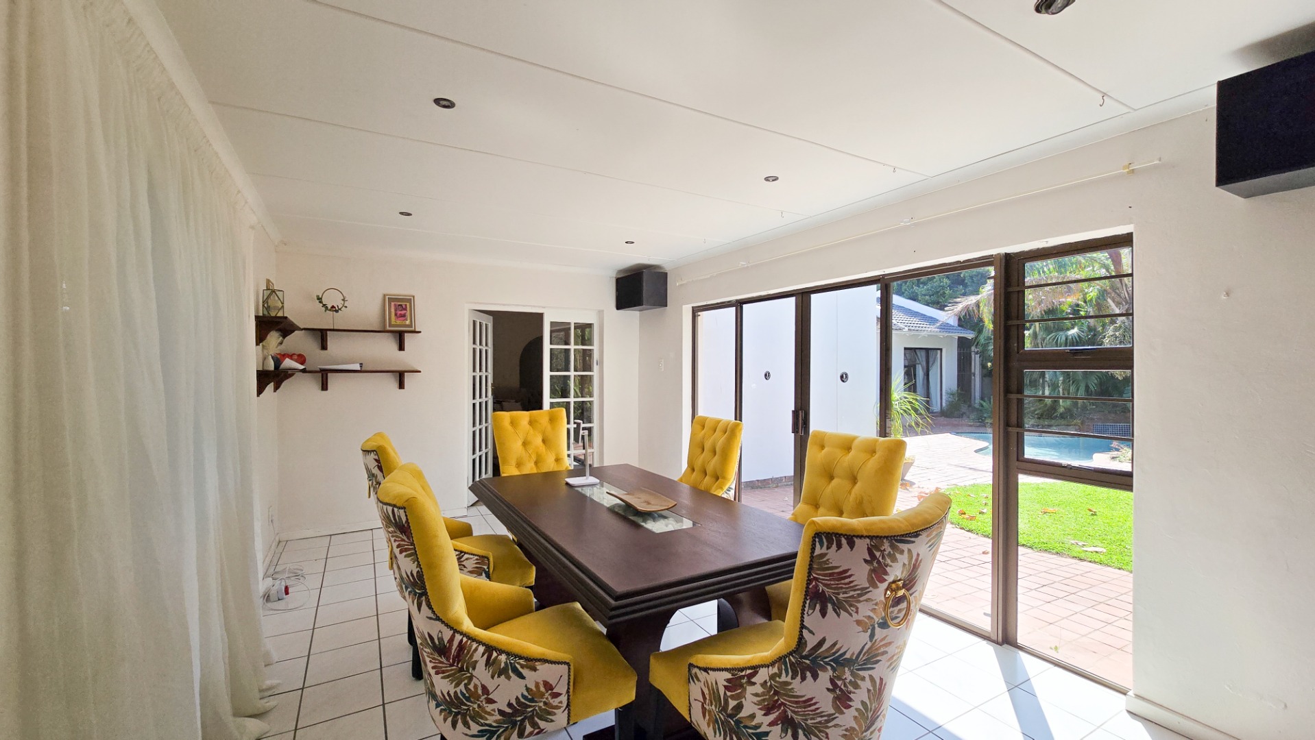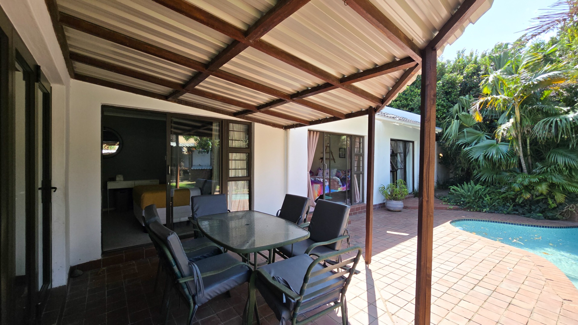 The main house surrounds a tropical braai/entertainment area and sparkling pool, and offers 4 Bedrooms (3 of which have sliding doors onto the swimming pool), 2 Bathrooms (main is en-suite), 2 lounges (one with stacking doors opening onto a terracotta tiled patio and the garden), a study, a dining room which is open to the kitchen (includes a scullery), double garage (automated) with direct access to the kitchen and additional Parking for 2 cars. The level front garden provides space for children to play and is fully walled.