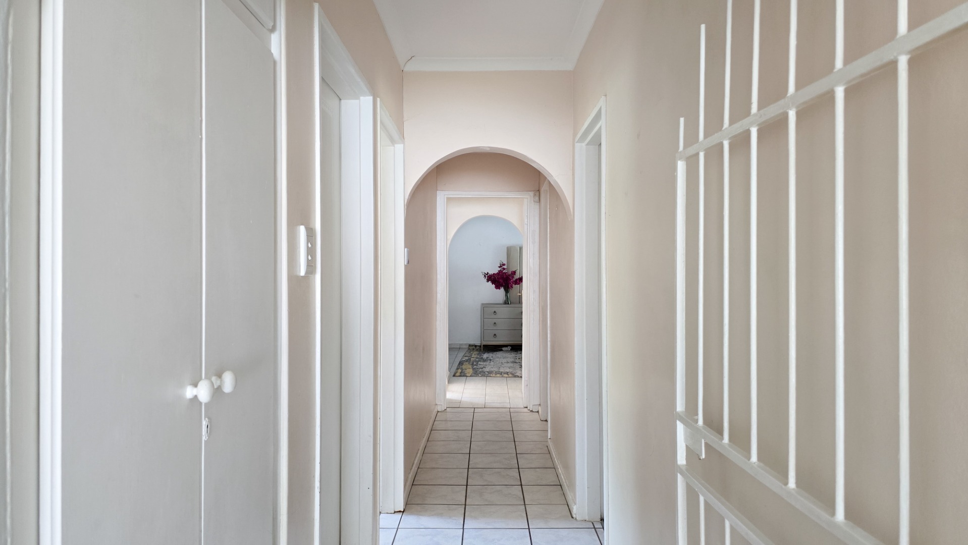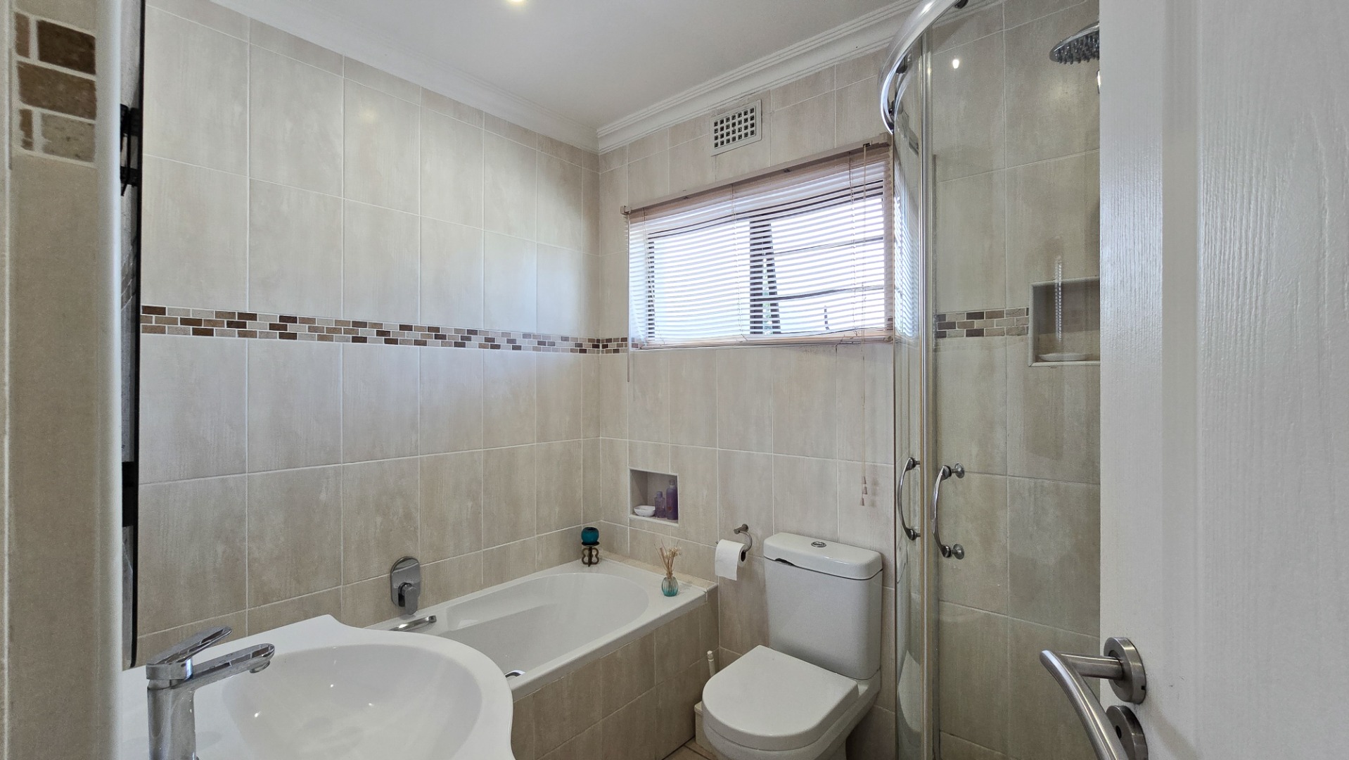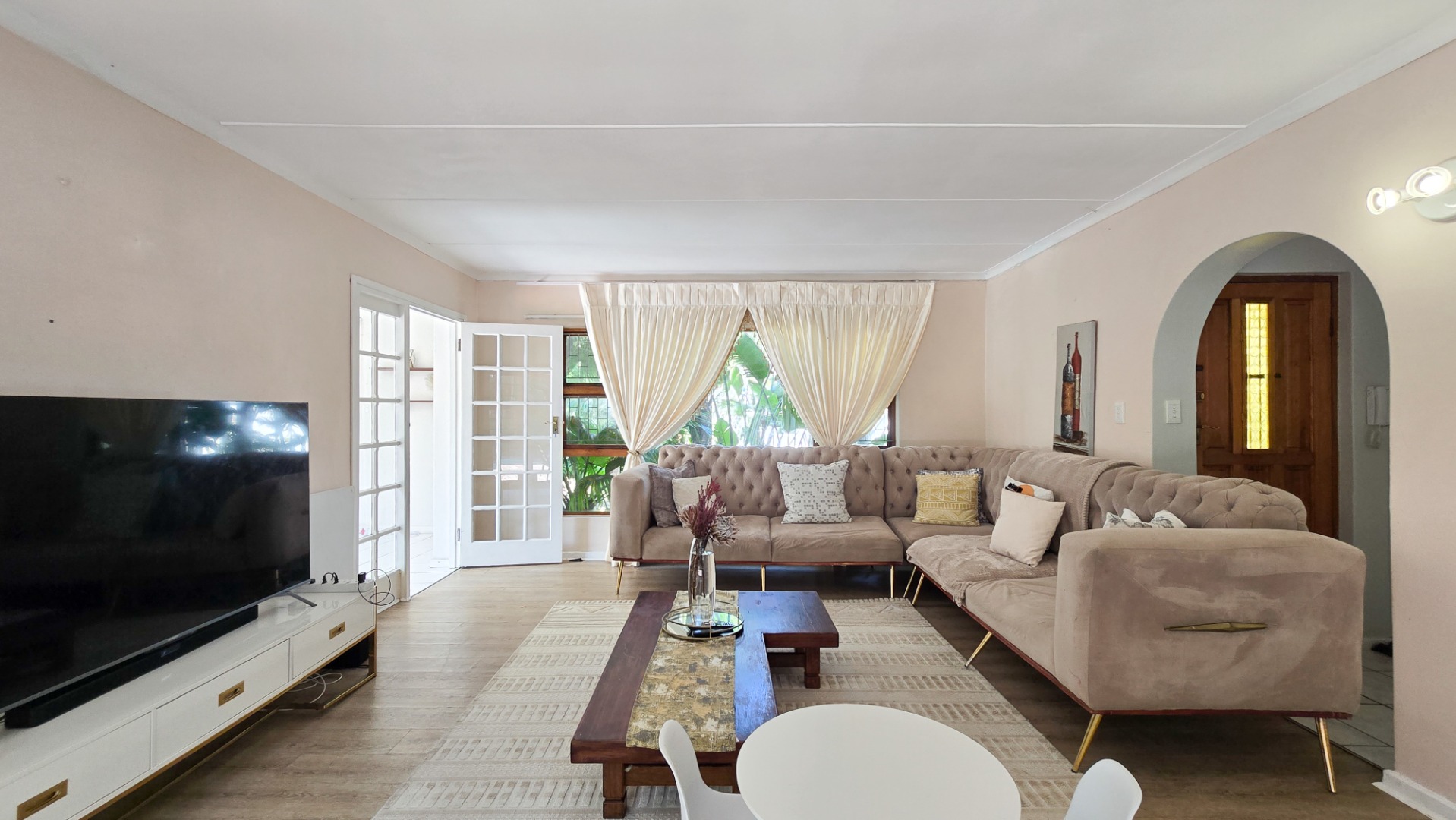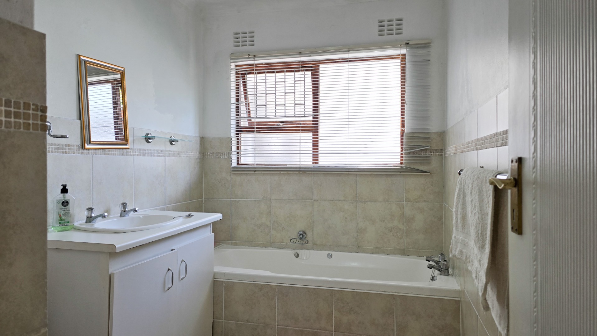 The main house surrounds a tropical braai/entertainment area and sparkling pool, and offers 4 Bedrooms (3 of which have sliding doors onto the swimming pool), 2 Bathrooms (main is en-suite), 2 lounges (one with stacking doors opening onto a terracotta tiled patio and the garden), a study, a dining room which is open to the kitchen (includes a scullery), double garage (automated) with direct access to the kitchen and additional Parking for 2 cars. The level front garden provides space for children to play and is fully walled.