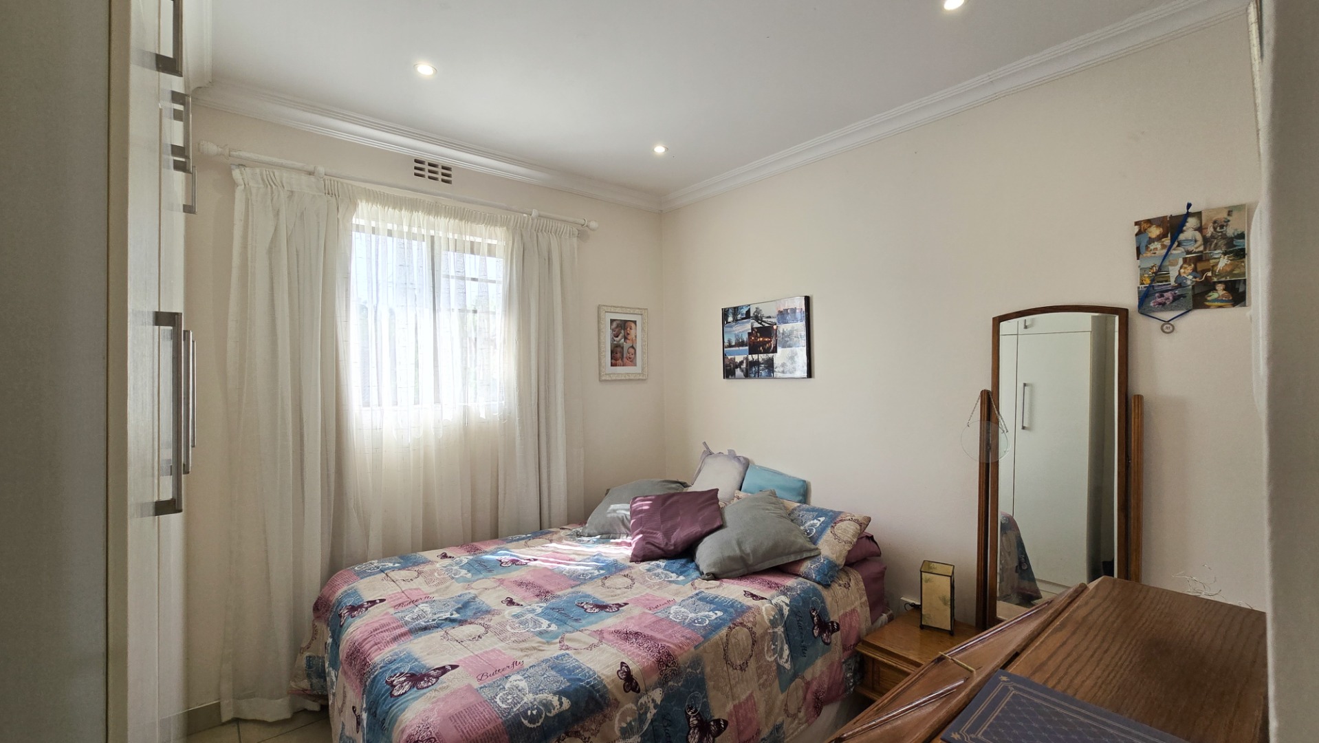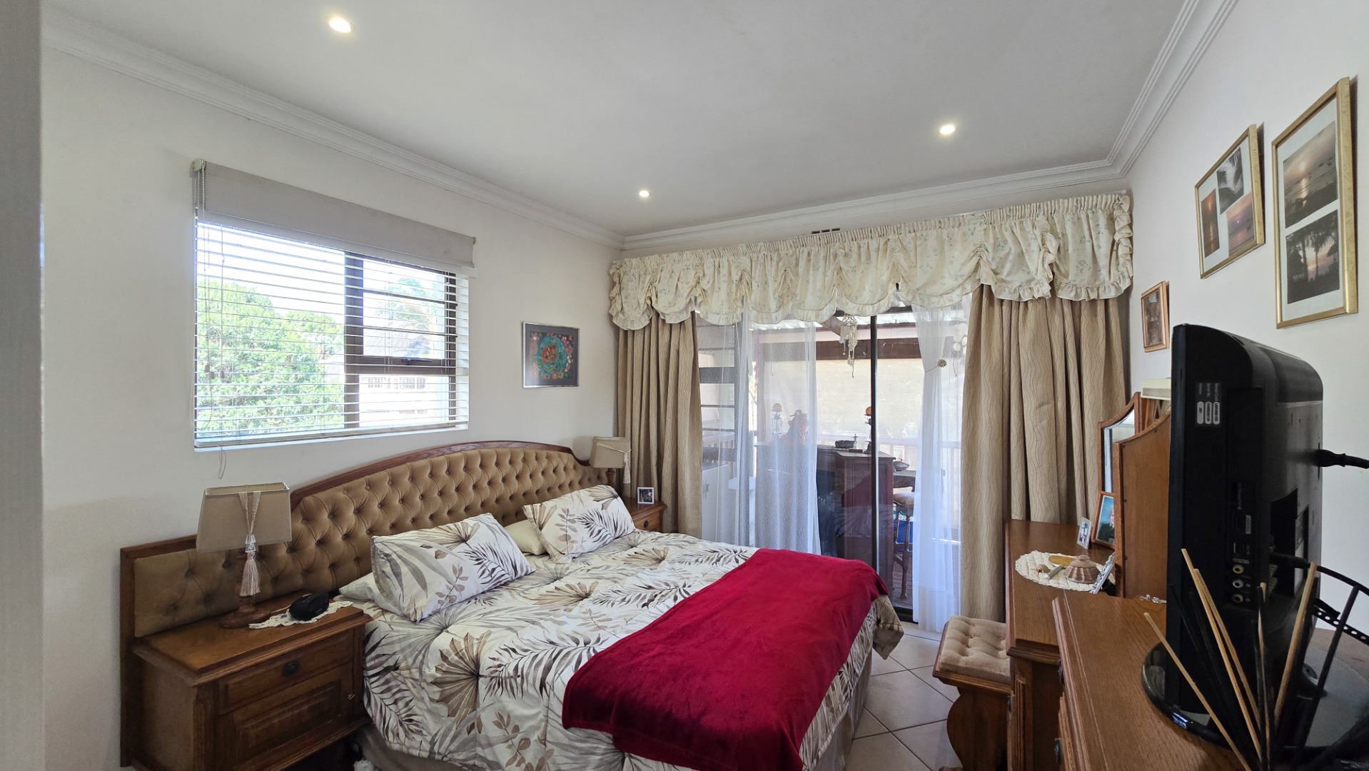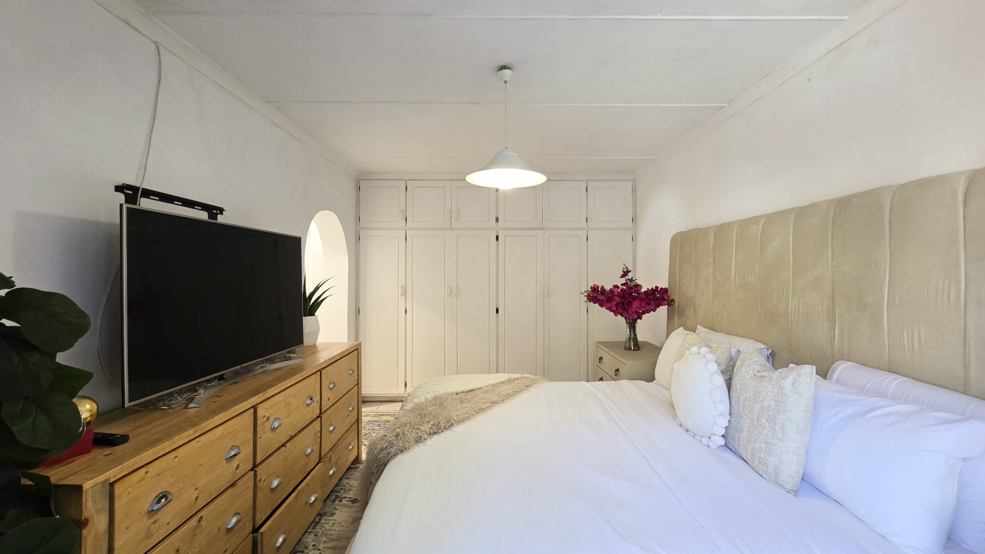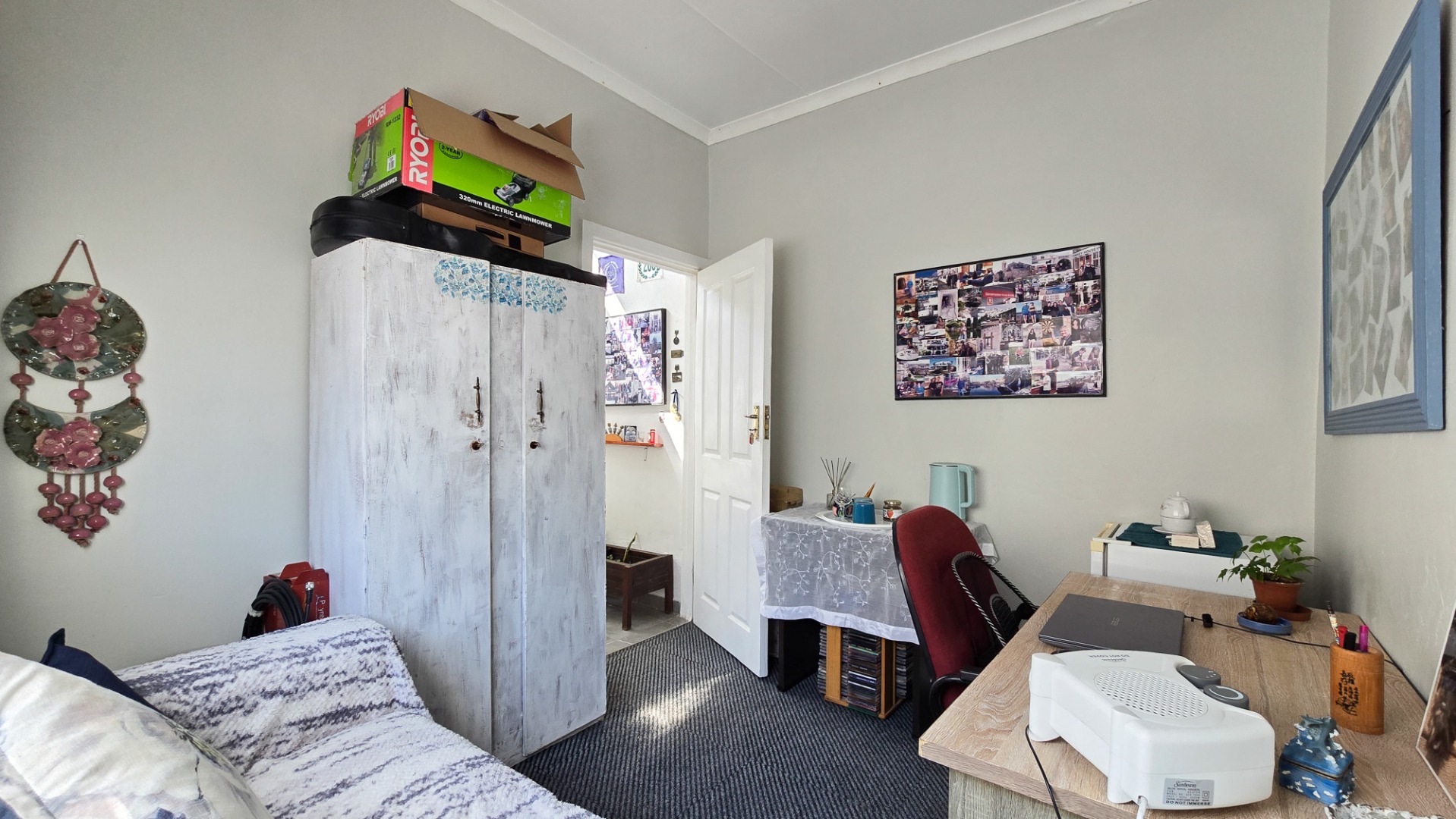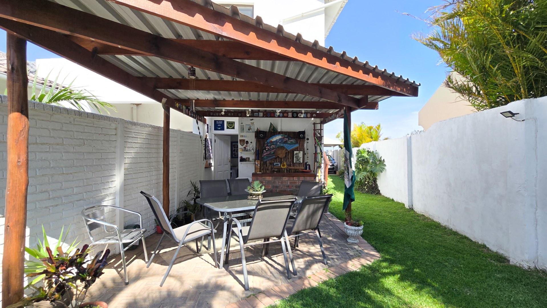 The main house surrounds a tropical braai/entertainment area and sparkling pool, and offers 4 Bedrooms (3 of which have sliding doors onto the swimming pool), 2 Bathrooms (main is en-suite), 2 lounges (one with stacking doors opening onto a terracotta tiled patio and the garden), a study, a dining room which is open to the kitchen (includes a scullery), double garage (automated) with direct access to the kitchen and additional Parking for 2 cars. The level front garden provides space for children to play and is fully walled.