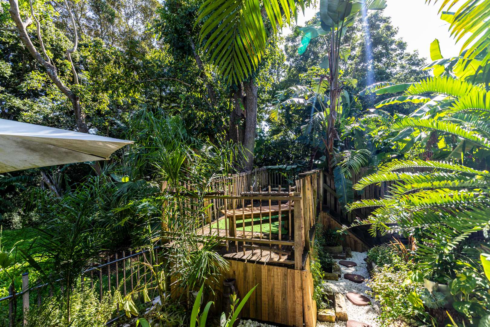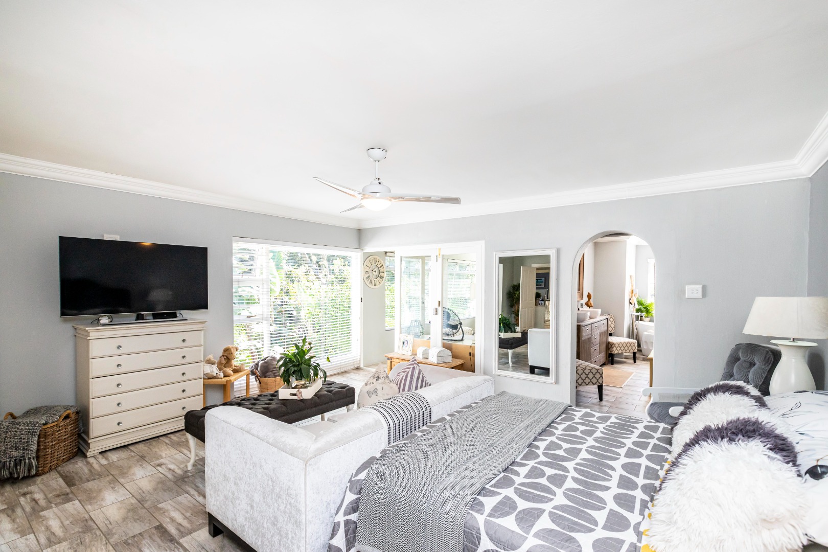The split level living , offers an open plan kitchen and scullery which flows into the a dining area and then onto a sunken lounge and covered patio with built-in braai and a flowing pool. Wrapped around the outdoor living area is abundance of trees and a beautiful garden and birdlife that puts “ Faansie’s Bird Book” to shame.