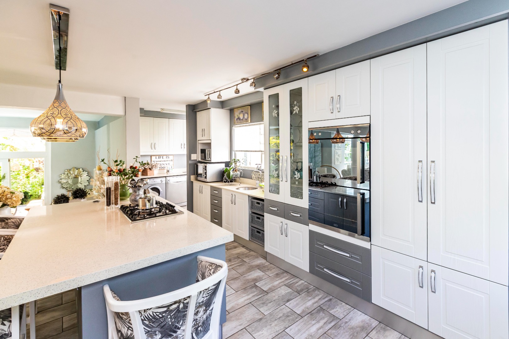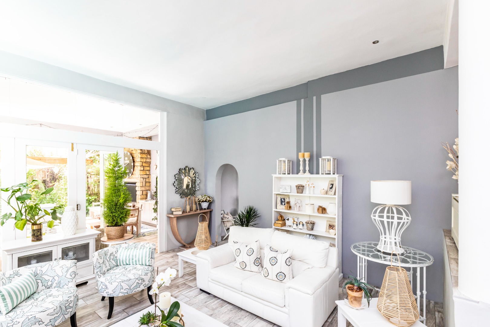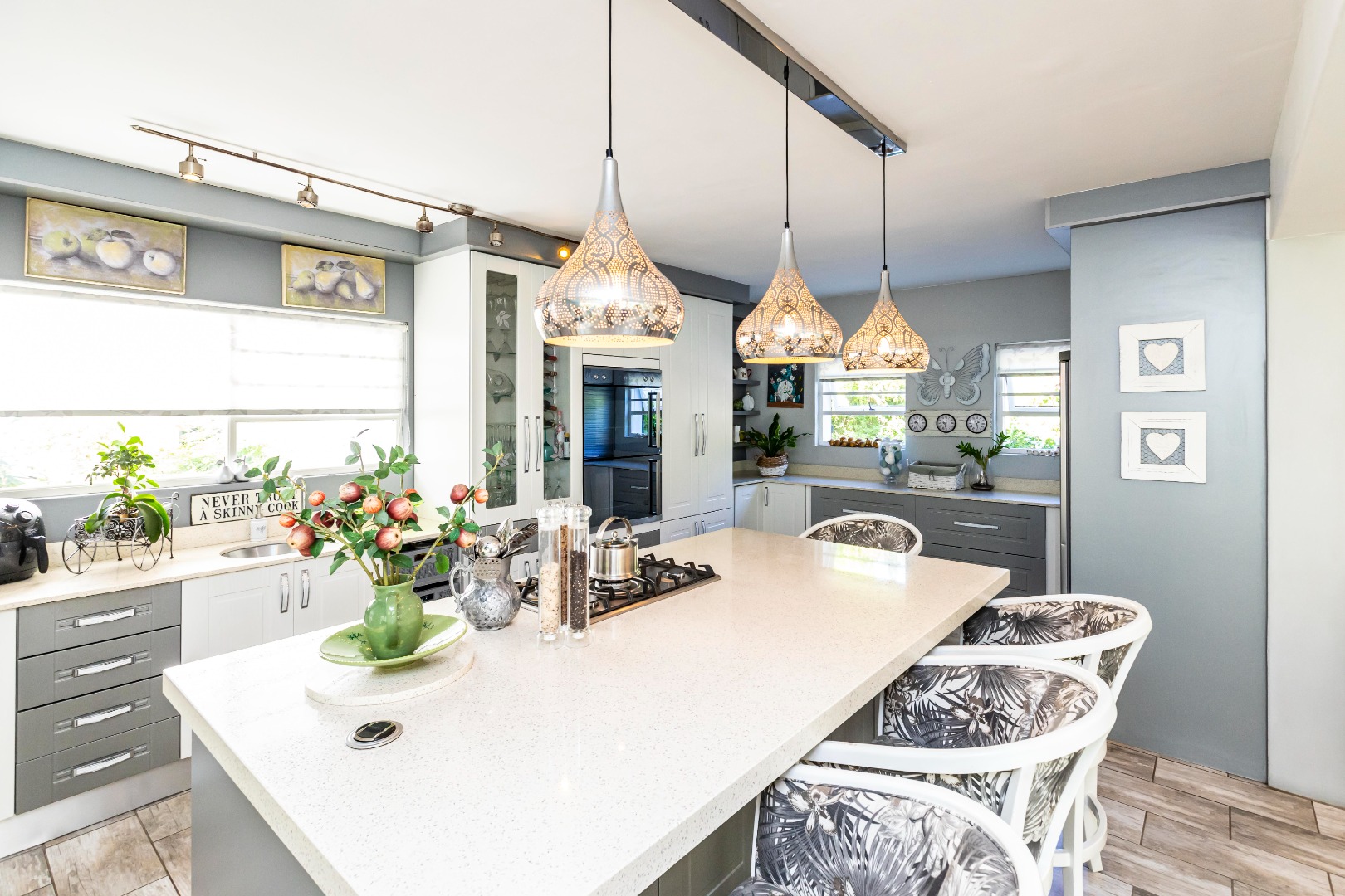 The original concrete form of design with a flat concrete roof has been modernized with stylish roof sheeting and FC board façade, reducing maintenance and offering weather resistance to the building at the same time. Refurbishment done, included new floor tiles throughout the house, a gourmet fitted kitchen, blinds and shutters on all the exterior doors and windows, newly installed cupboards and much much more. A true make over.