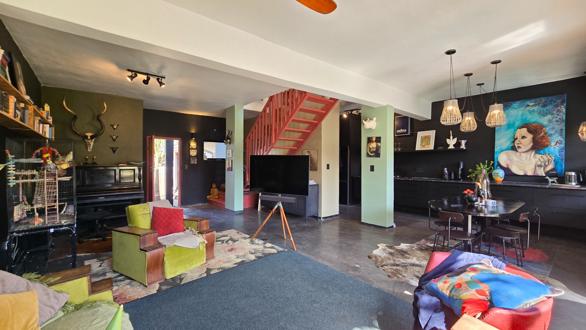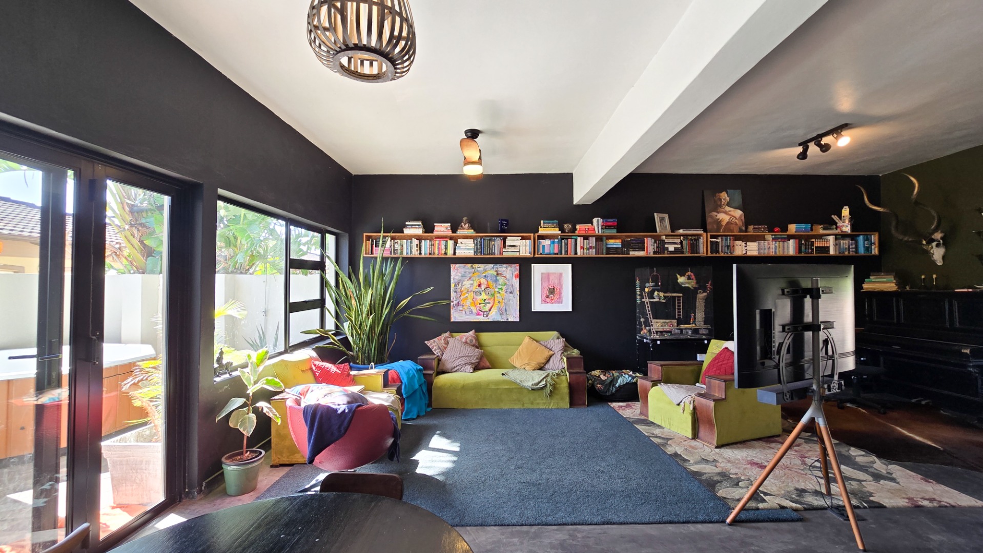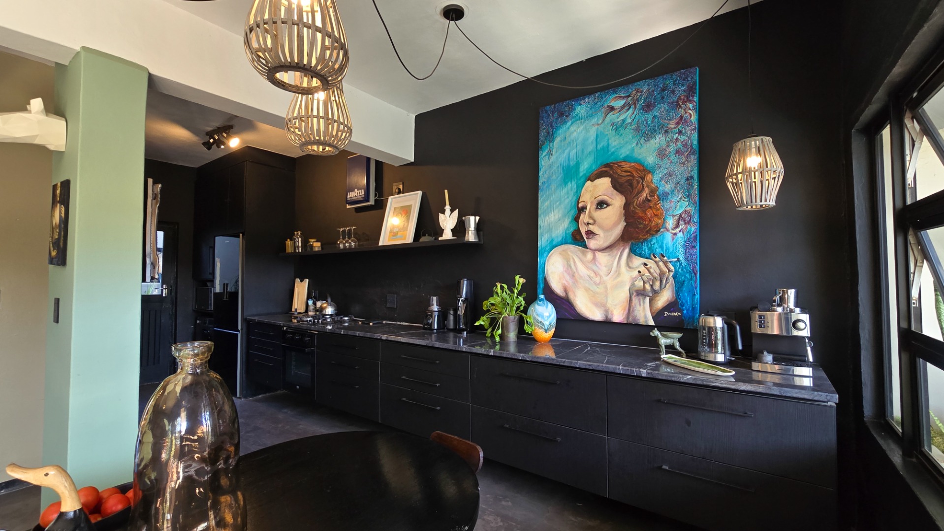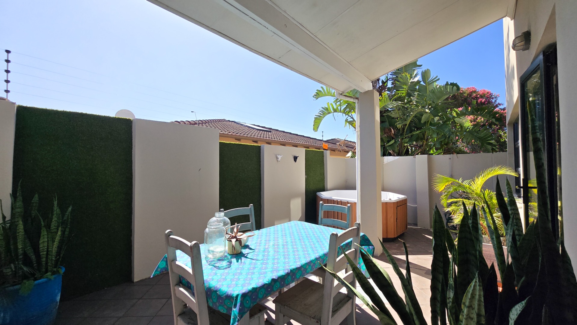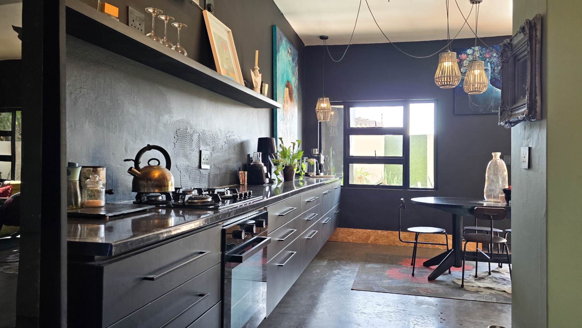 Downstairs, polished concrete floors and a dramatic colour palette set the tone for sophisticated open-plan living. The lounge, dining, and kitchen areas flow seamlessly together, opening onto a private patio with built-in braai and jacuzzi — ideal for entertaining or relaxed evenings after a day at the beach.