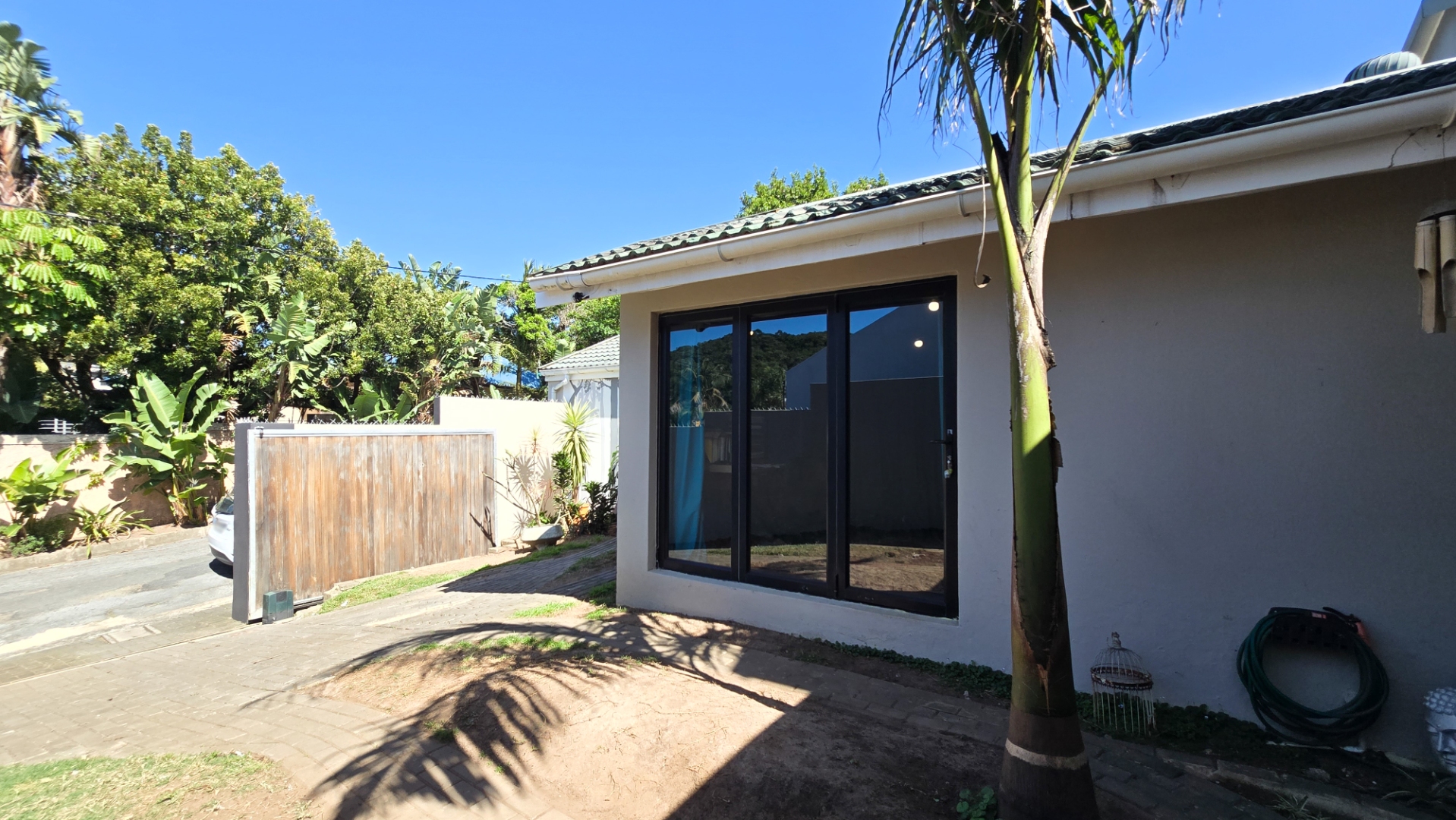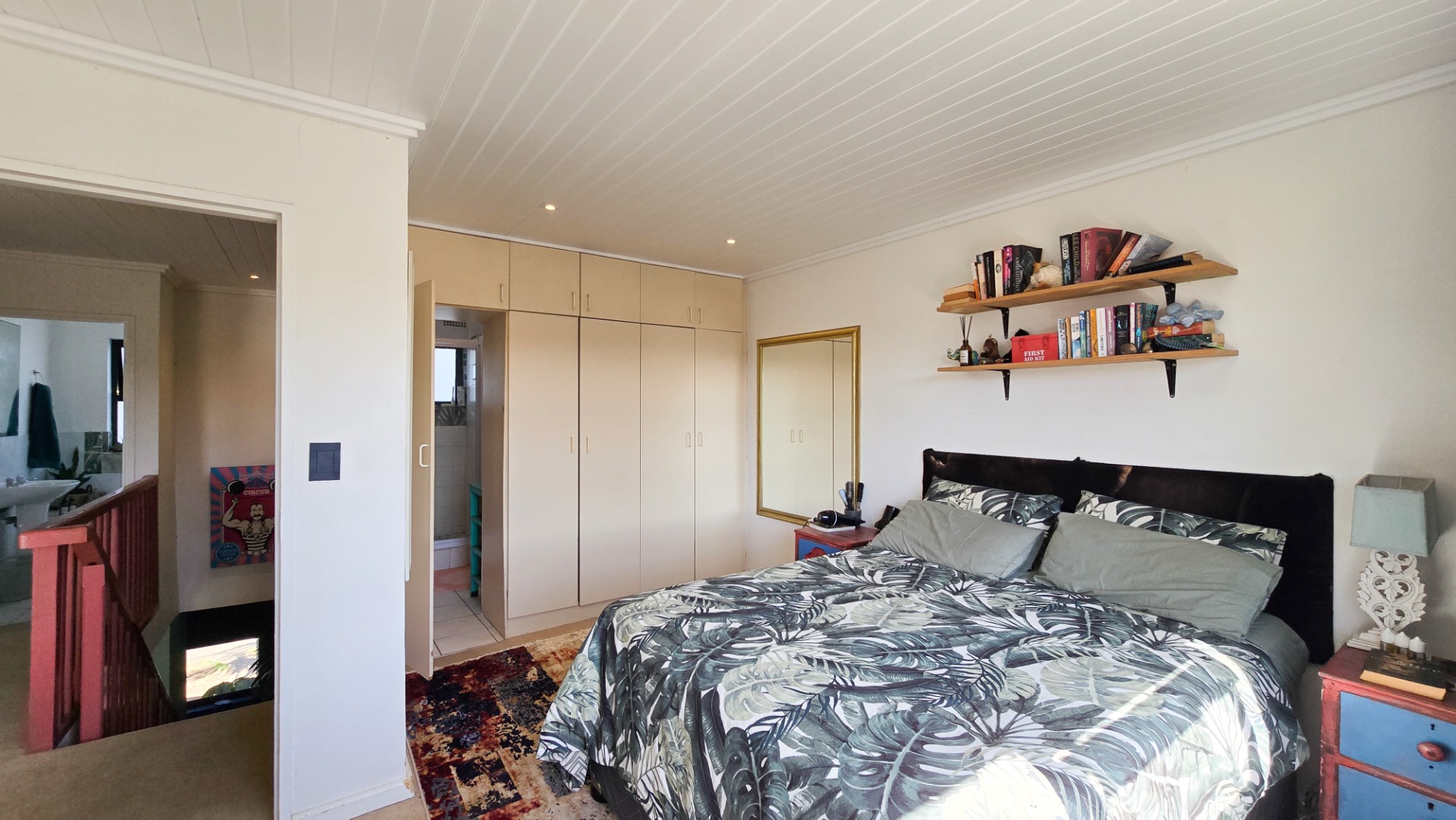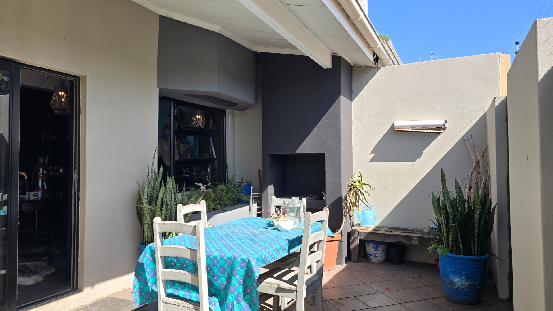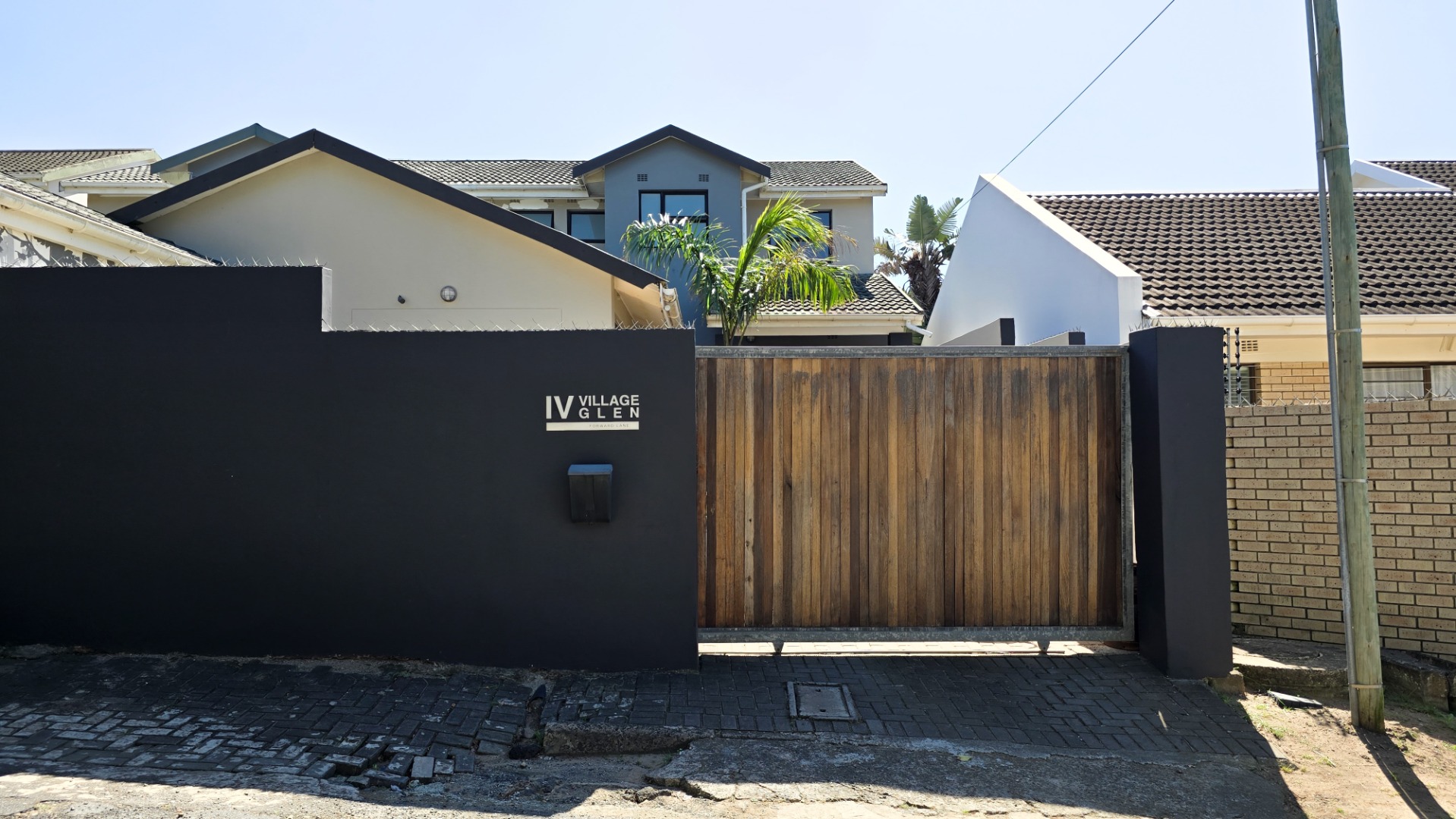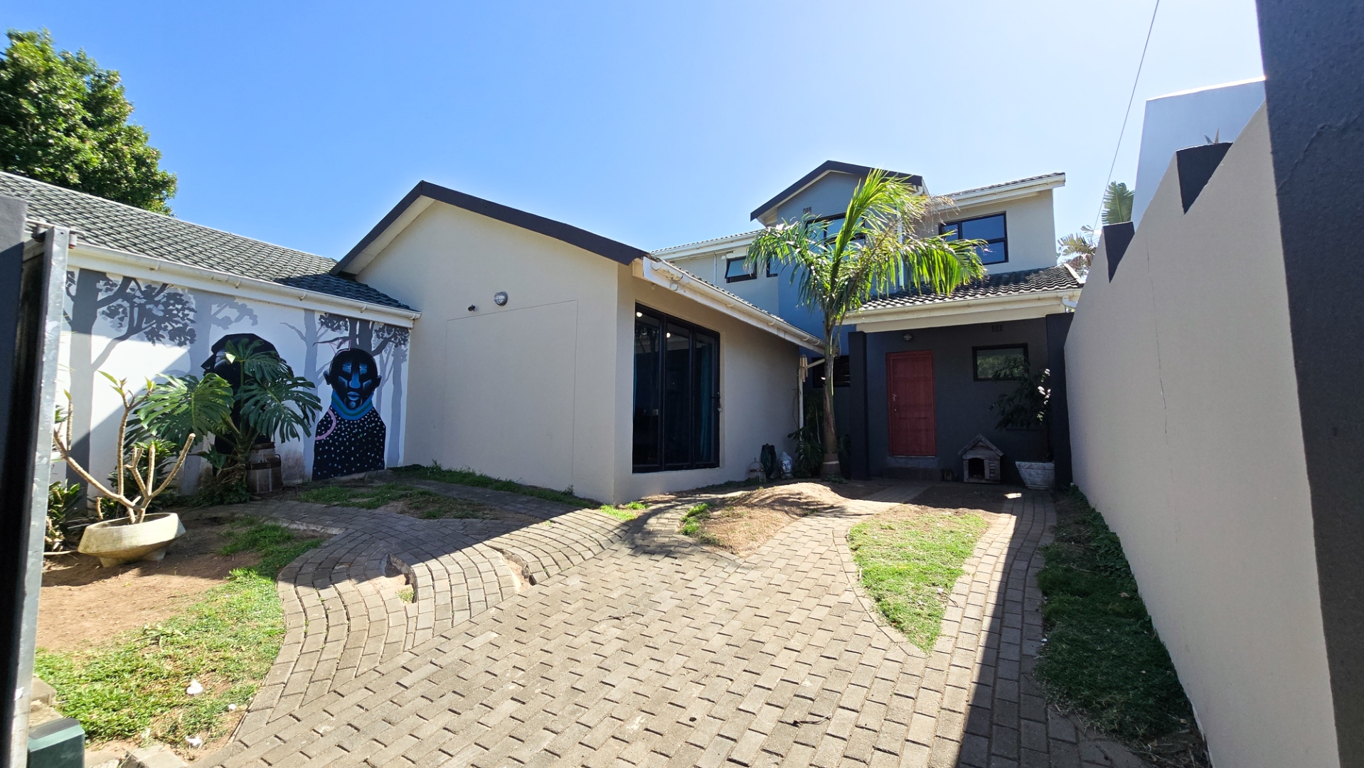 Downstairs, polished concrete floors and a dramatic colour palette set the tone for sophisticated open-plan living. The lounge, dining, and kitchen areas flow seamlessly together, opening onto a private patio with built-in braai and jacuzzi — ideal for entertaining or relaxed evenings after a day at the beach.