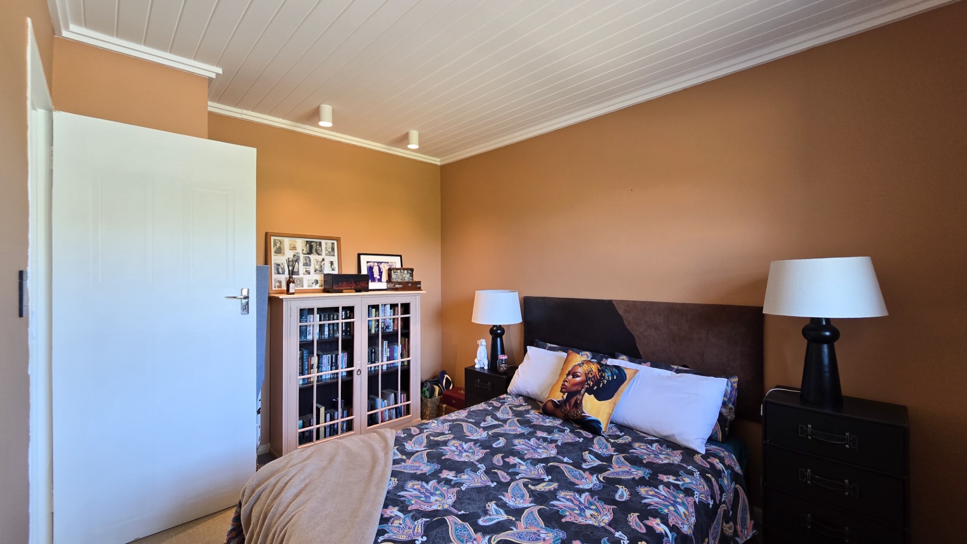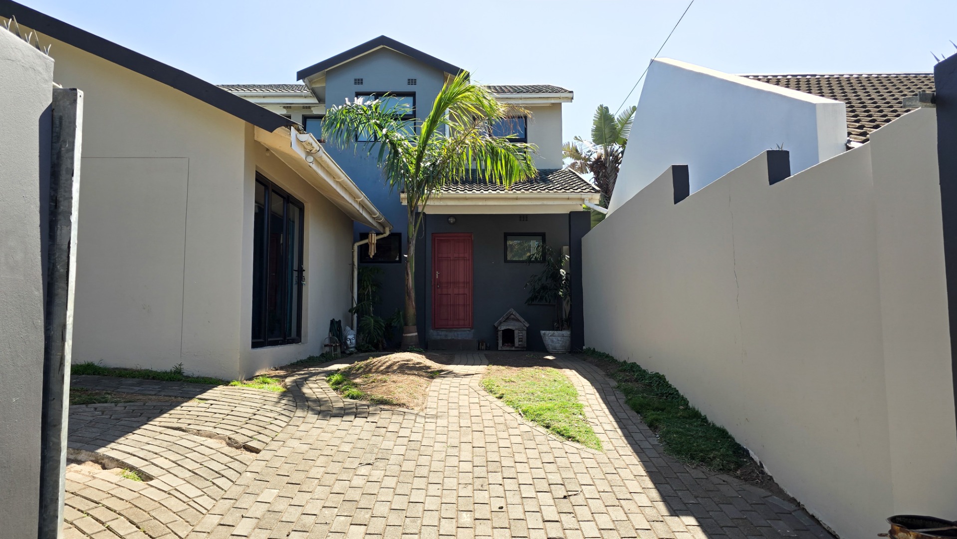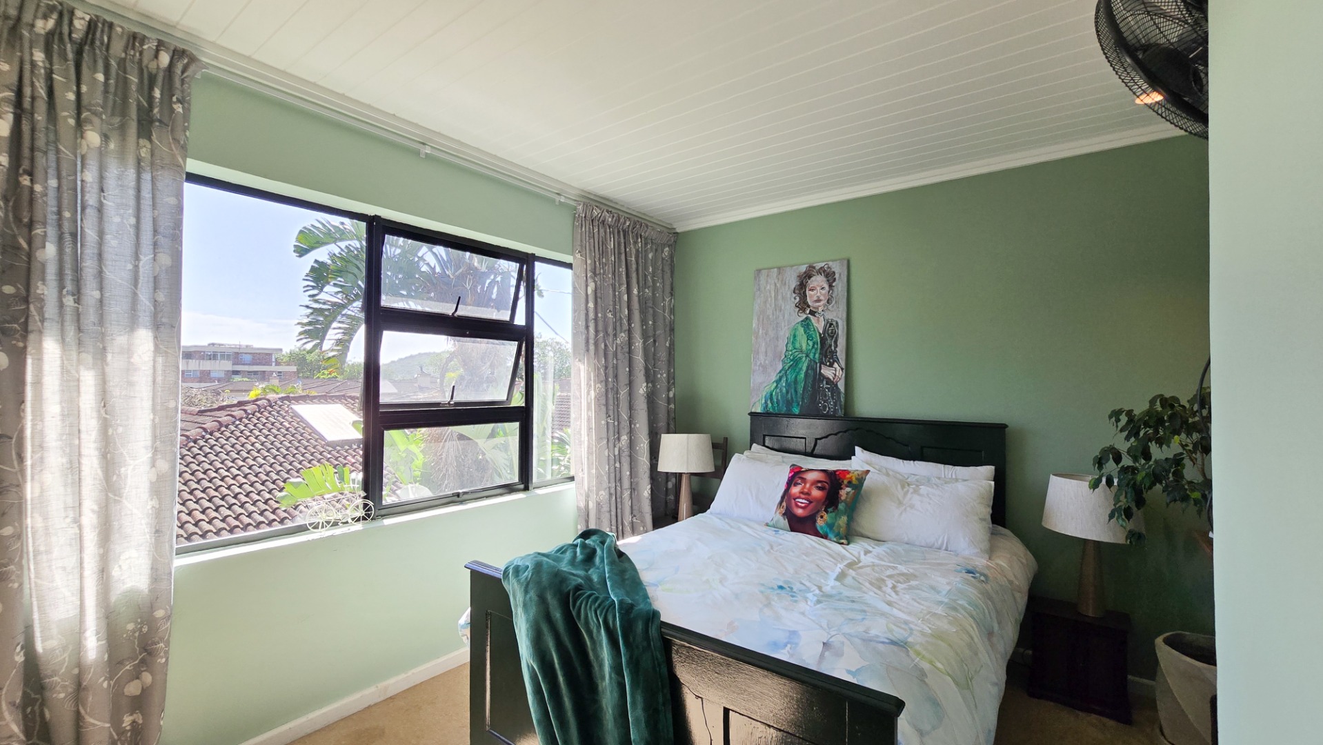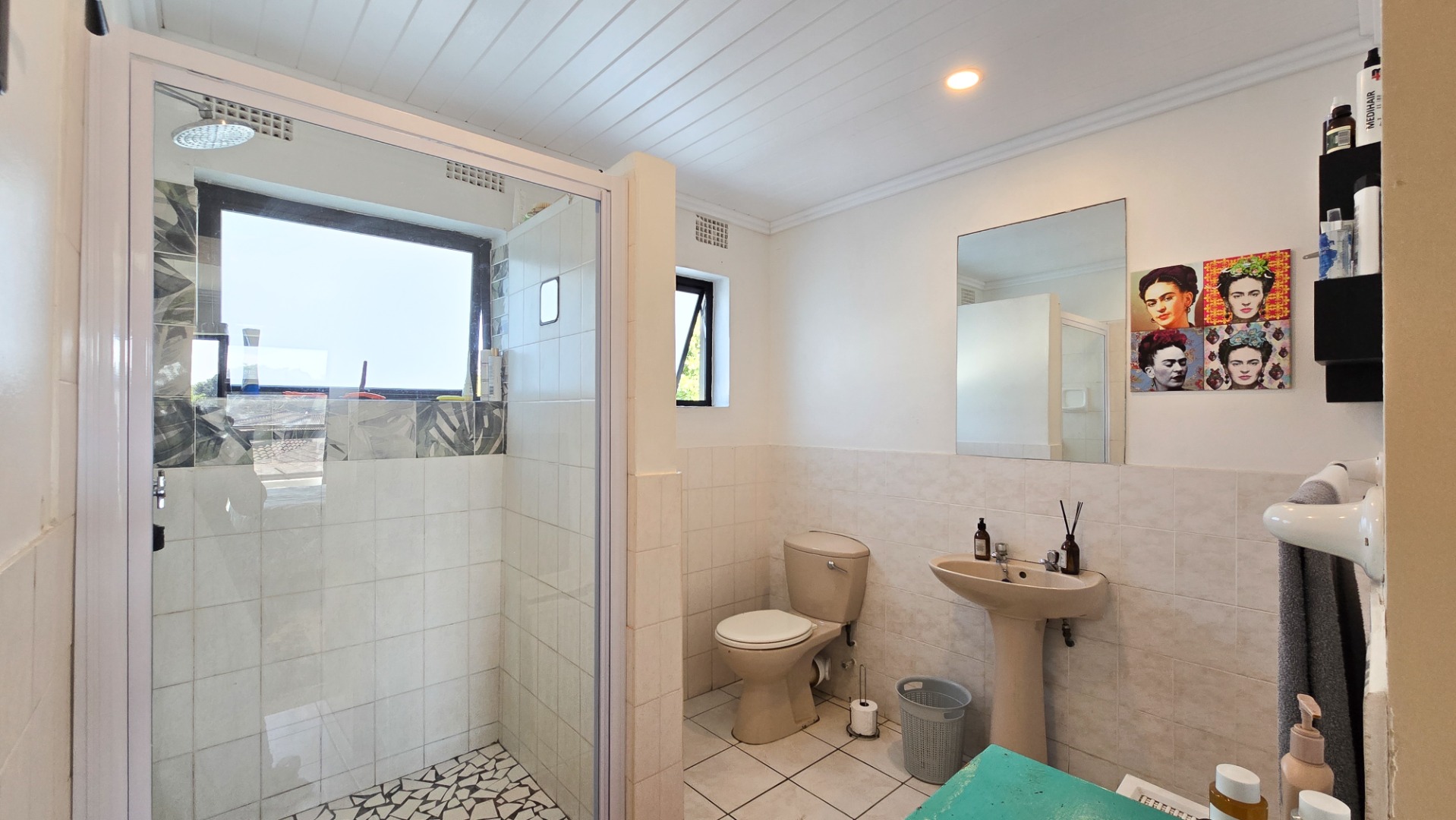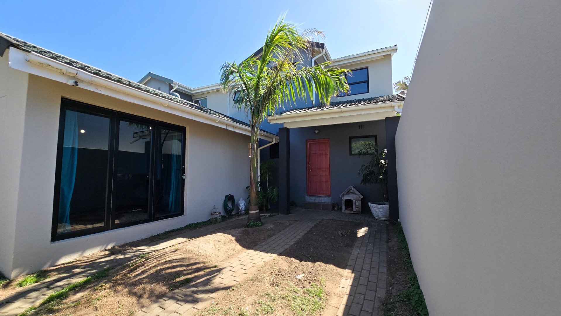 Downstairs, polished concrete floors and a dramatic colour palette set the tone for sophisticated open-plan living. The lounge, dining, and kitchen areas flow seamlessly together, opening onto a private patio with built-in braai and jacuzzi — ideal for entertaining or relaxed evenings after a day at the beach.