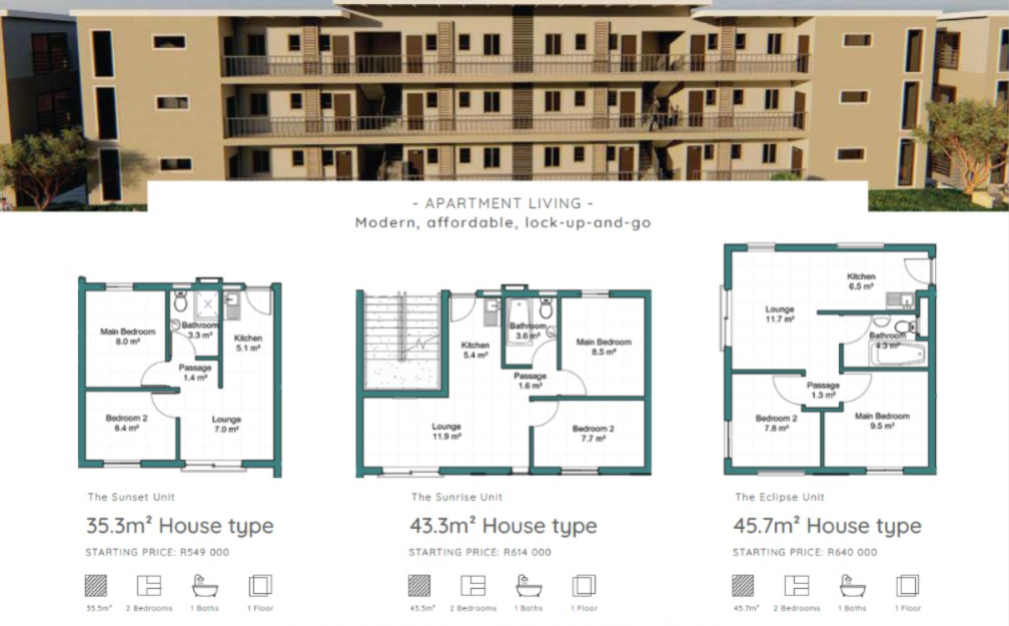 - The Sunset Unit: 35.3sqm - 2 Bedrooms, bathroom, kitchen, lounge - R549 000