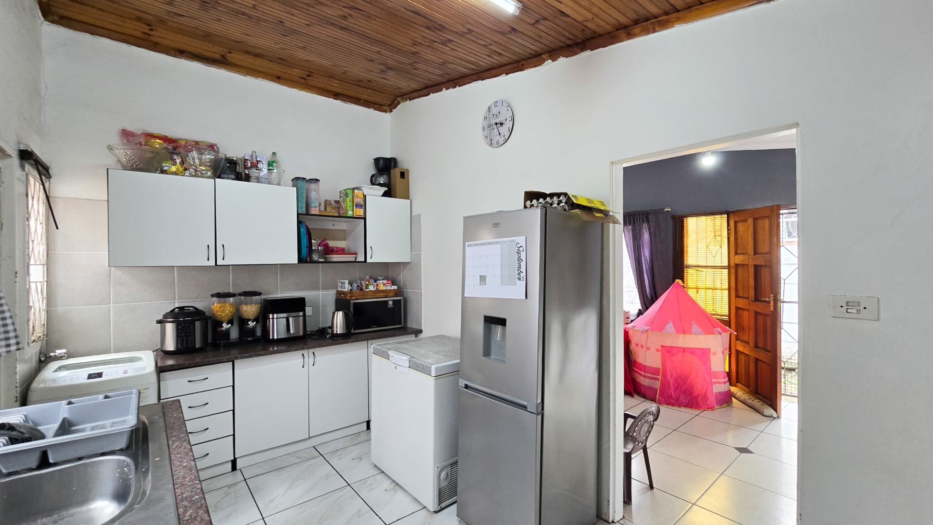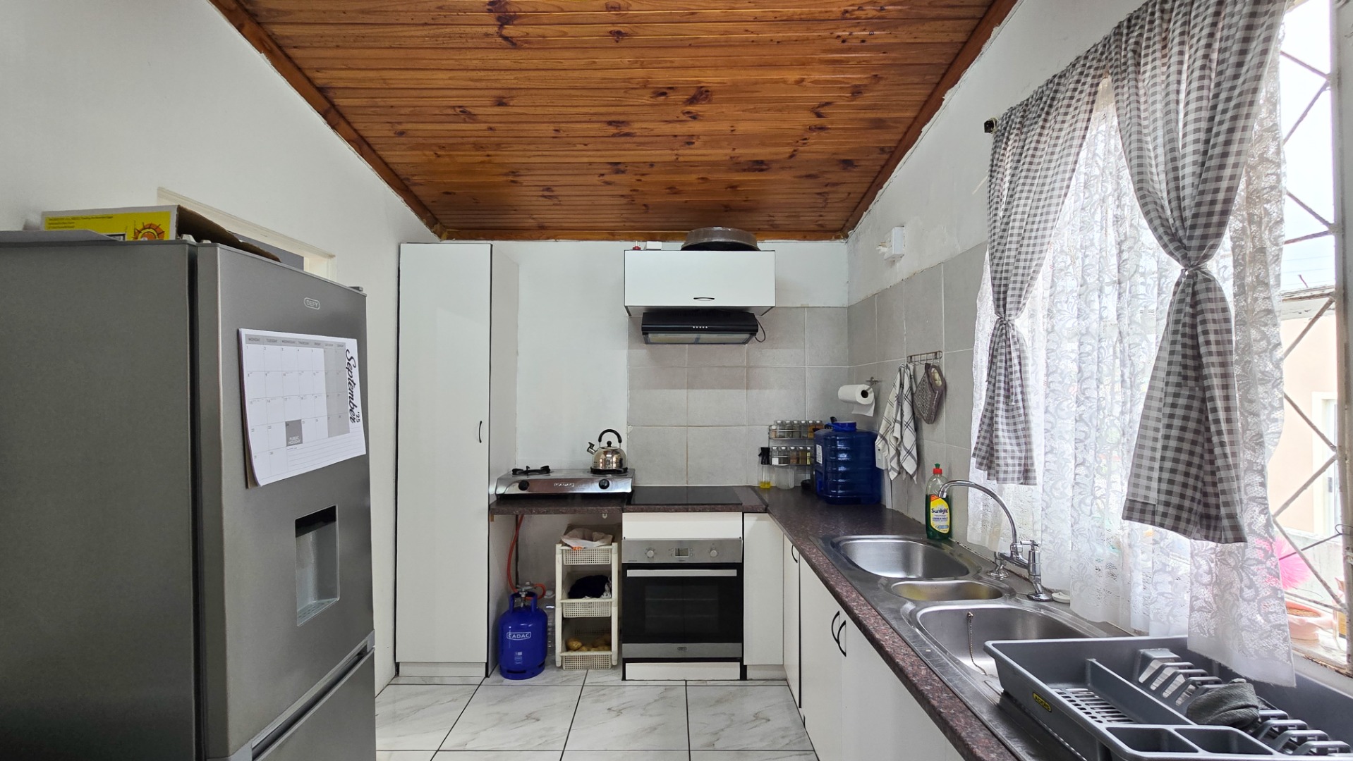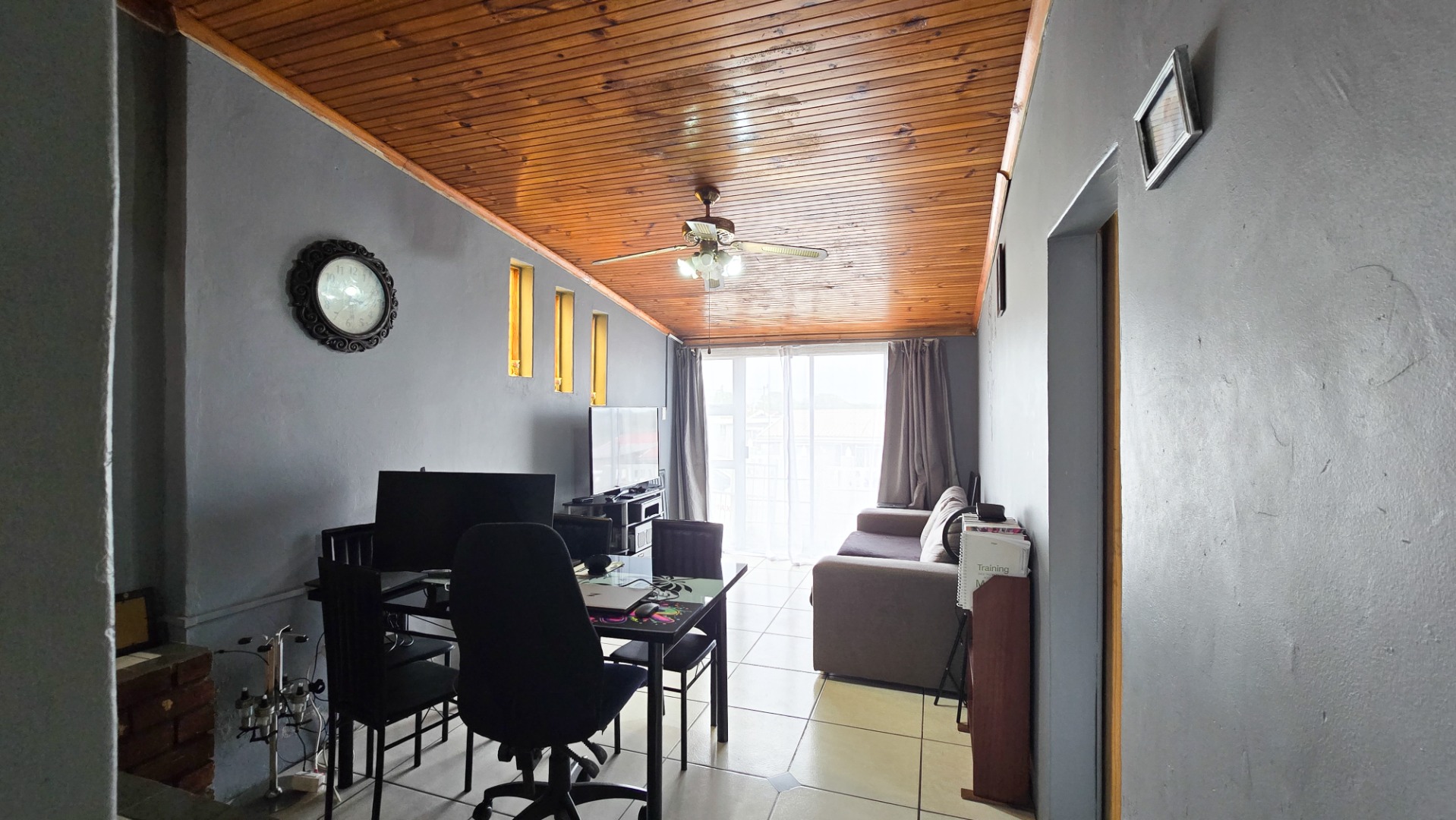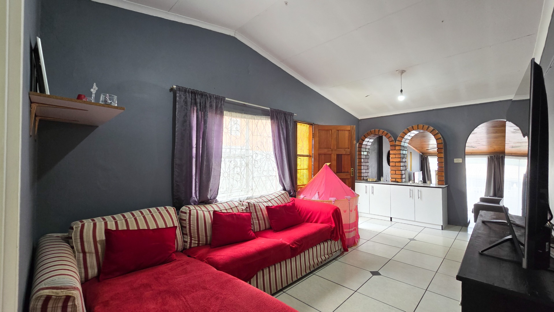 Step inside to a tiled lounge and dining area, filled with natural light through aluminium-framed windows, complemented by ceiling fans for added comfort. The kitchen is neatly finished with tiled floors and built-in cupboards.