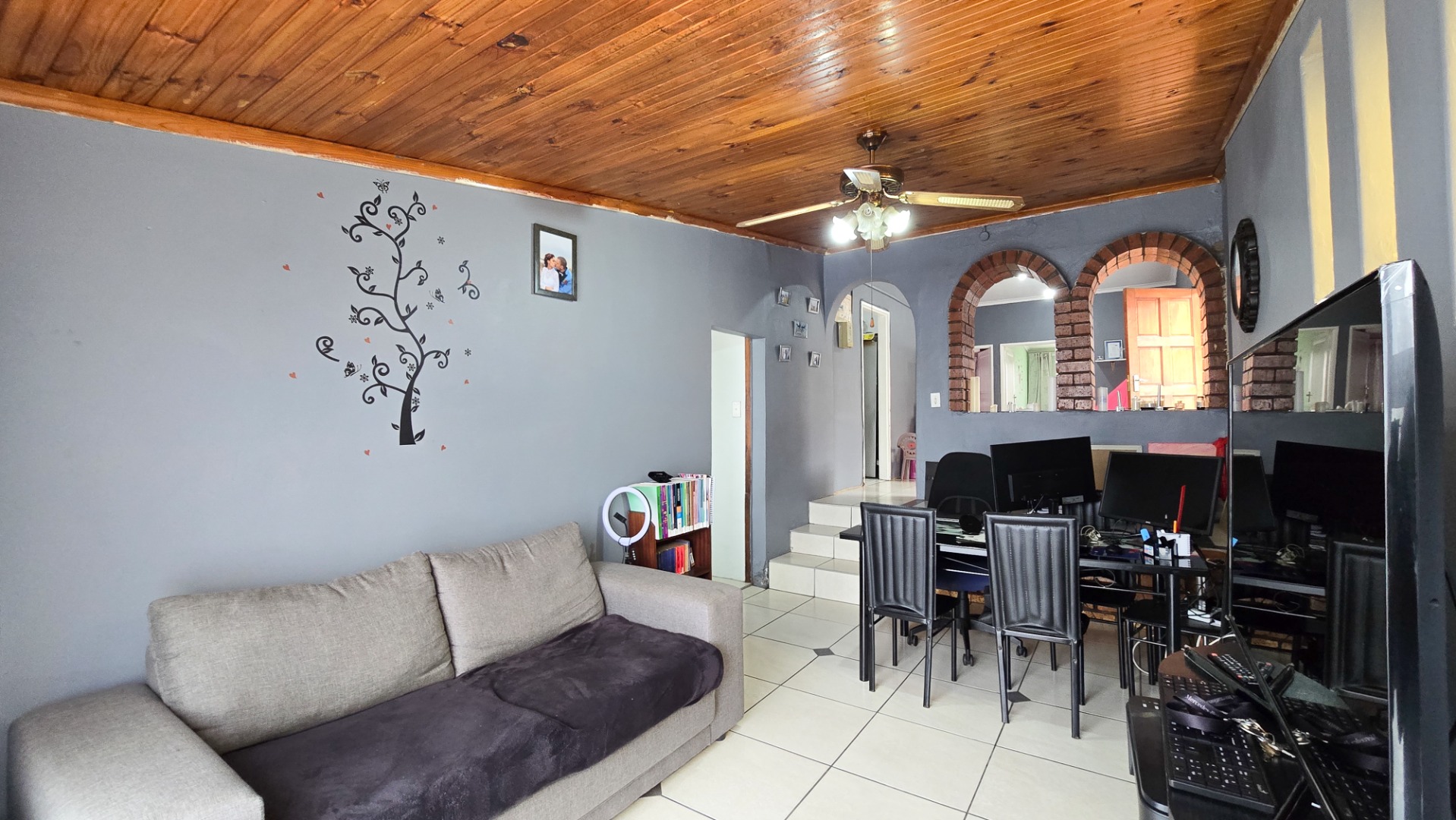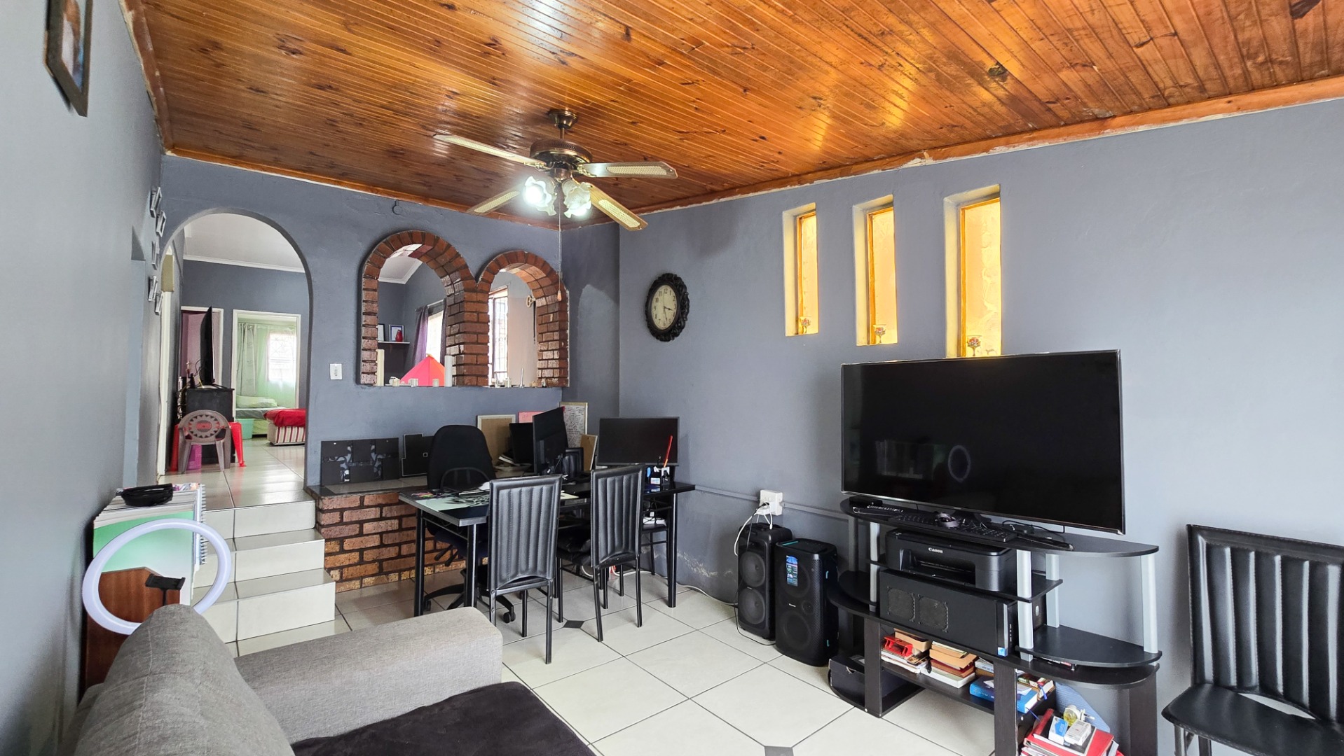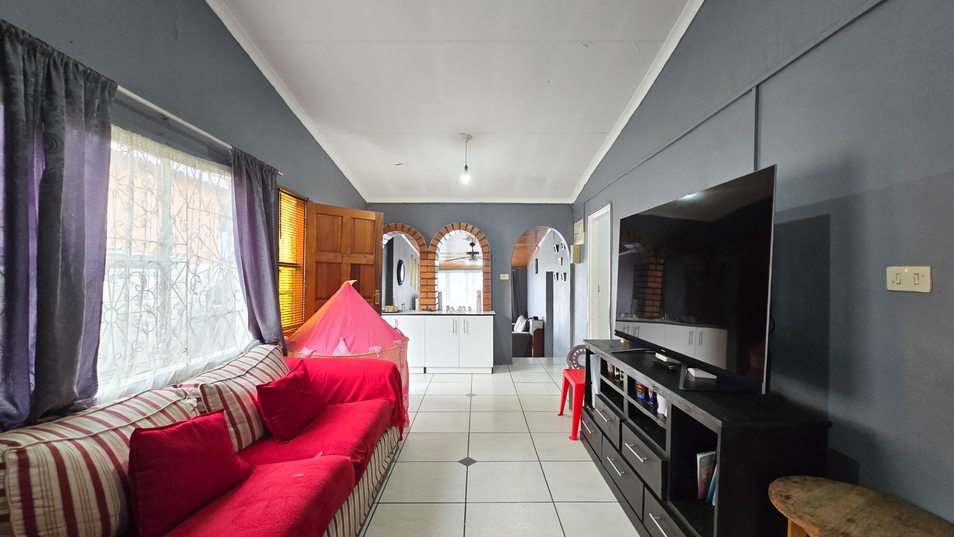 Step inside to a tiled lounge and dining area, filled with natural light through aluminium-framed windows, complemented by ceiling fans for added comfort. The kitchen is neatly finished with tiled floors and built-in cupboards.