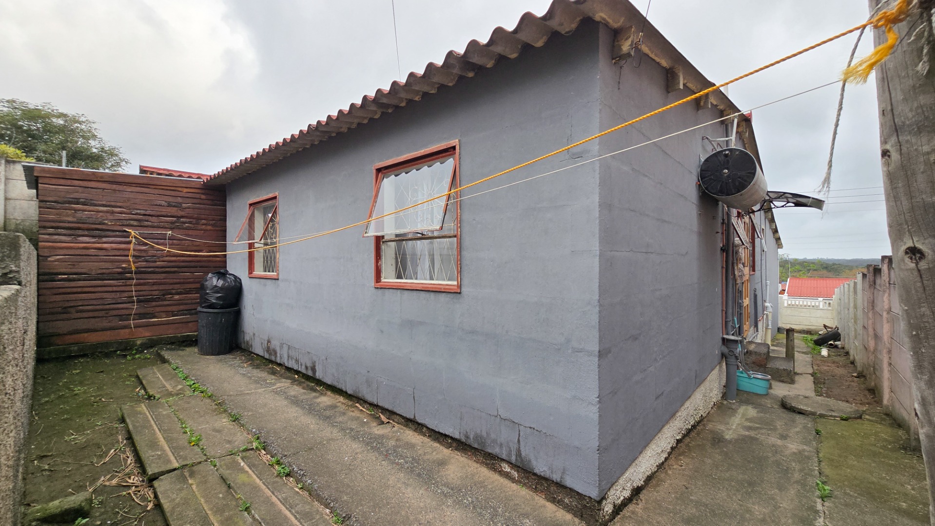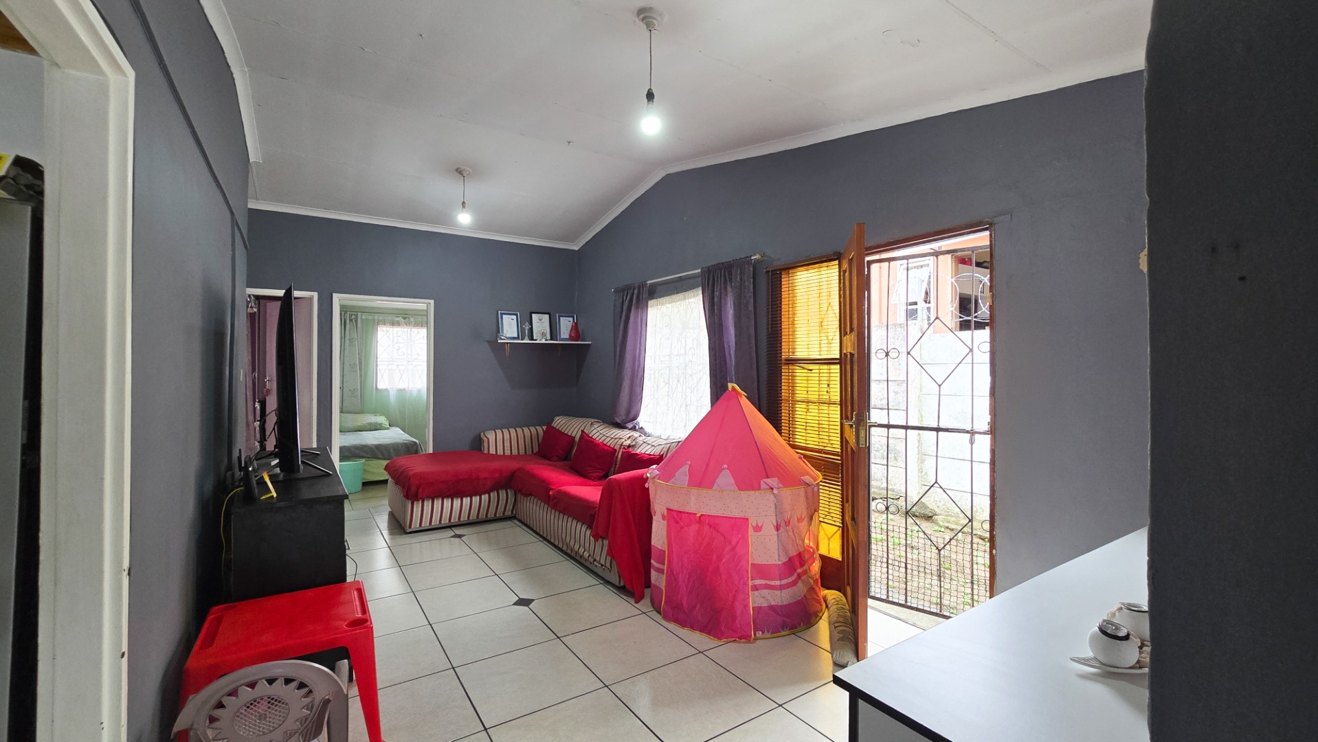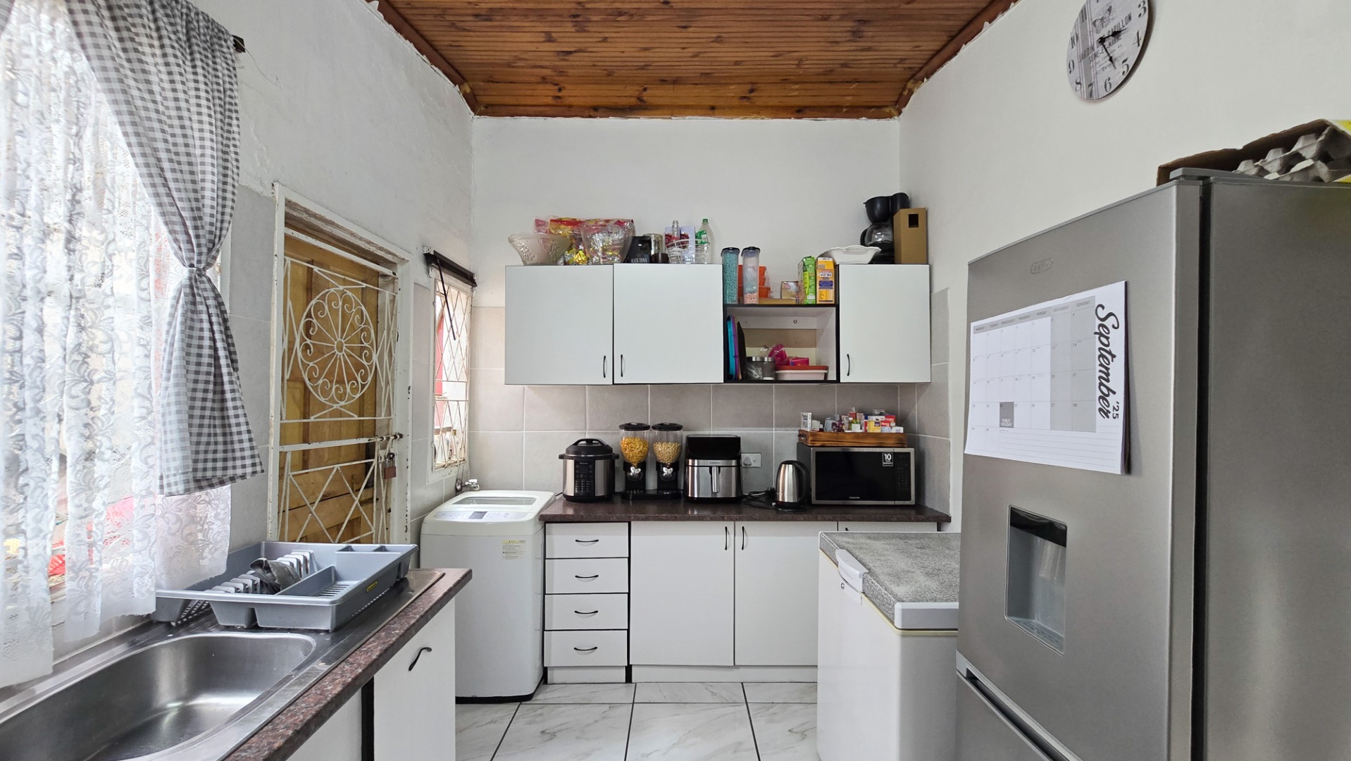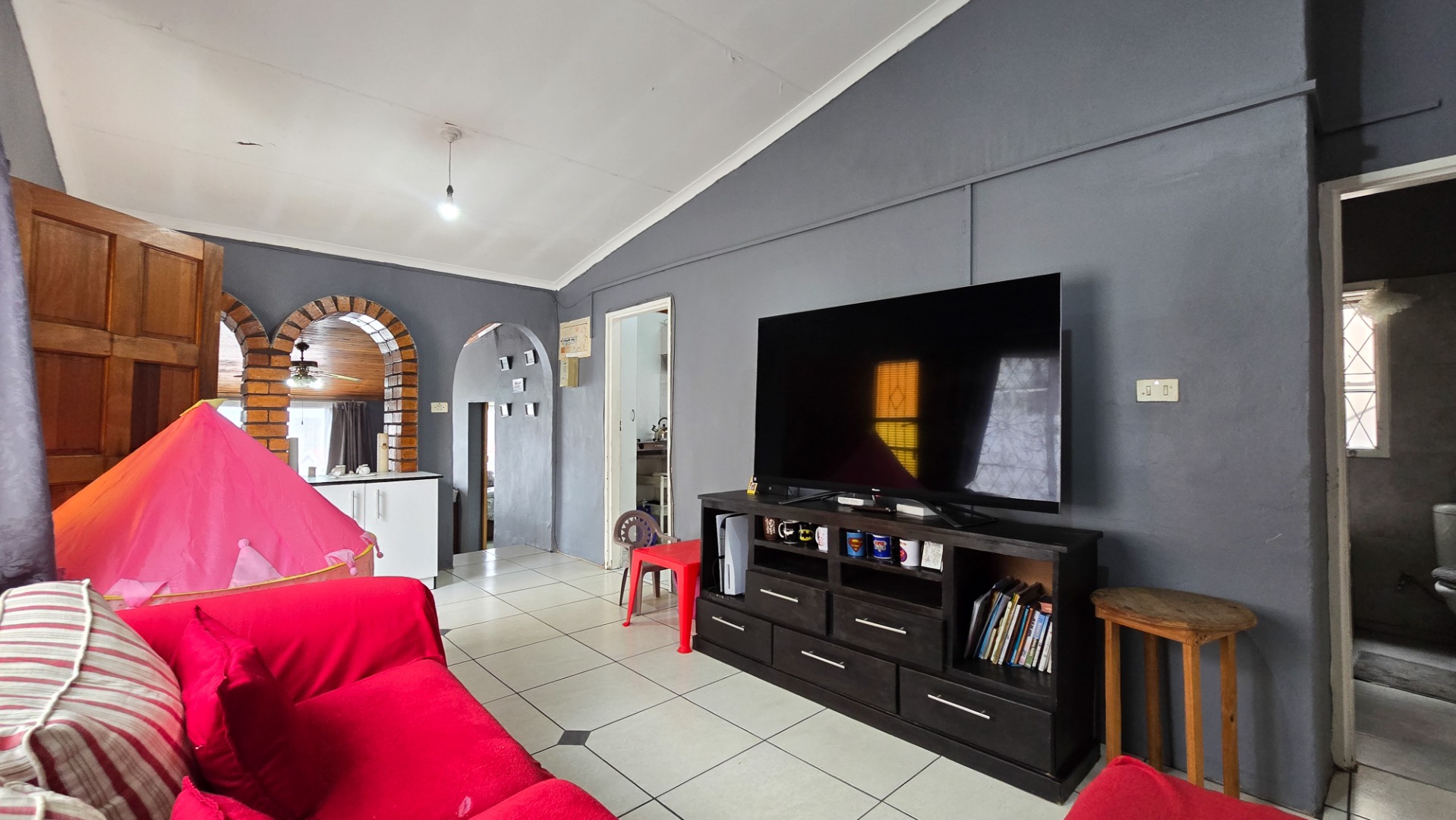Step inside to a tiled lounge and dining area, filled with natural light through aluminium-framed windows, complemented by ceiling fans for added comfort. The kitchen is neatly finished with tiled floors and built-in cupboards.