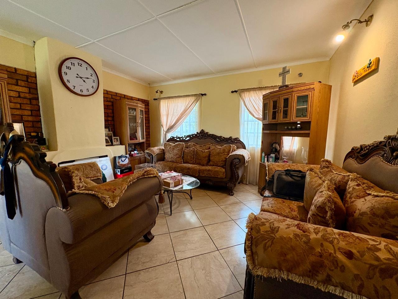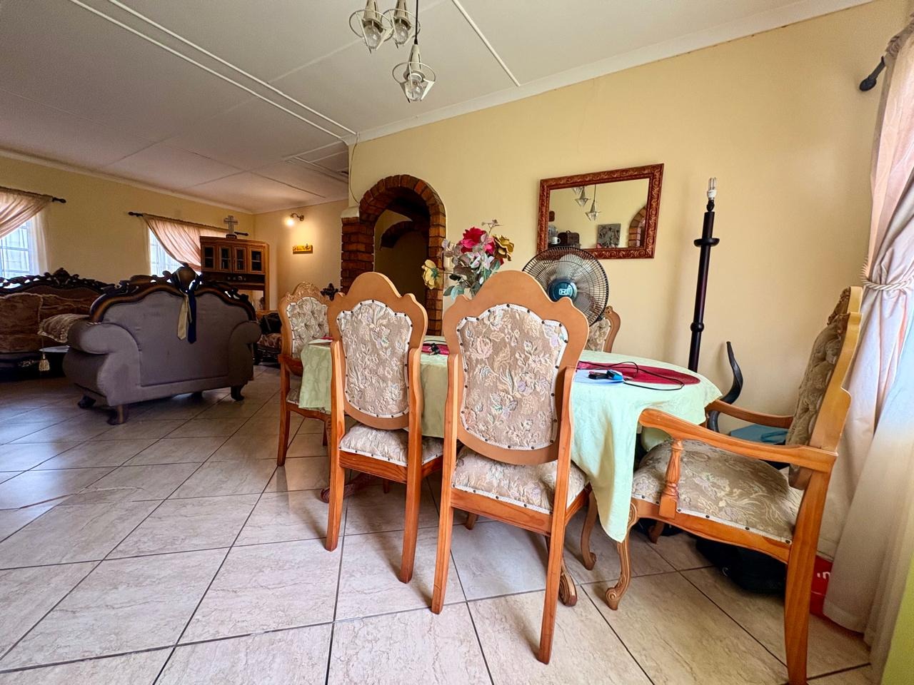 Step inside to find a thoughtfully designed interior featuring two spacious lounges and a dedicated dining room, all adorned with practical tiled flooring for easy maintenance. Abundant natural light streams through multiple windows and large sliding doors, creating a bright and airy atmosphere. Unique exposed brickwork and decorative archways add character, while a built-in bar and braai room provide ideal spaces for entertaining. The functional kitchen boasts ample storage solutions, catering to all culinary needs.