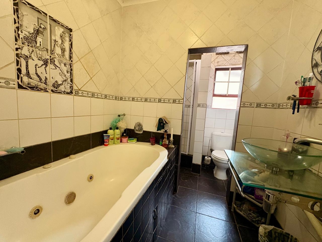 Outdoor living is enhanced by a raised patio, perfect for relaxation or al fresco dining, overlooking a private garden area. Practical paving surrounds the home, leading to a single garage and additional parking, including a covered carport. The property also benefits from staff quarters and is pet-friendly. For peace of mind, the home is totally walled, featuring burglar bars and a security gate, contributing to a safe and secure environment.