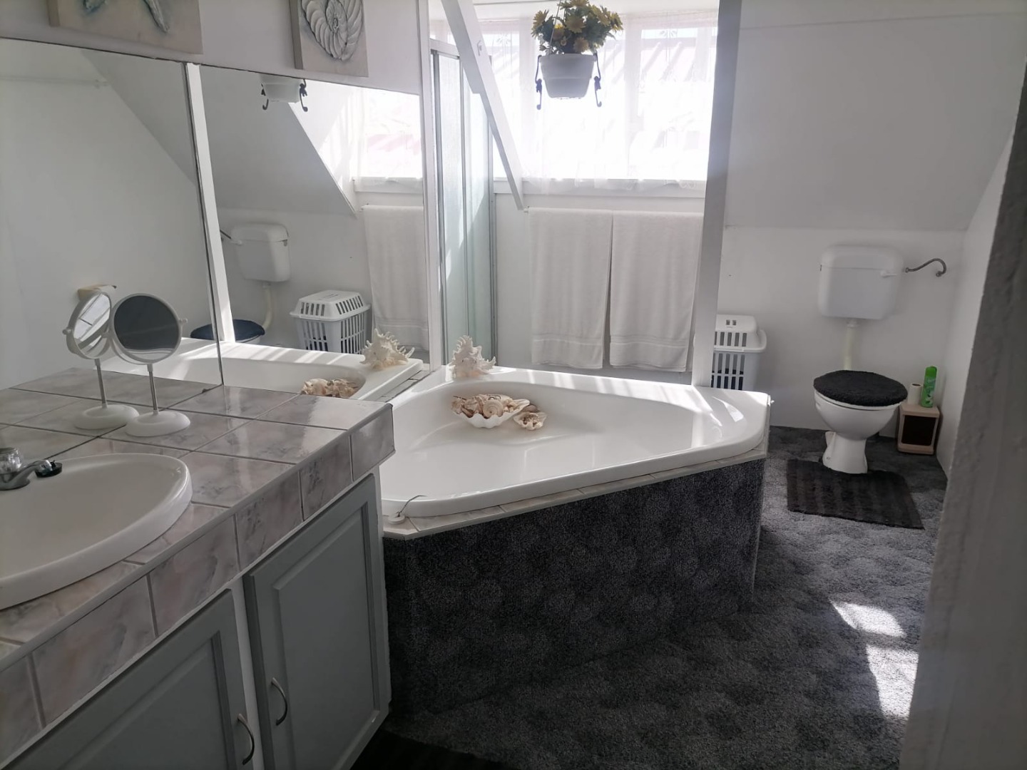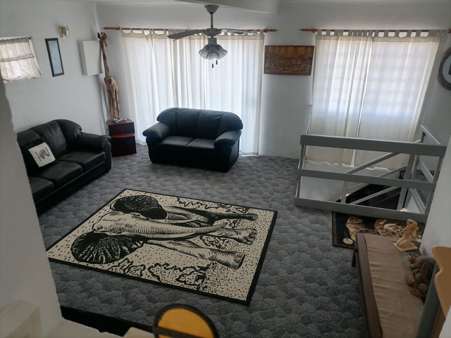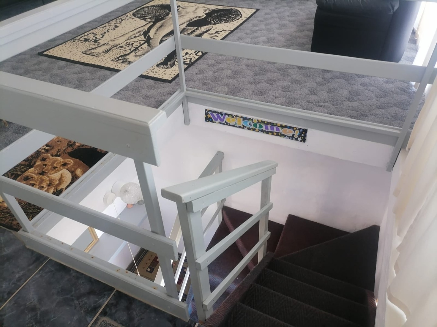 Discover this distinctive multi-level residence in Christmas Rock, East London, offering a unique architectural presence. The home features an eye-catching A-frame roof design with charming brick accents and a stucco exterior. An integrated garage ensures secure parking, while the property benefits from a totally walled perimeter and an access gate, enhancing privacy and security. The exterior presents a solid foundation for a family home.