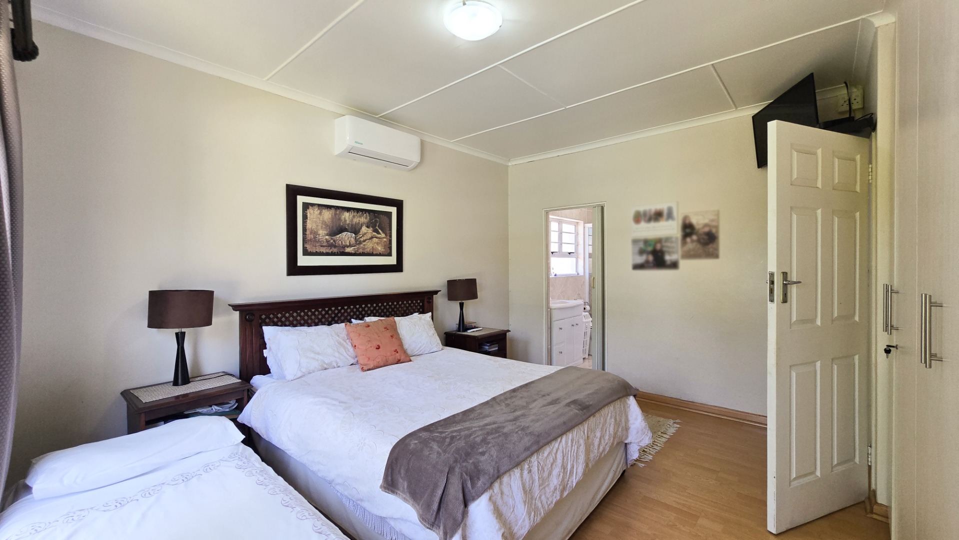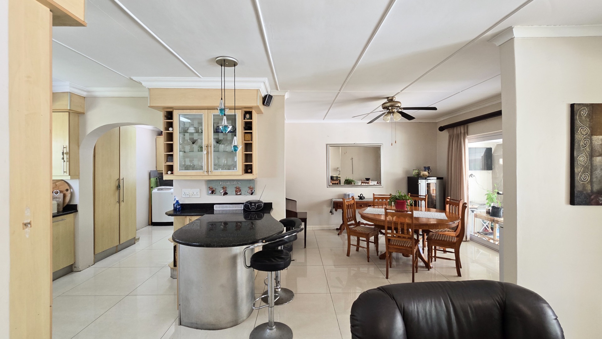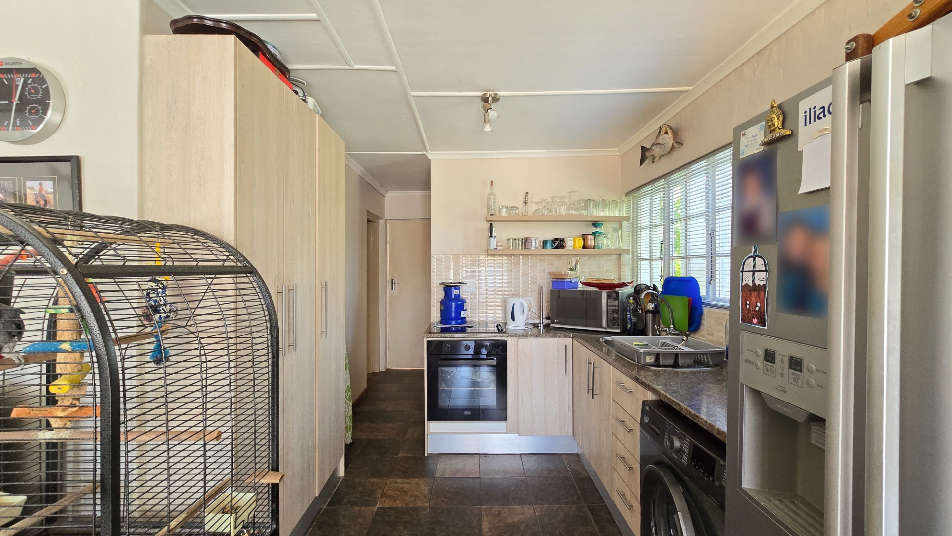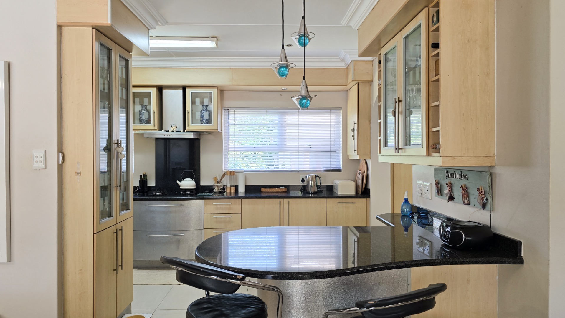 The home offers three well-sized bedrooms, including a main bedroom with an en-suite bathroom and aircon, as well as a family bathroom. The kitchen is fitted with ample cupboards, granite countertops, a gas hob, and an eye-level oven, complemented by a separate scullery with space for a top-loader washing machine, dryer, and dishwasher connections.