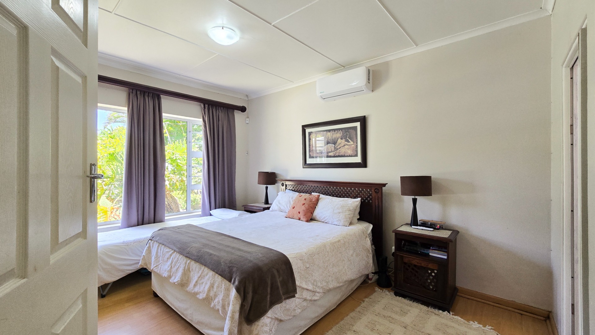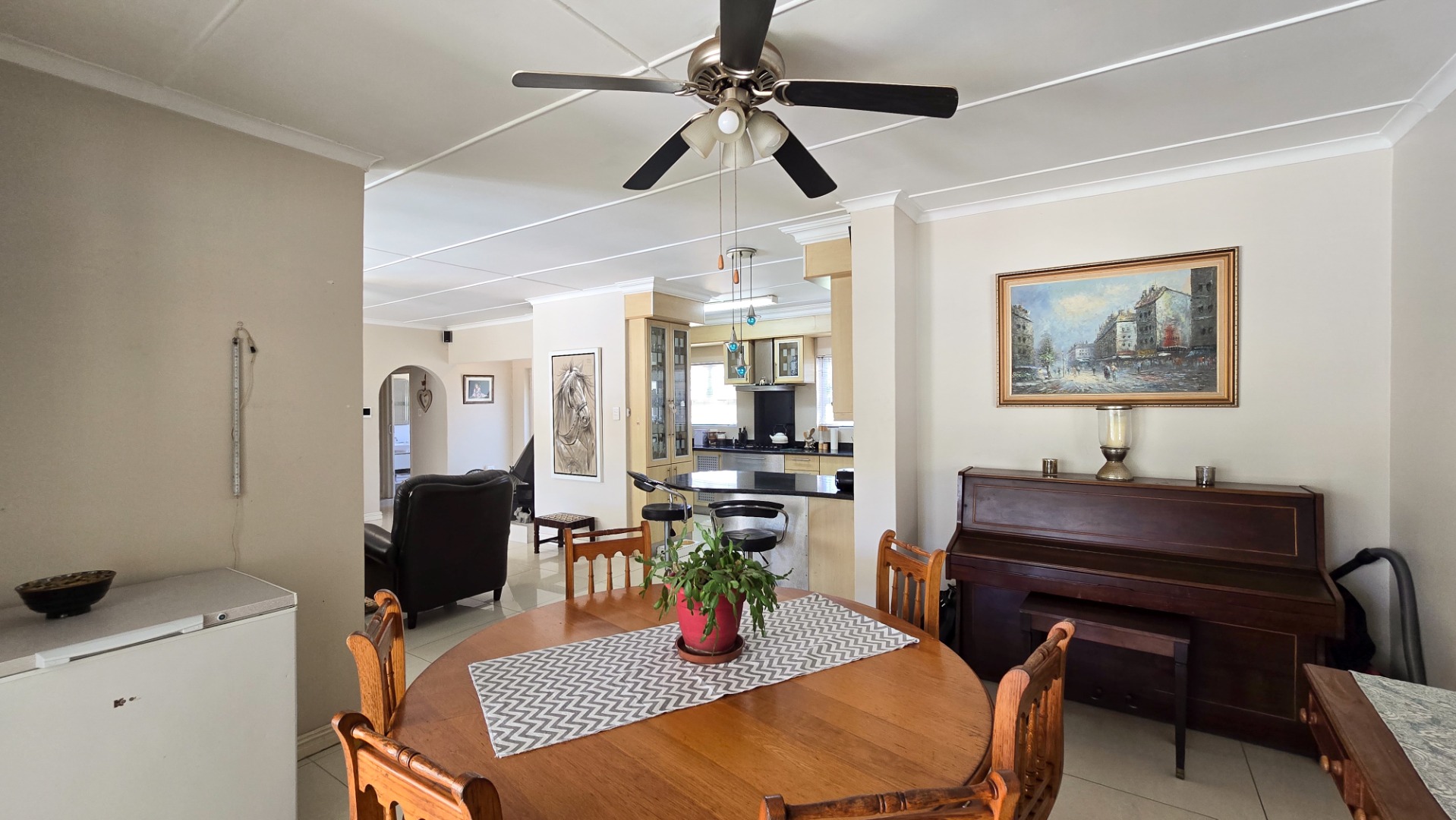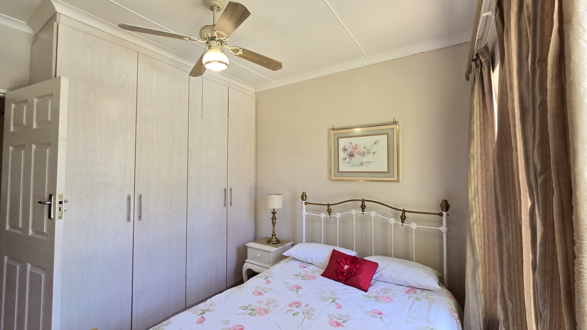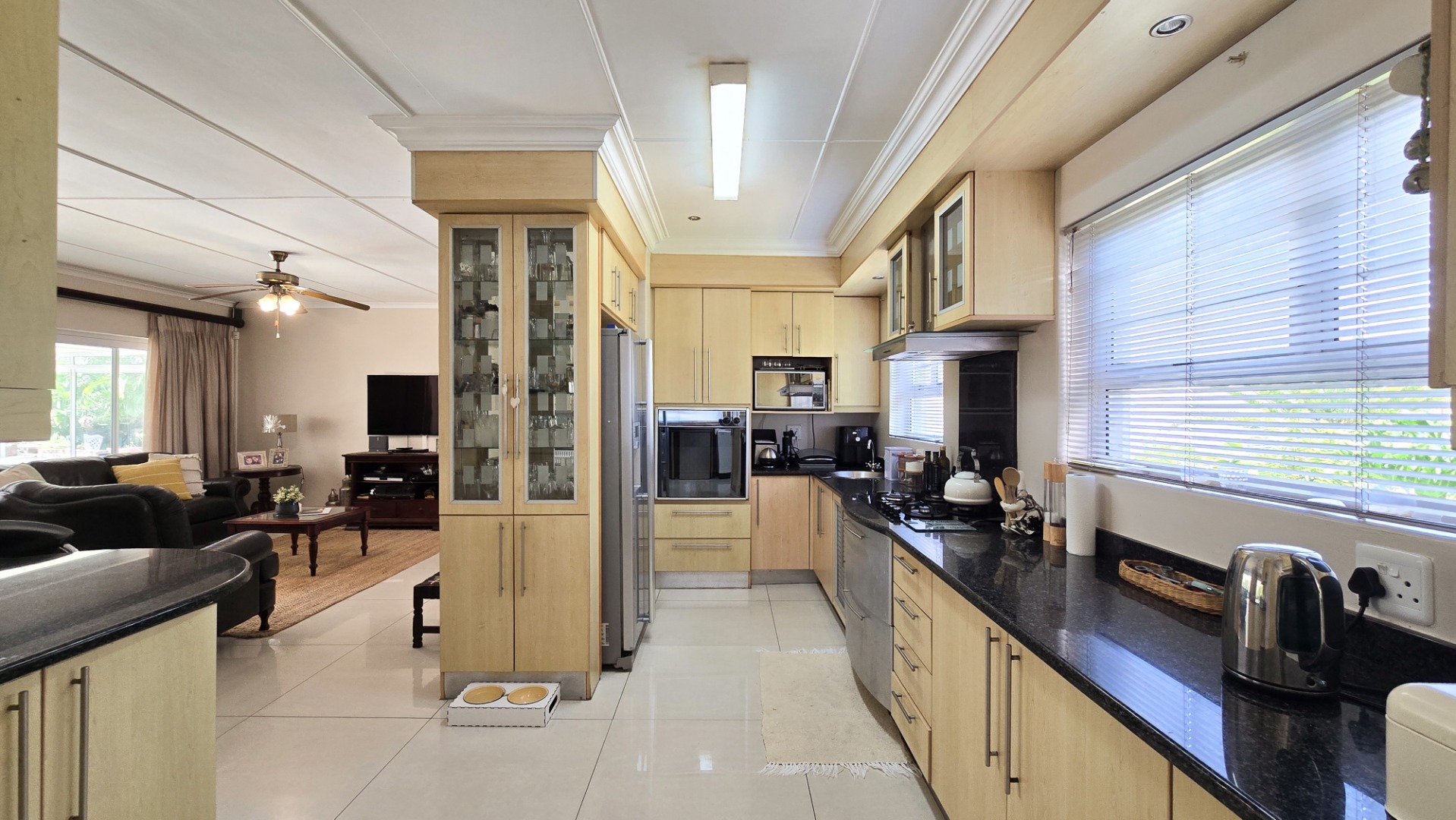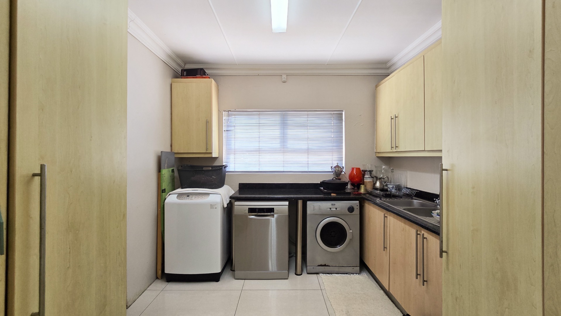 The home offers three well-sized bedrooms, including a main bedroom with an en-suite bathroom and aircon, as well as a family bathroom. The kitchen is fitted with ample cupboards, granite countertops, a gas hob, and an eye-level oven, complemented by a separate scullery with space for a top-loader washing machine, dryer, and dishwasher connections.