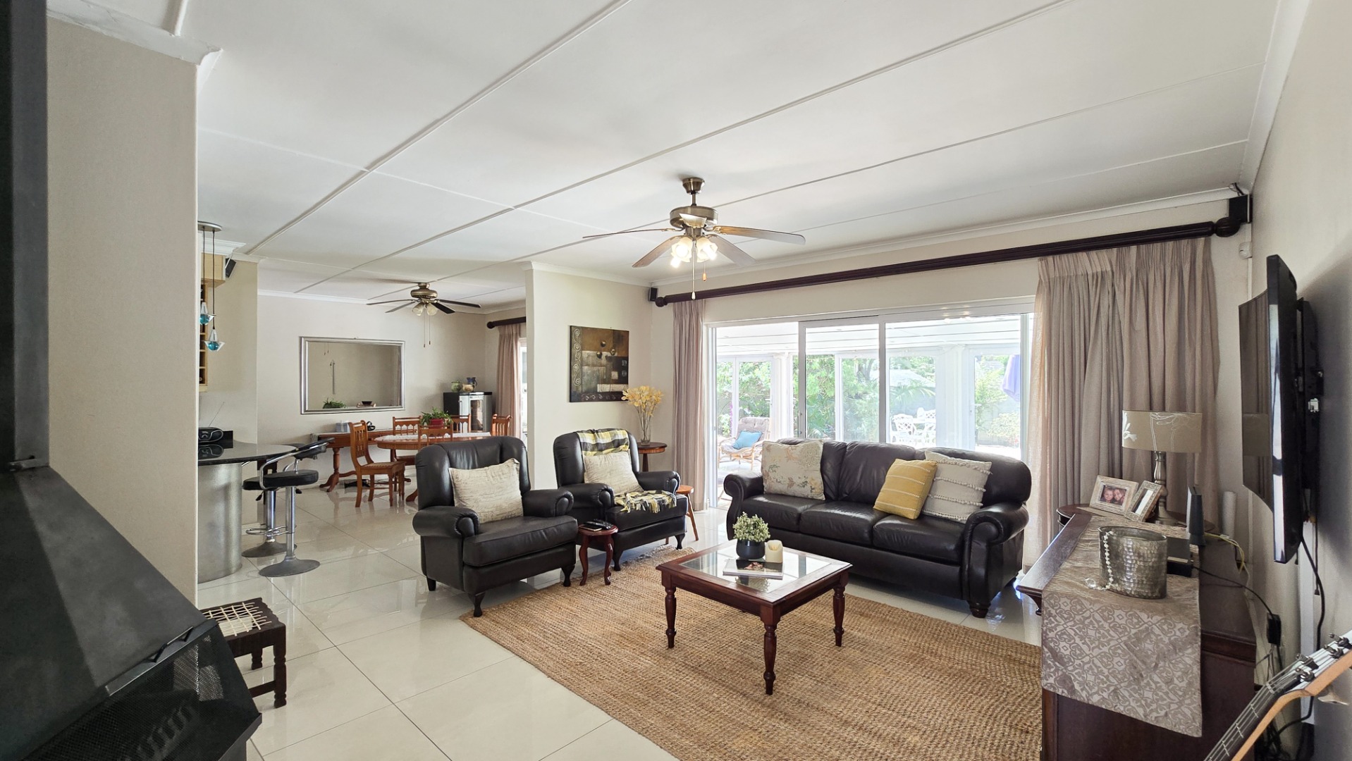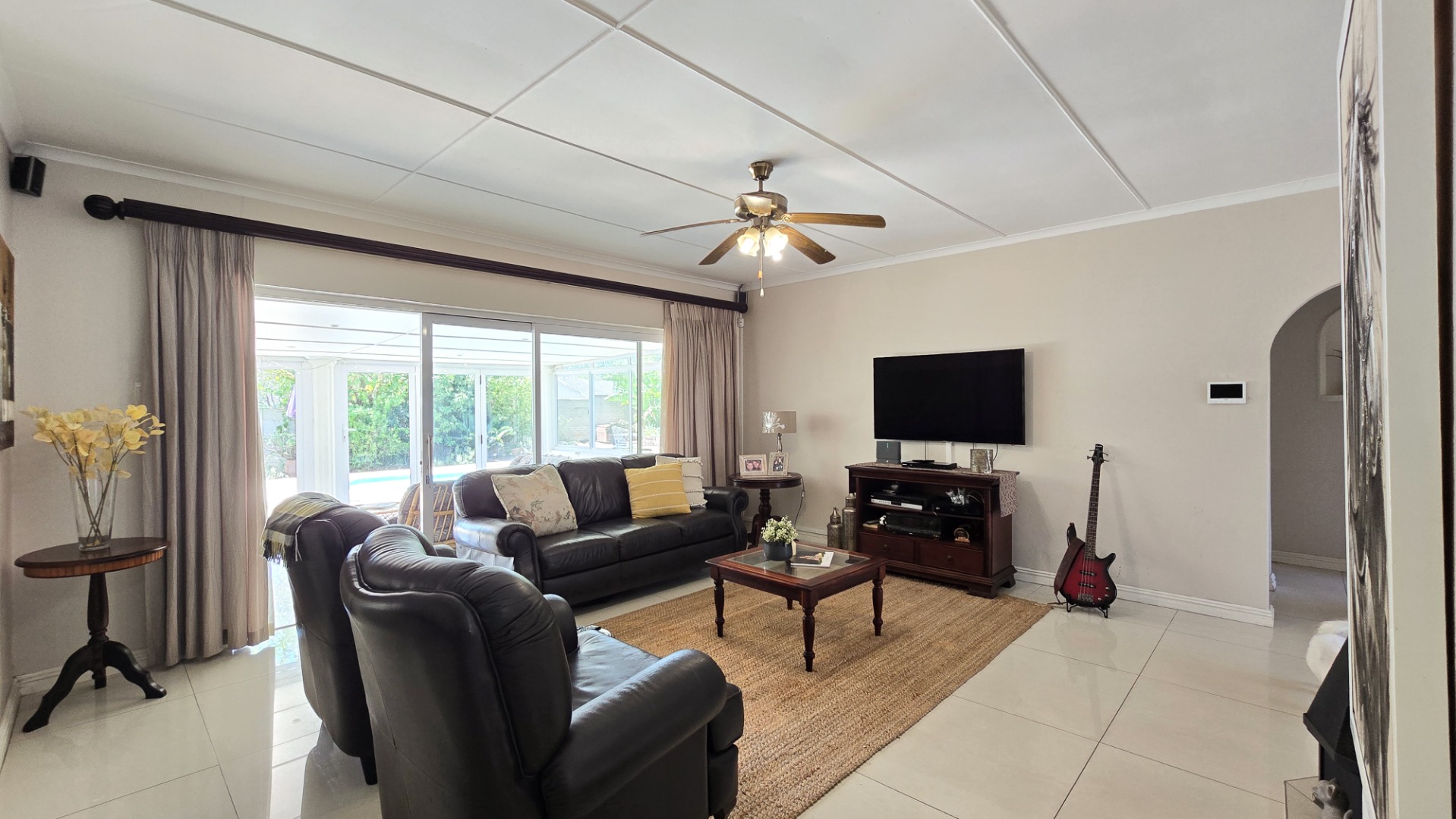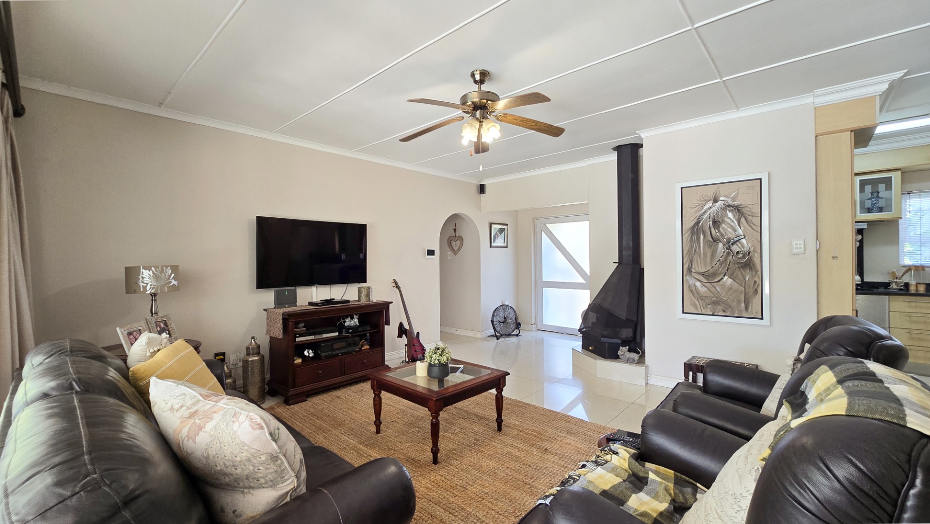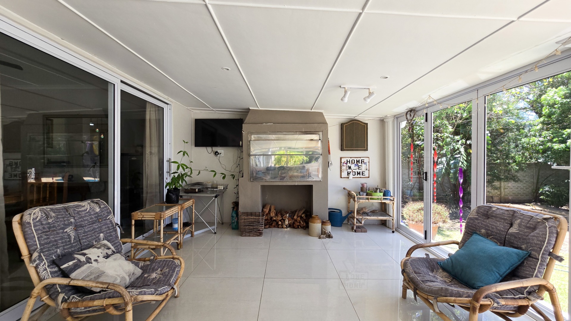 The main residence welcomes you into a spacious open-plan living area, seamlessly combining the lounge, dining room, and modern kitchen. The home is stylishly tiled throughout, creating a clean and contemporary feel. The lounge opens onto a generous enclosed entertainment area, complete with a stainless-steel built-in braai, which flows out to a sparkling swimming pool; ideal for relaxed family living and entertaining.