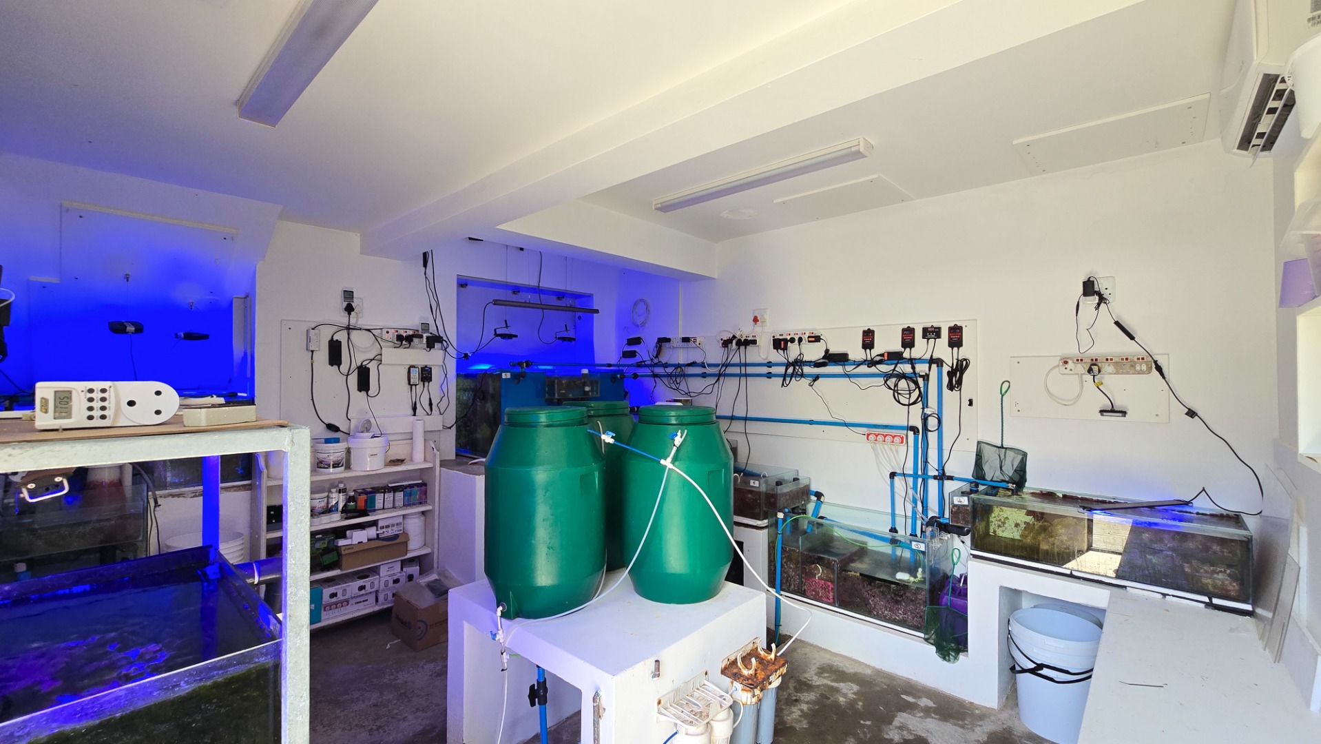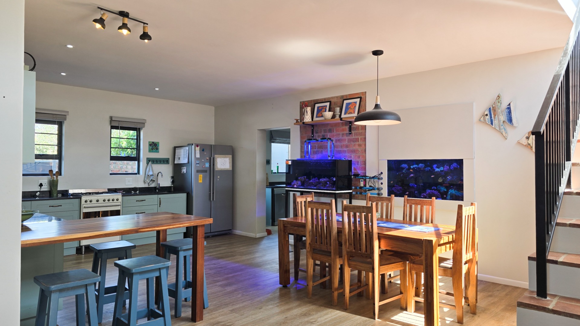 Step inside to discover an inviting open-plan layout, seamlessly connecting the living spaces. The heart of the home is a stylish kitchen, boasting modern light blue/sage green cabinetry, ample counter space, and an integrated dining island, perfect for casual meals. Equipped with a gas range and benefiting from abundant natural light, this kitchen is both functional and aesthetically pleasing. The property features three distinct lounges, providing versatile areas for relaxation and entertainment. Unique built-in aquariums add a distinctive touch to the dining and living areas, enhancing the home's character. Large windows and sliding glass doors ensure bright interiors and offer access to outdoor spaces, including an upper-level balcony with integrated planters.