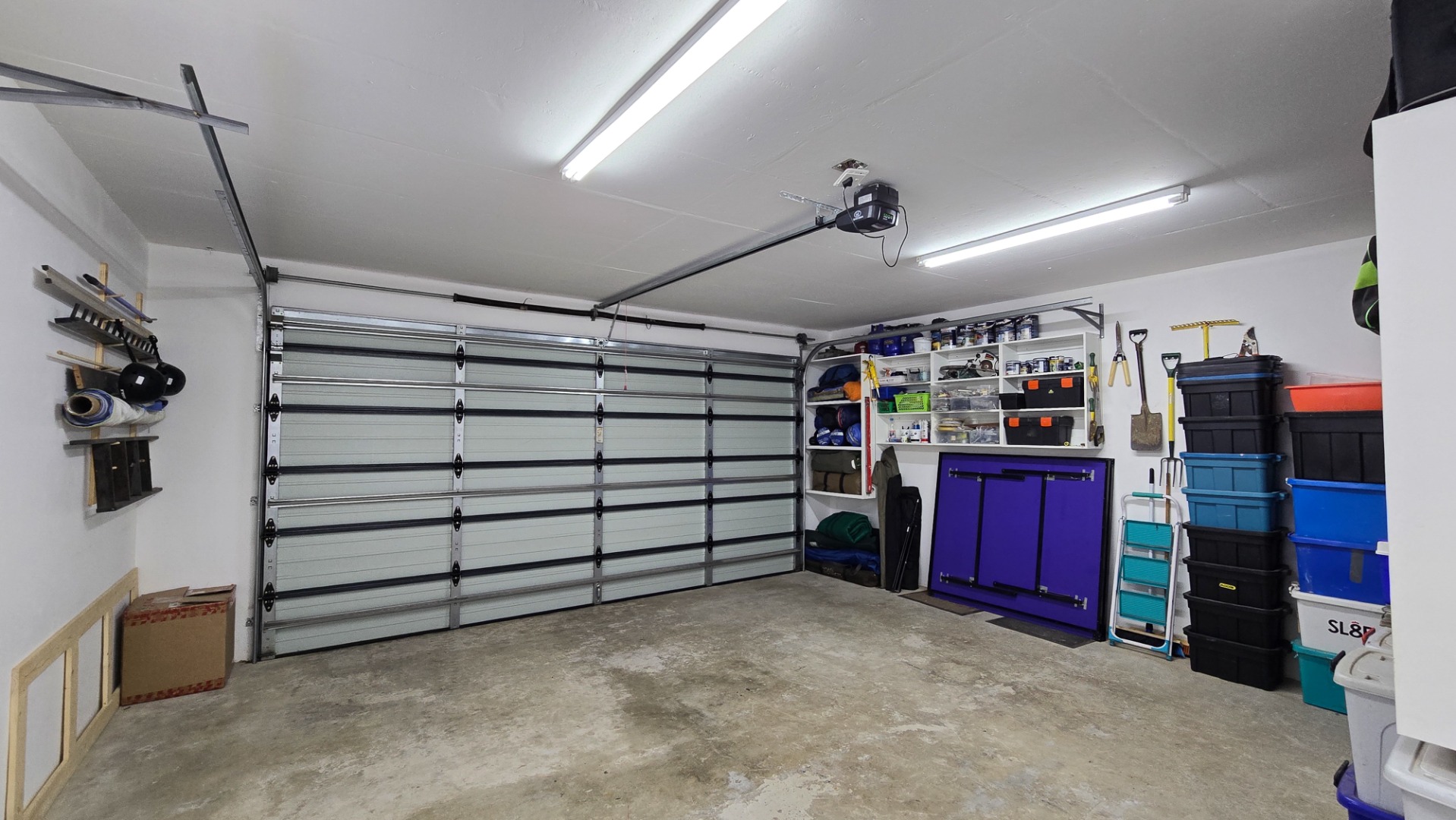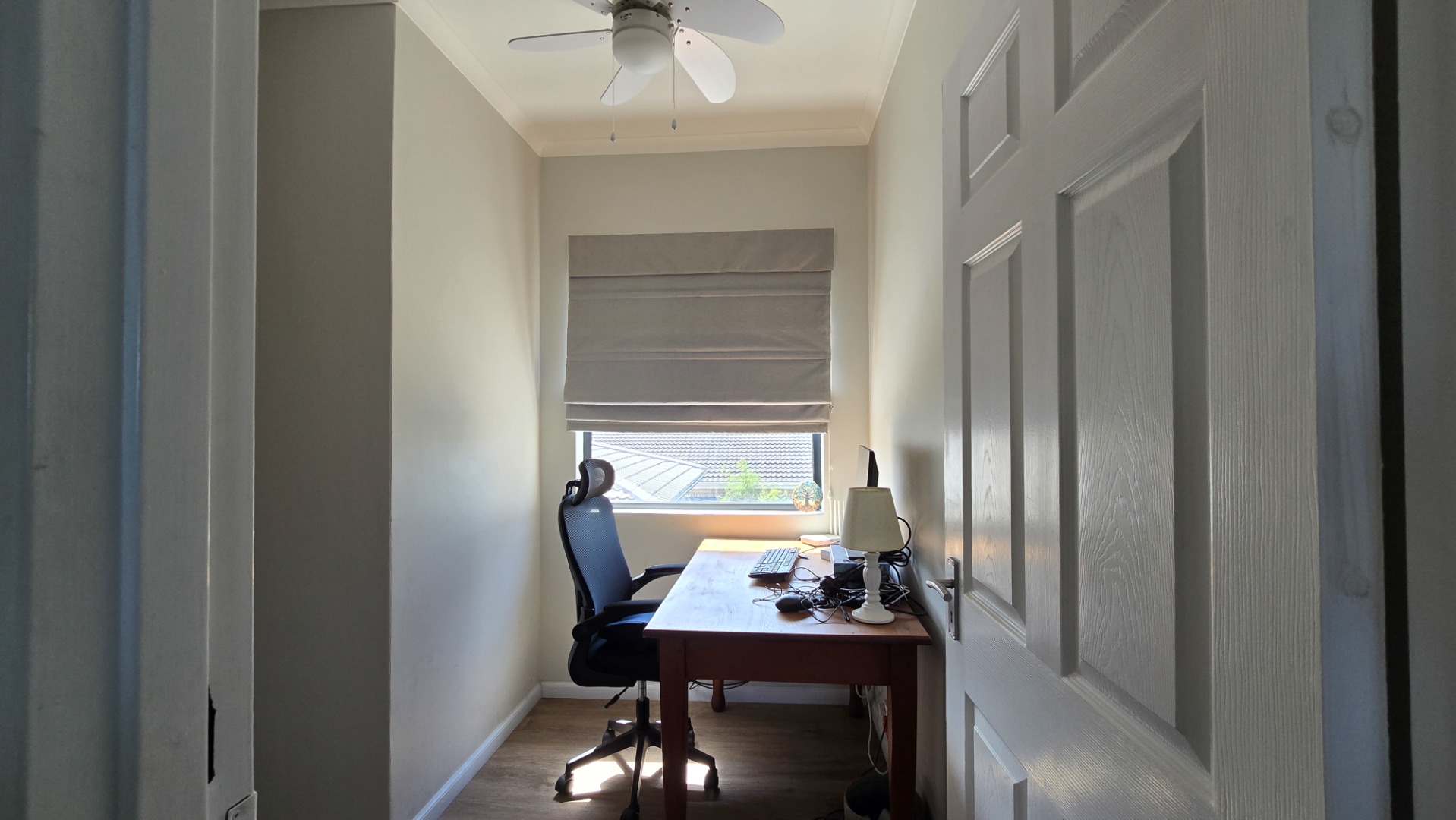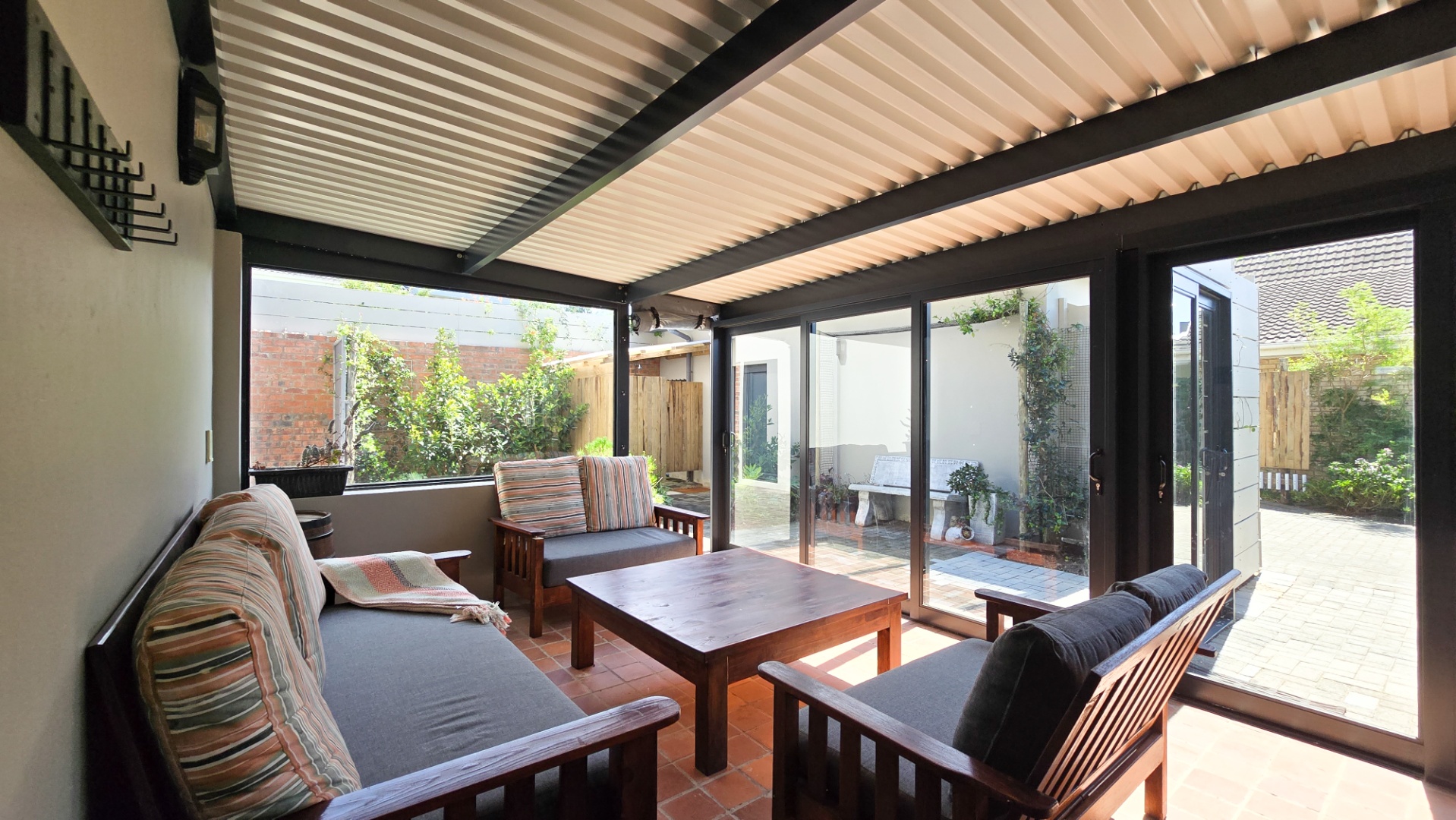 The home provides four comfortable bedrooms and three well-appointed bathrooms, including a private en-suite. Practical amenities include a dedicated laundry room with a double sink, dishwasher, washing machine, and dryer. Outdoor living is catered for with a garden, a built-in braai, and the added luxury of a tennis court. Parking is generous, with four integrated garages and two additional parking spaces.