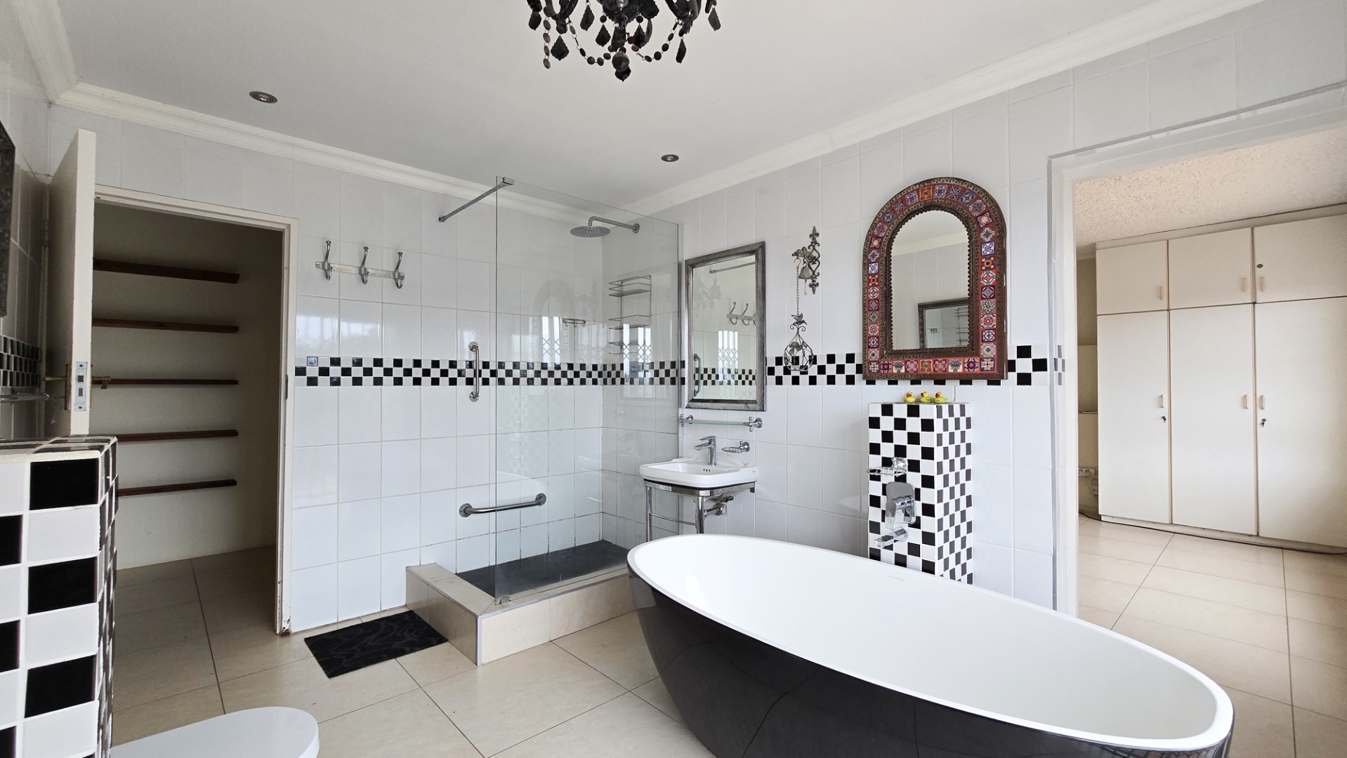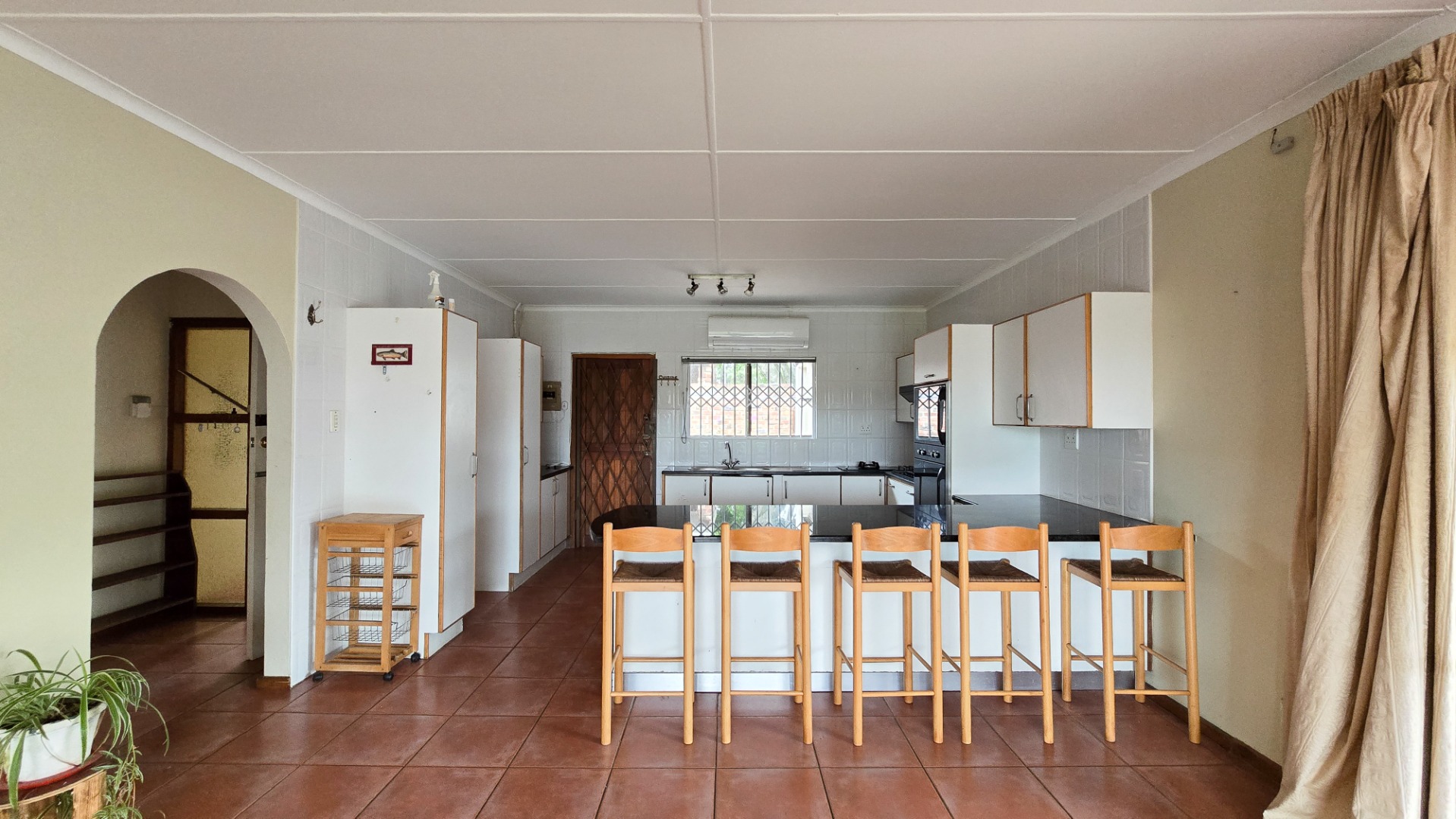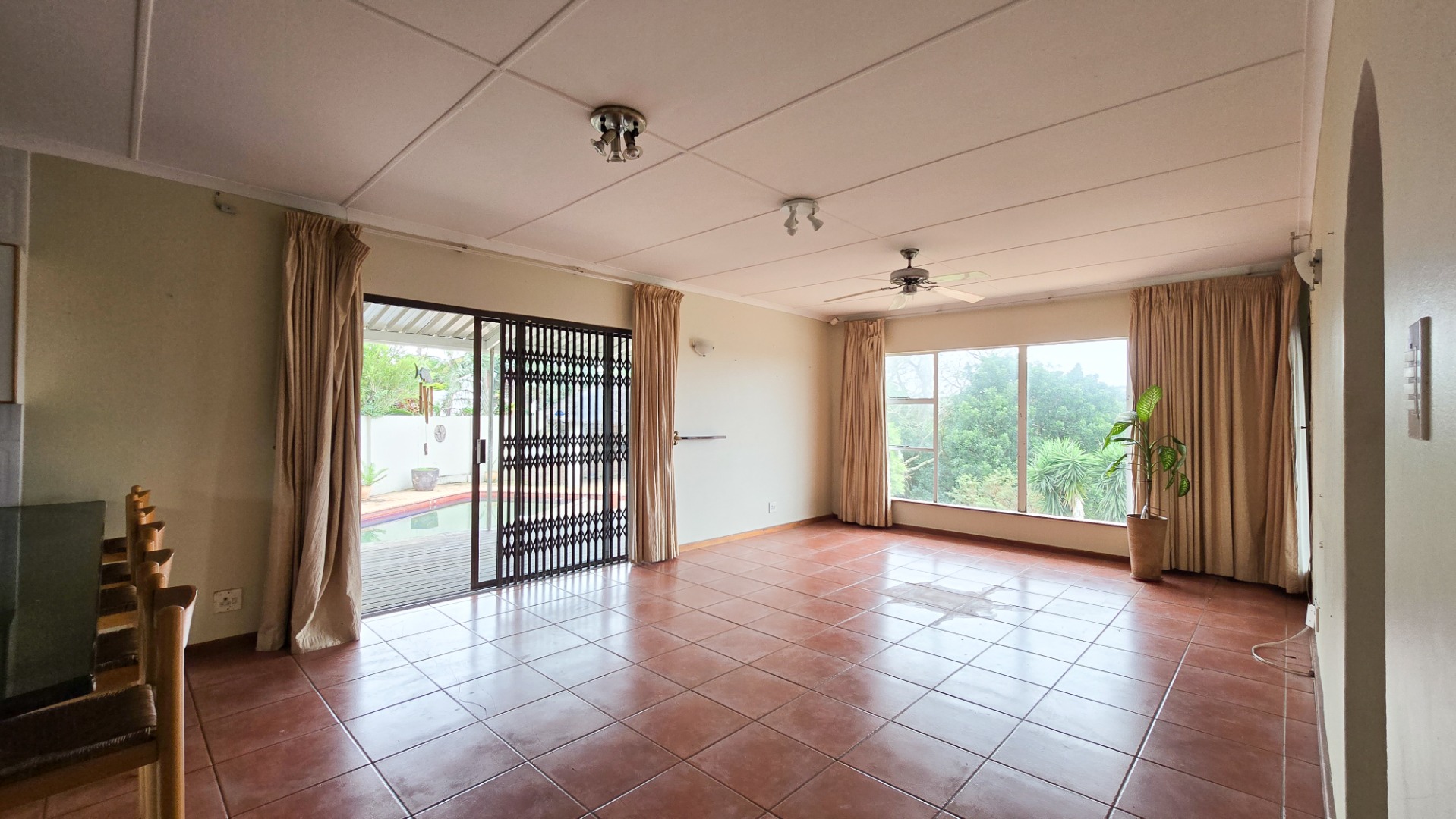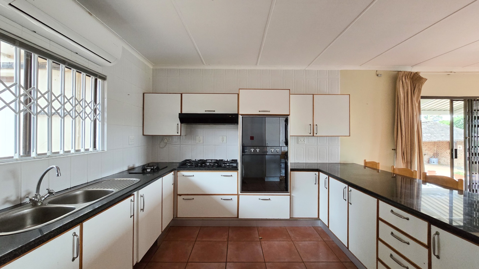 This home boasts an airy open-plan layout that seamlessly connects the modern kitchen, dining room, and spacious lounge. The kitchen is a chef’s dream, featuring both gas and electric hobs, ample cupboard space, and sleek granite countertops. The lounge opens out onto a sparkling swimming pool and a well-appointed entertainment area — perfect for family gatherings or hosting guests.