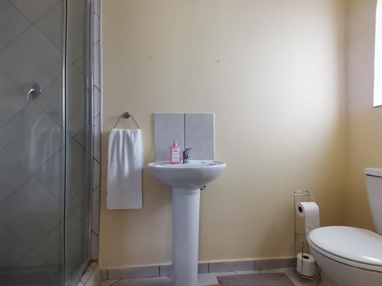 The home features a main bedroom with an ensuite bathroom, built-in cupboards in the main and second bedrooms, and a stylish modern family bathroom. The open-plan lounge and kitchen area offers a seamless flow, with the kitchen fitted with built-in cupboards and space for a dishwasher. Additional features include a linen cabinet and a spacious 390m² erf, providing room for outdoor enjoyment or future extensions.