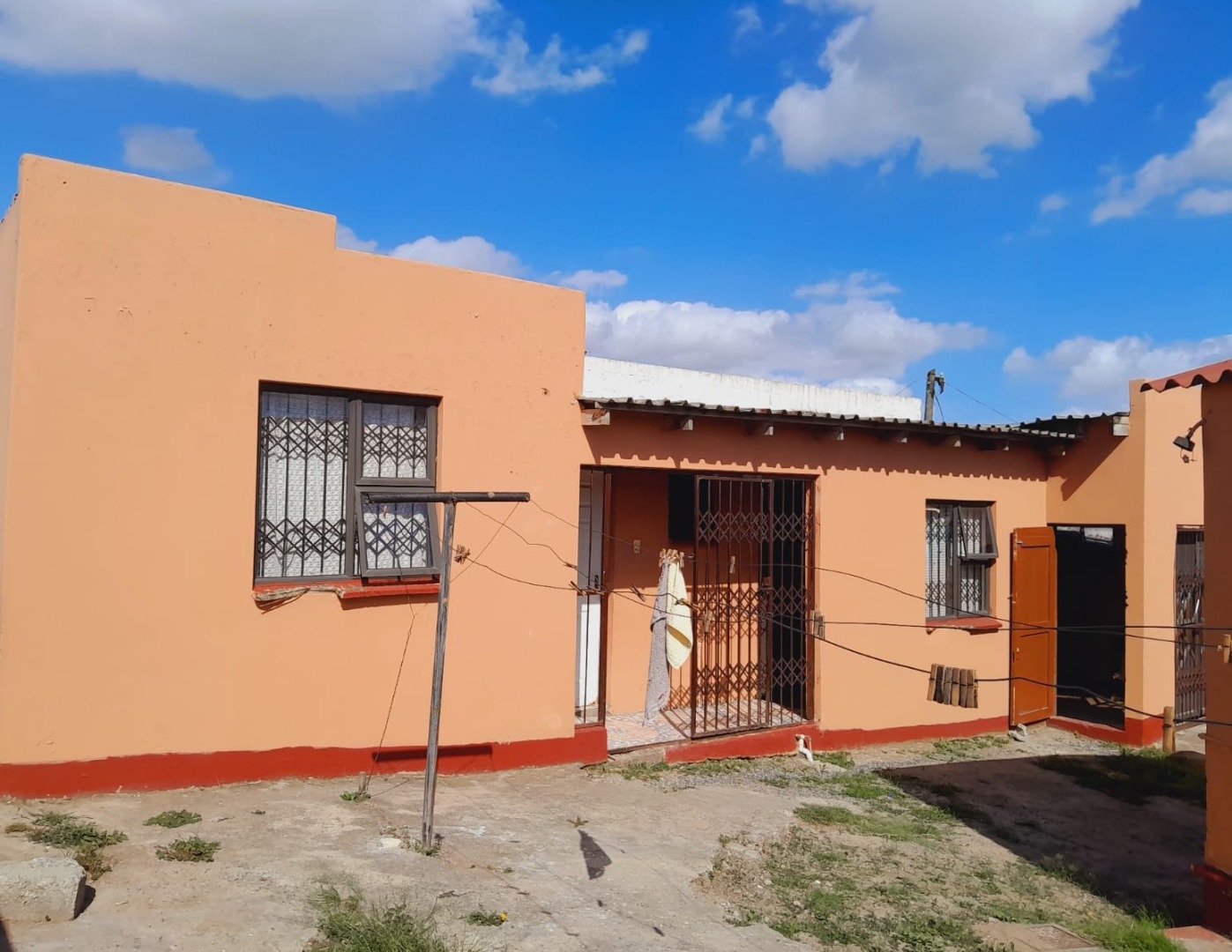 The main house offers two well-sized bedrooms, a lounge, and a kitchen fitted with built-in cupboards. All rooms feature built-in cupboards for added convenience. The property also includes two outside flats sharing a bathroom, a single garage, and ample space for additional parking