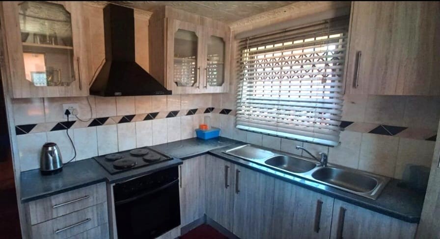 The main house offers two well-sized bedrooms, a lounge, and a kitchen fitted with built-in cupboards. All rooms feature built-in cupboards for added convenience. The property also includes two outside flats sharing a bathroom, a single garage, and ample space for additional parking