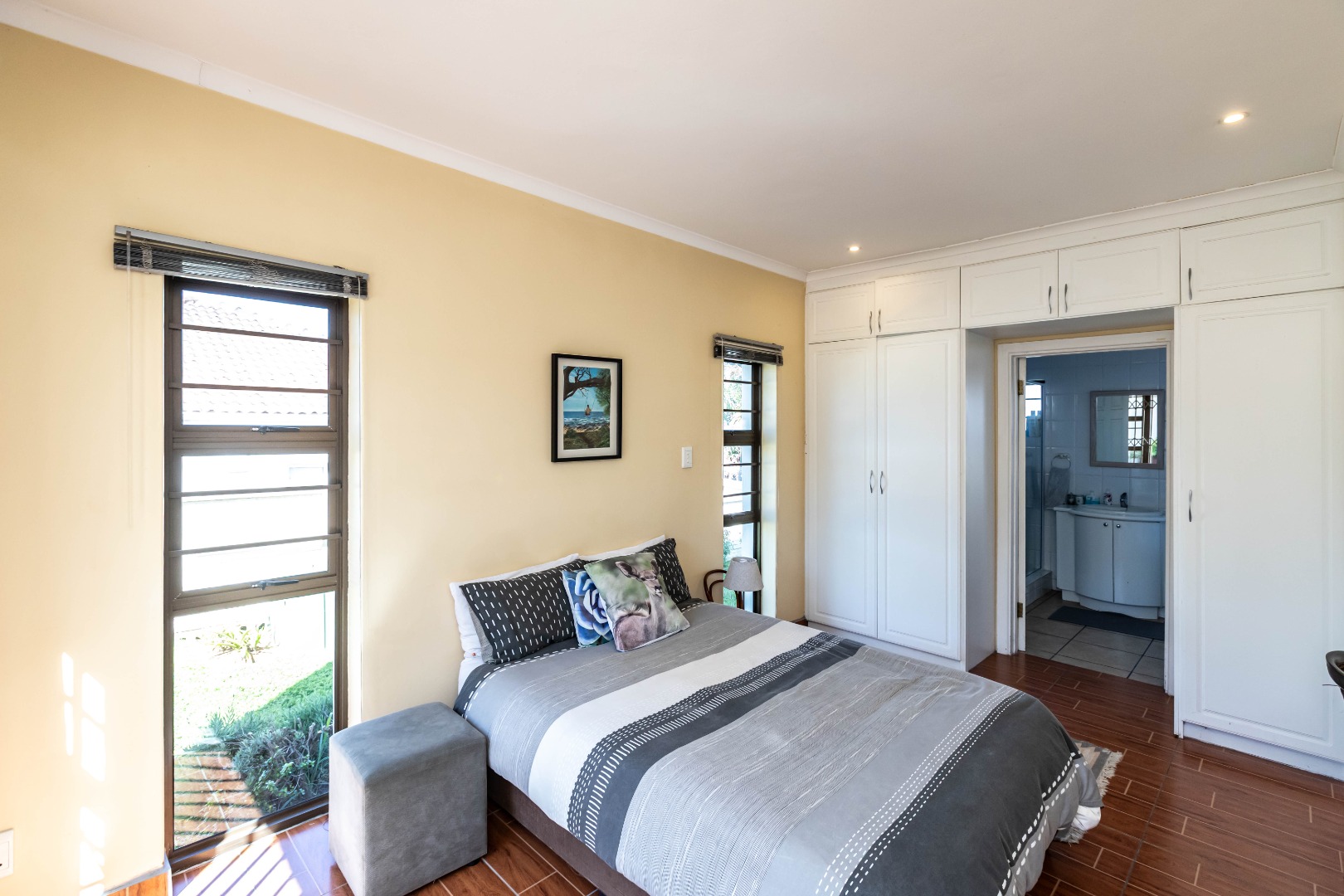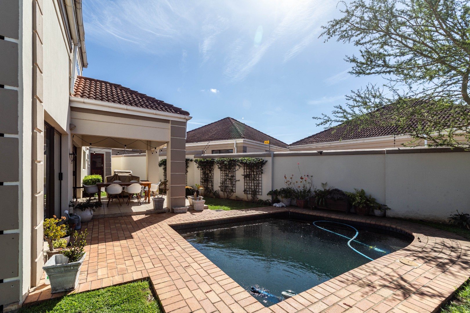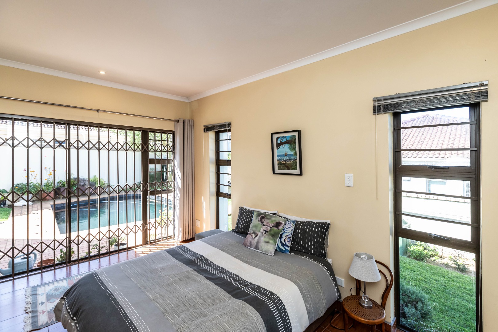 The stylish kitchen features modern finishes, a separate scullery, and flows into the dining area and lounge. The spacious main bedroom boasts a full en-suite bathroom and opens directly onto the pool and garden, creating a serene retreat.