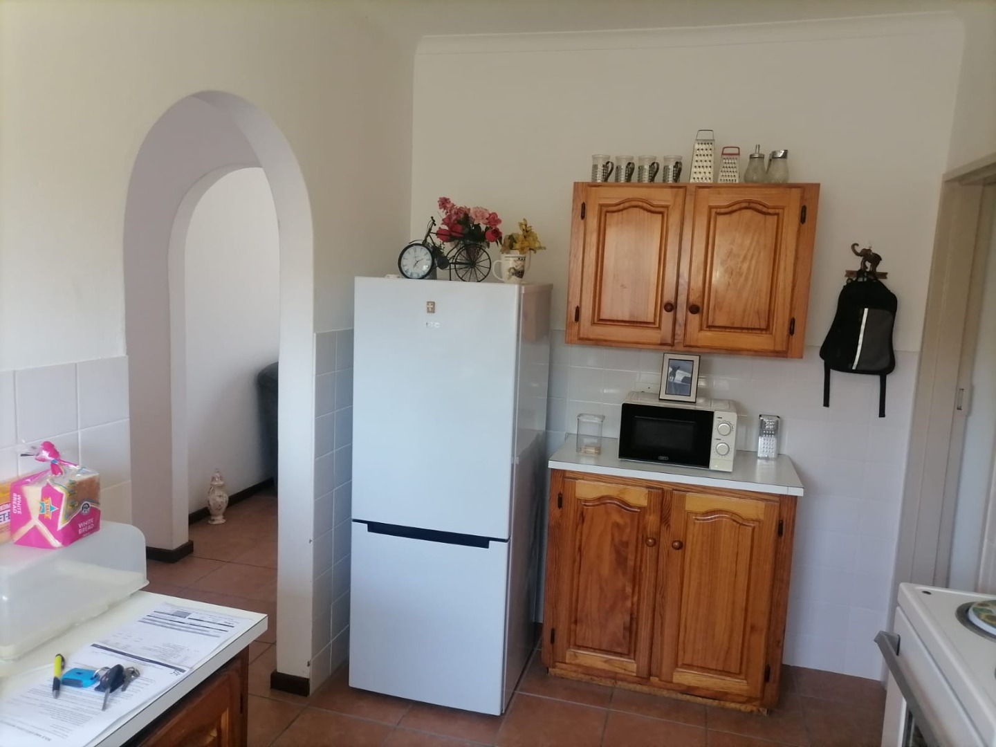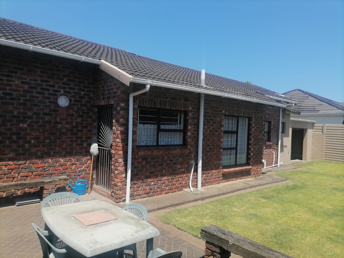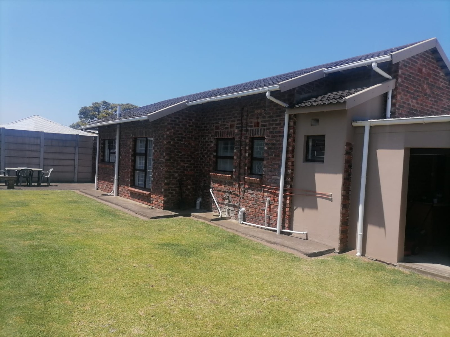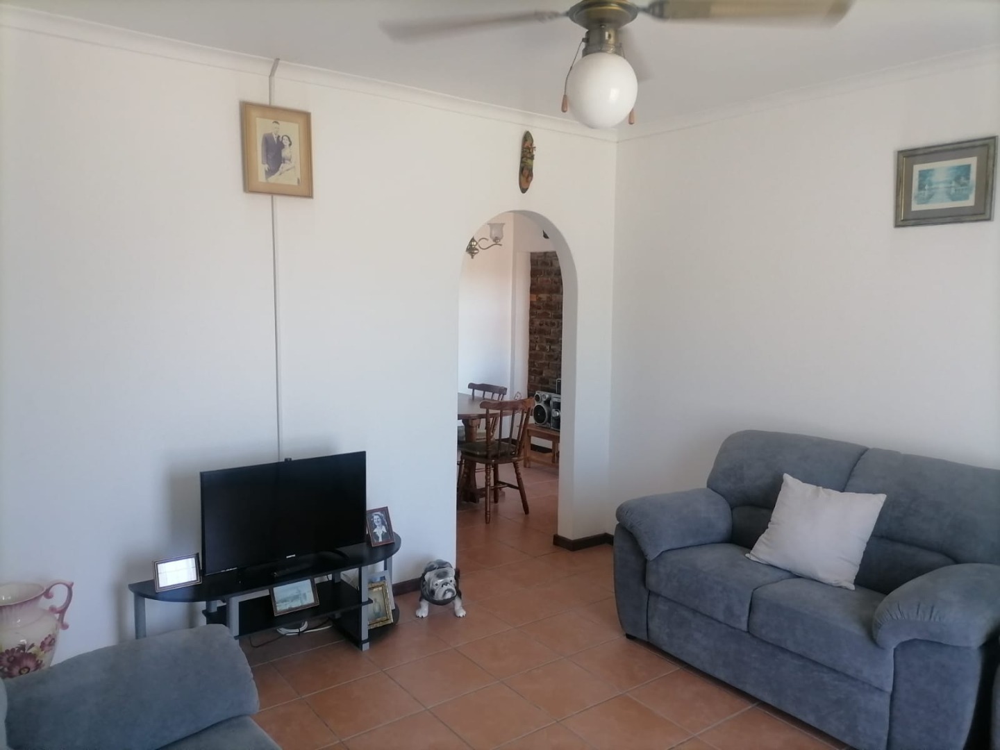 The property features three spacious bedrooms, all fitted with carpets, providing warm and comfortable accommodation. There are two bathrooms, including one en-suite for added convenience. The lounge and dining areas, as well as the kitchen, are neatly finished with tiled flooring. The kitchen is fitted with built-in cupboards, offering ample storage and functionality.