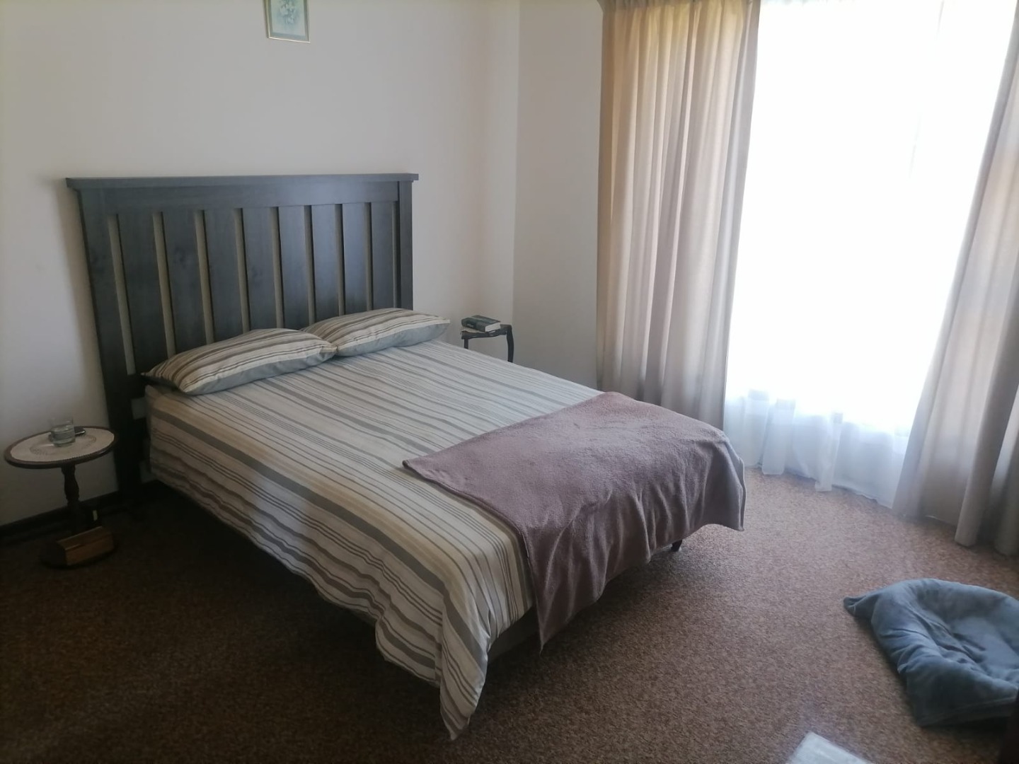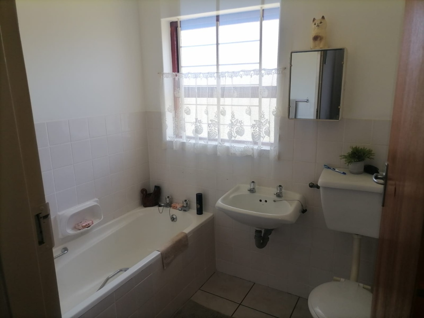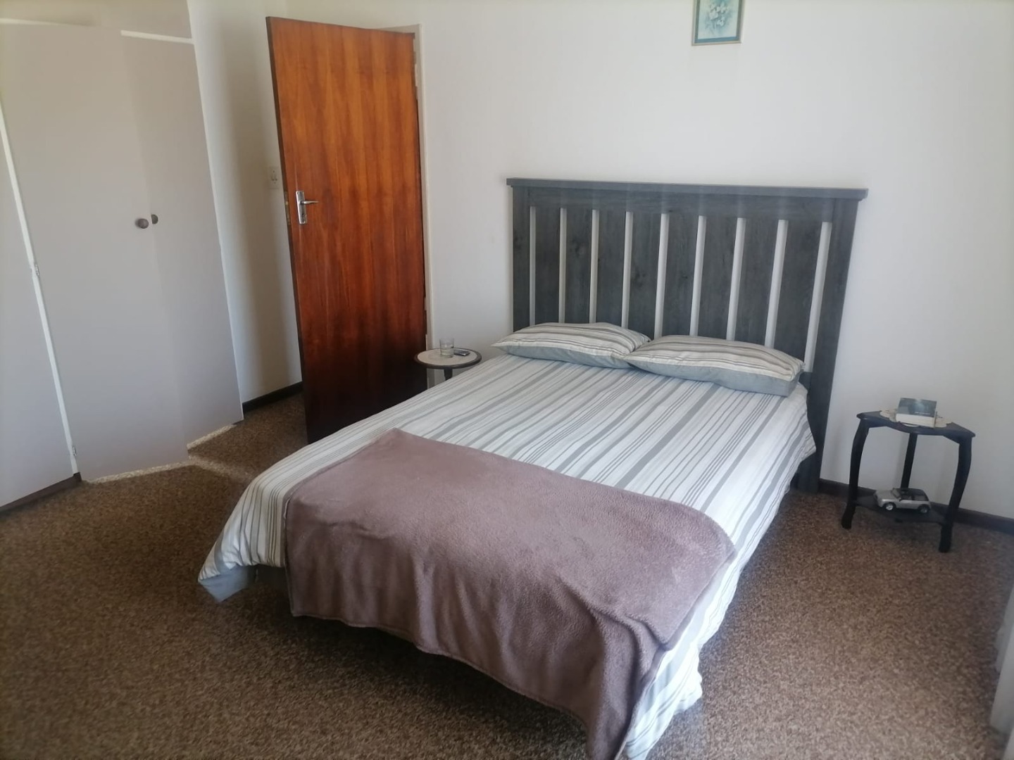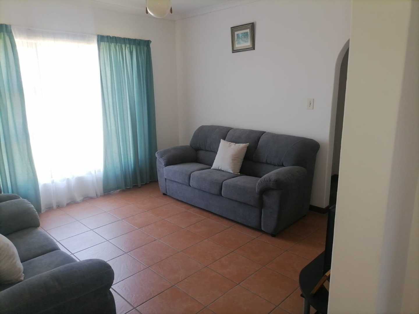 The property features three spacious bedrooms, all fitted with carpets, providing warm and comfortable accommodation. There are two bathrooms, including one en-suite for added convenience. The lounge and dining areas, as well as the kitchen, are neatly finished with tiled flooring. The kitchen is fitted with built-in cupboards, offering ample storage and functionality.