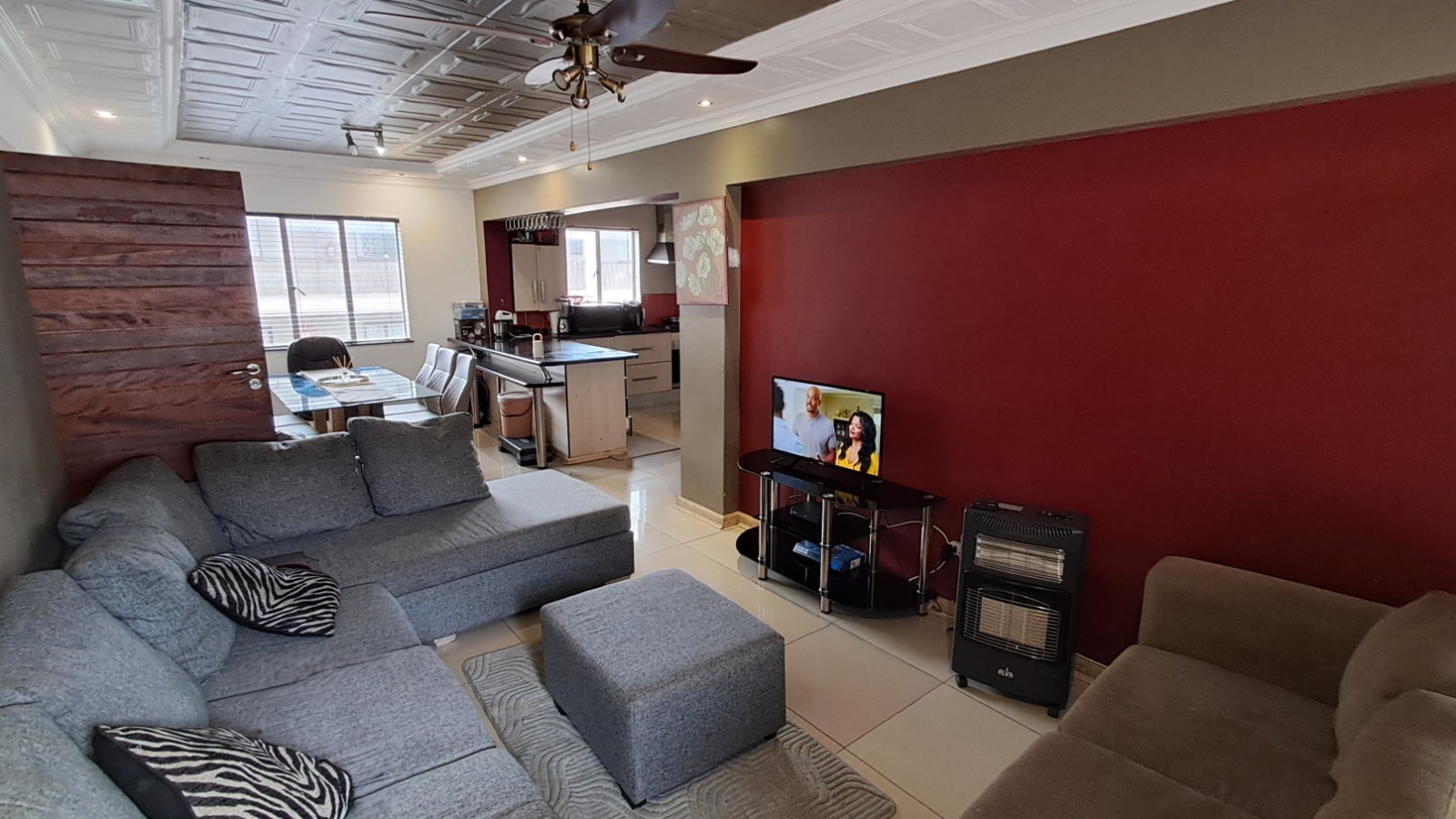 The open-plan living and dining area creates a seamless flow, perfect for relaxed living and effortless entertaining. The modern kitchen features fitted cupboards, a hob, under-counter oven, and extractor fan — designed for both functionality and flair.