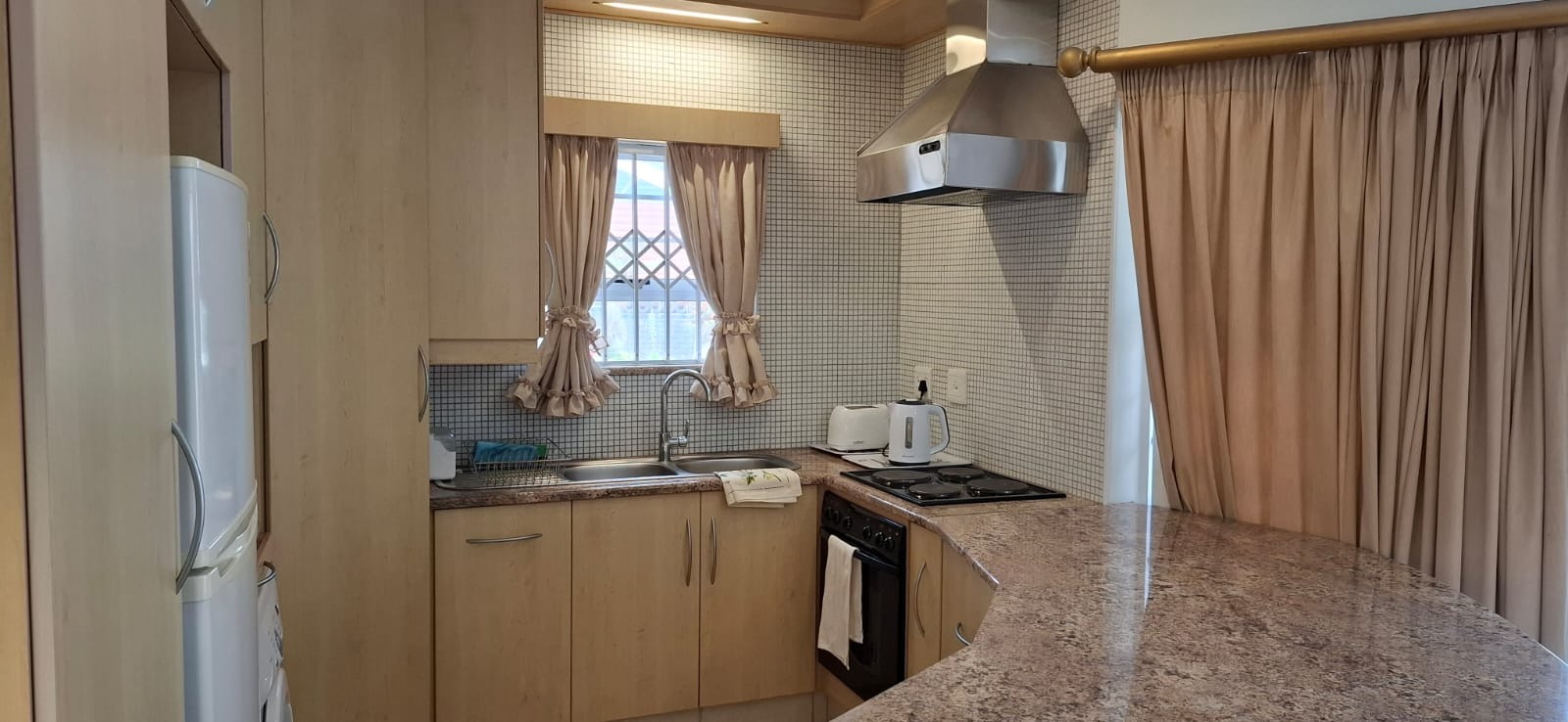 The unit features an open-plan kitchen and lounge, fully equipped with built-in cupboards and crockery. The bedroom includes built-in cupboards and a sliding door that opens onto a private outdoor patio. The flat also offers a neat ensuite bathroom.