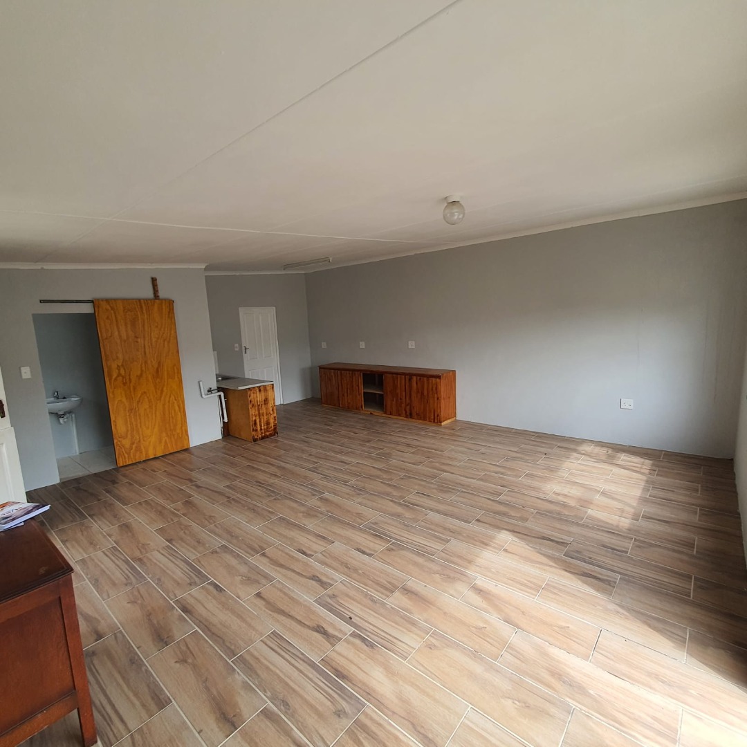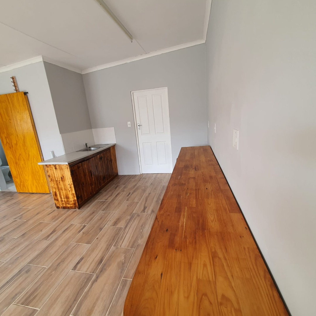 A large open space for a bedroom and sitting area. The kitchen forms a part of this space and does not have a stove but it does have a washing machine point.