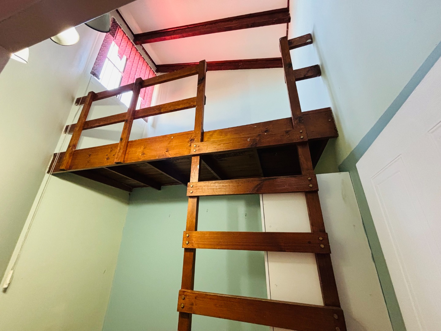 A room with built-in cupboards and an upstairs space where you can use it as a bedroom.