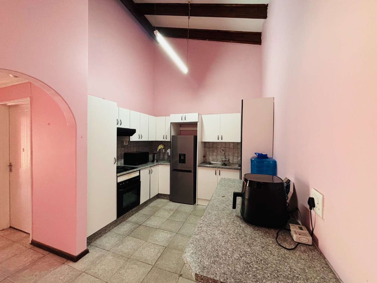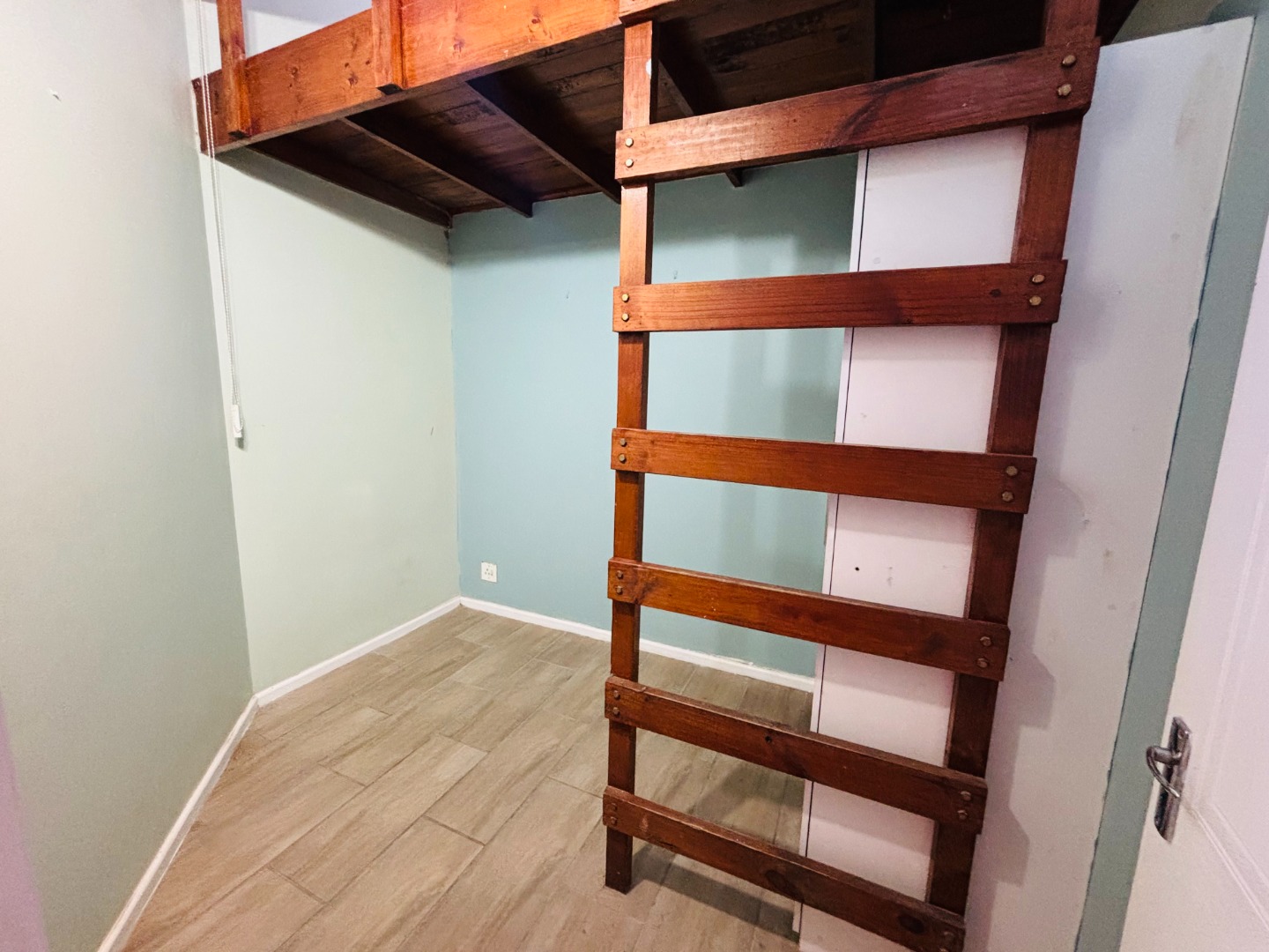 A room with built-in cupboards and an upstairs space where you can use it as a bedroom.