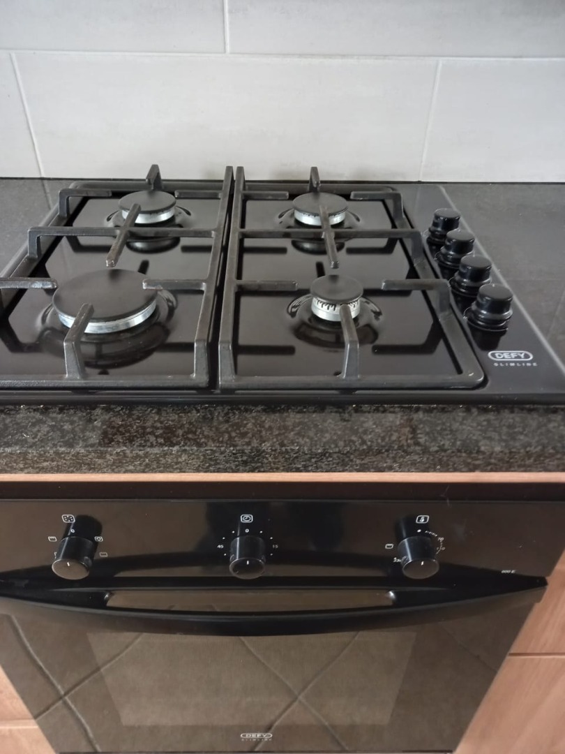 Open-plan kitchen with built-in cupboards, gas stove, and electric oven