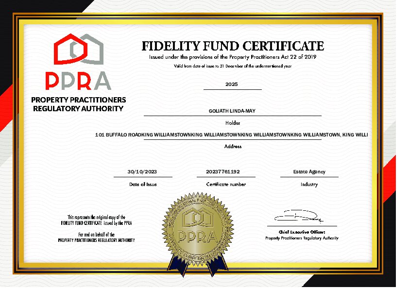 About Linda-May Goliath Title: Candidate Property Practitioner Registered with the PPRA FFC Number: 202678027840000