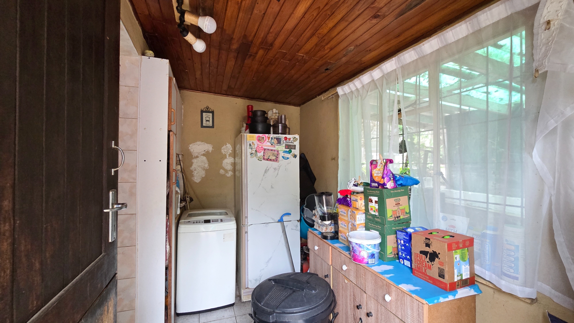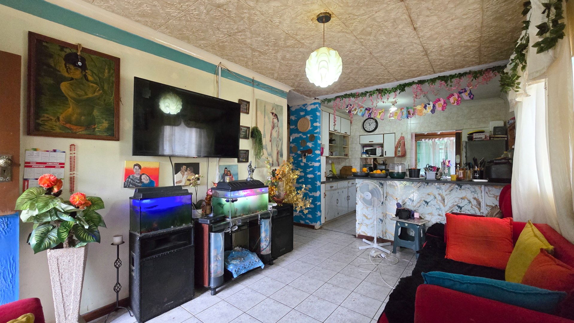The main house features a warm and inviting open-plan lounge and kitchen area, creating a functional space for everyday living and entertaining. The kitchen offers ample cupboard space and practicality, while natural light enhances the cozy atmosphere of the living area.