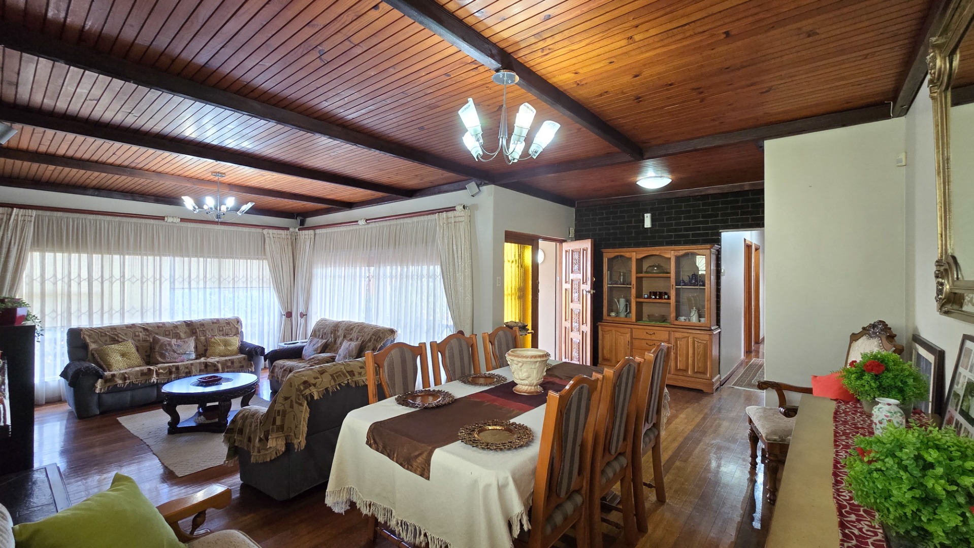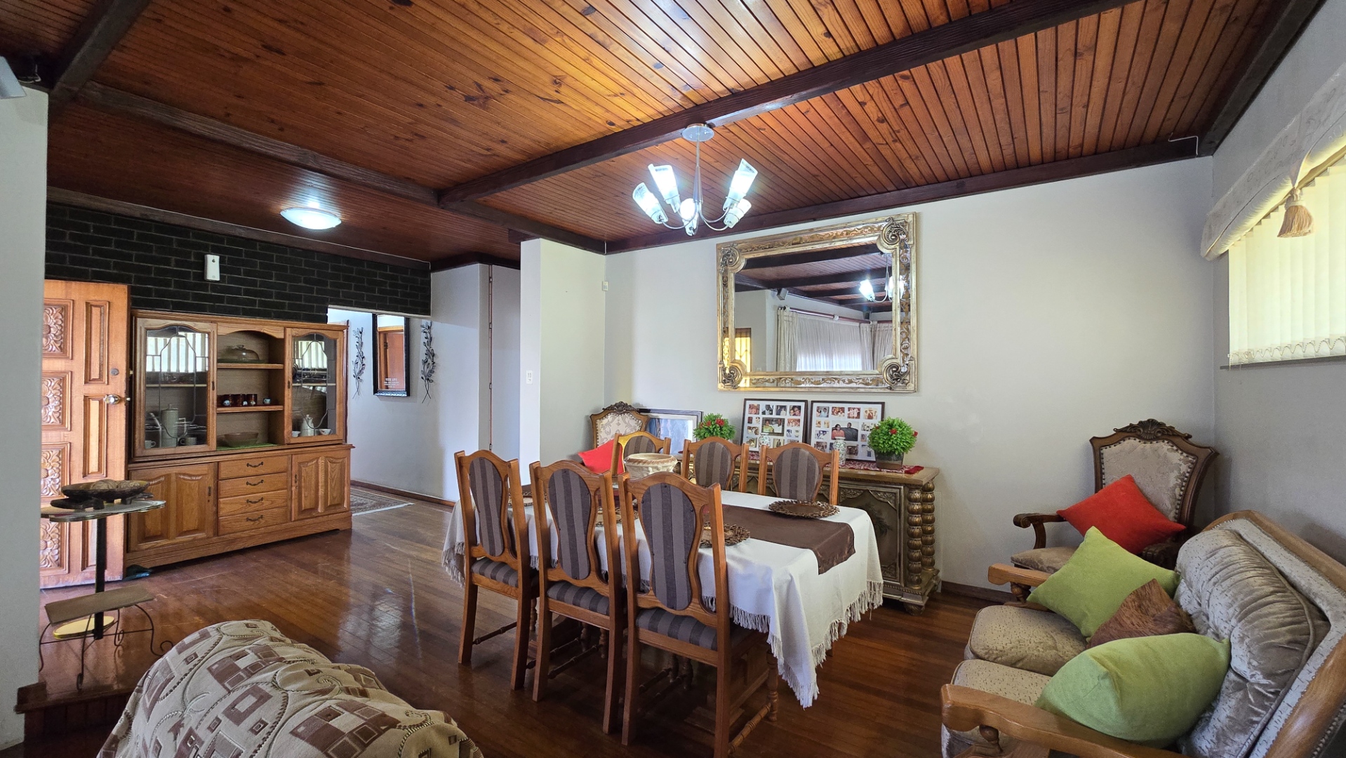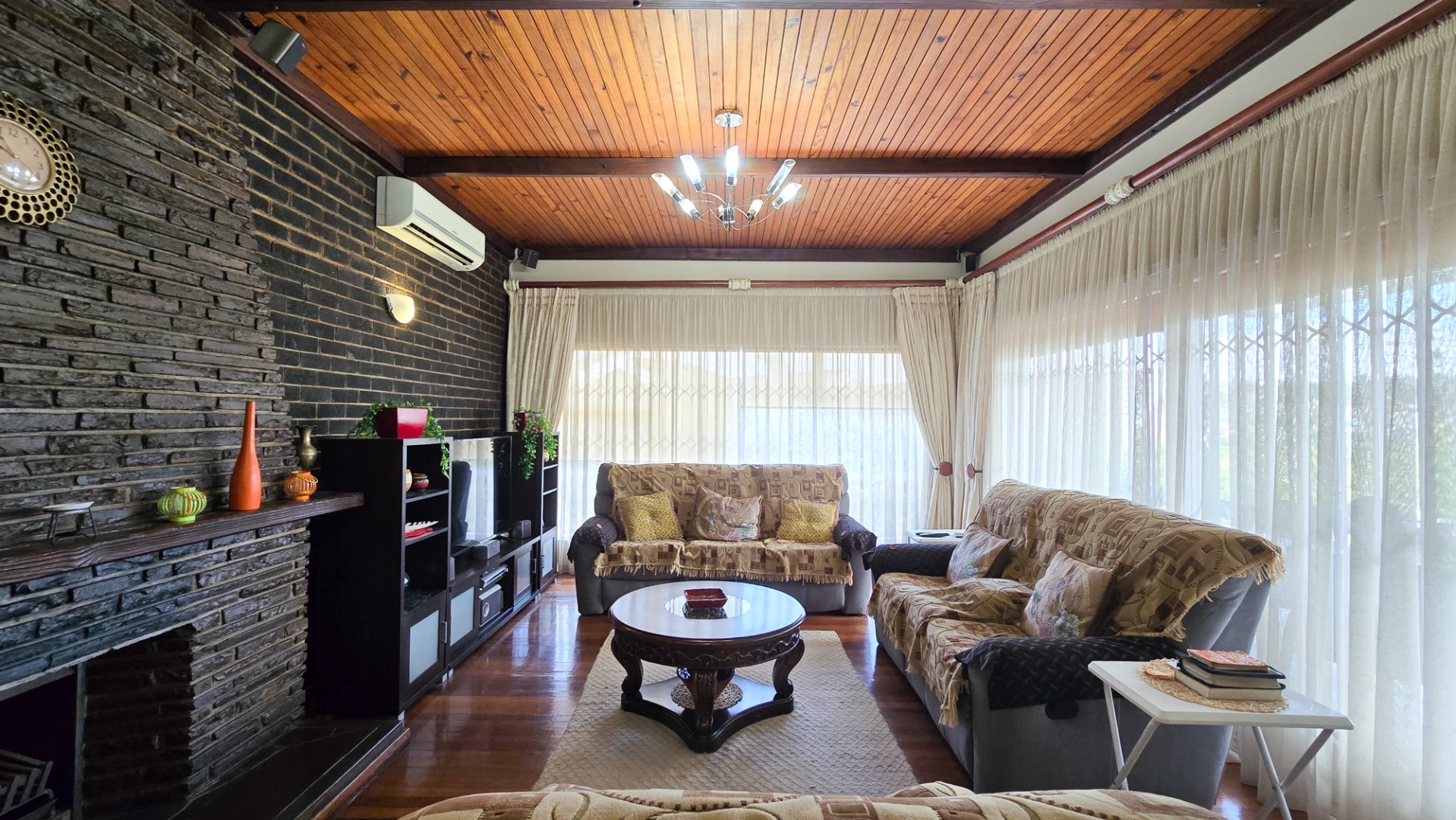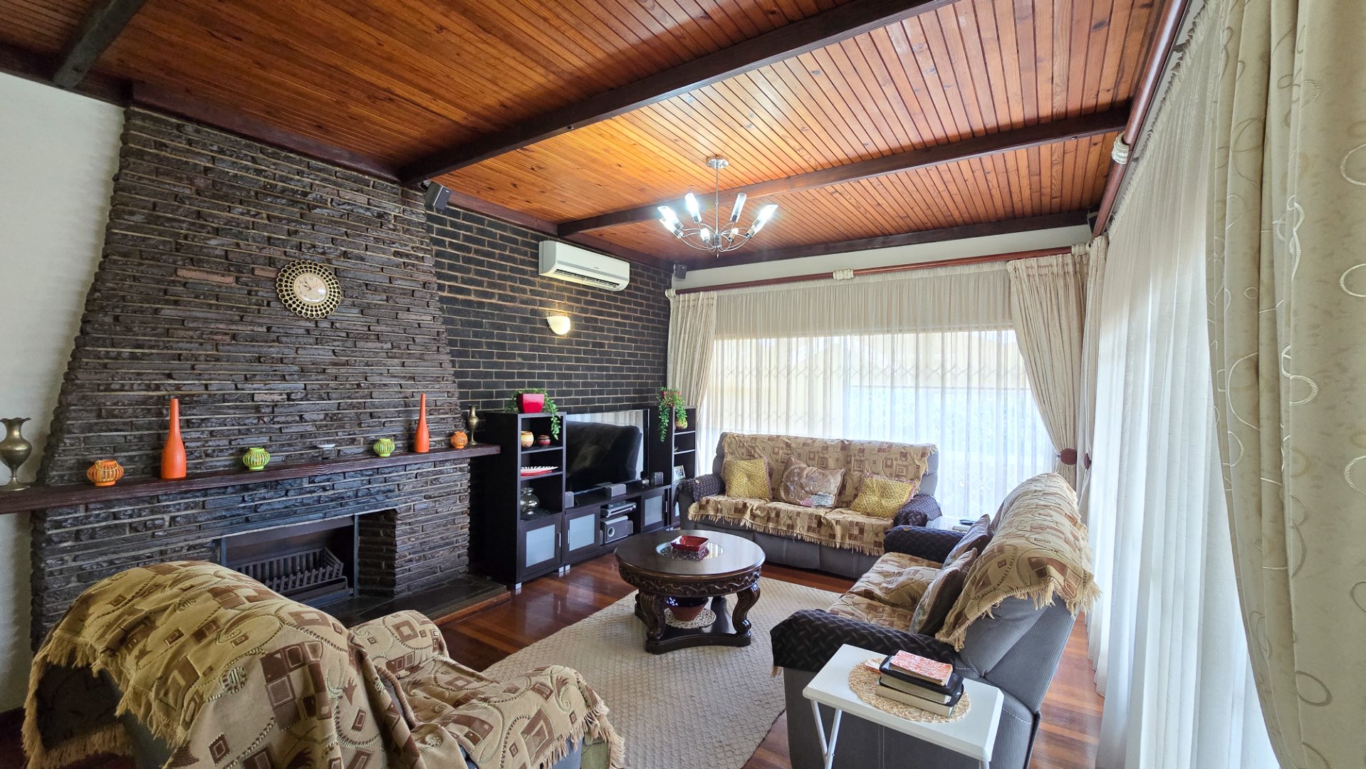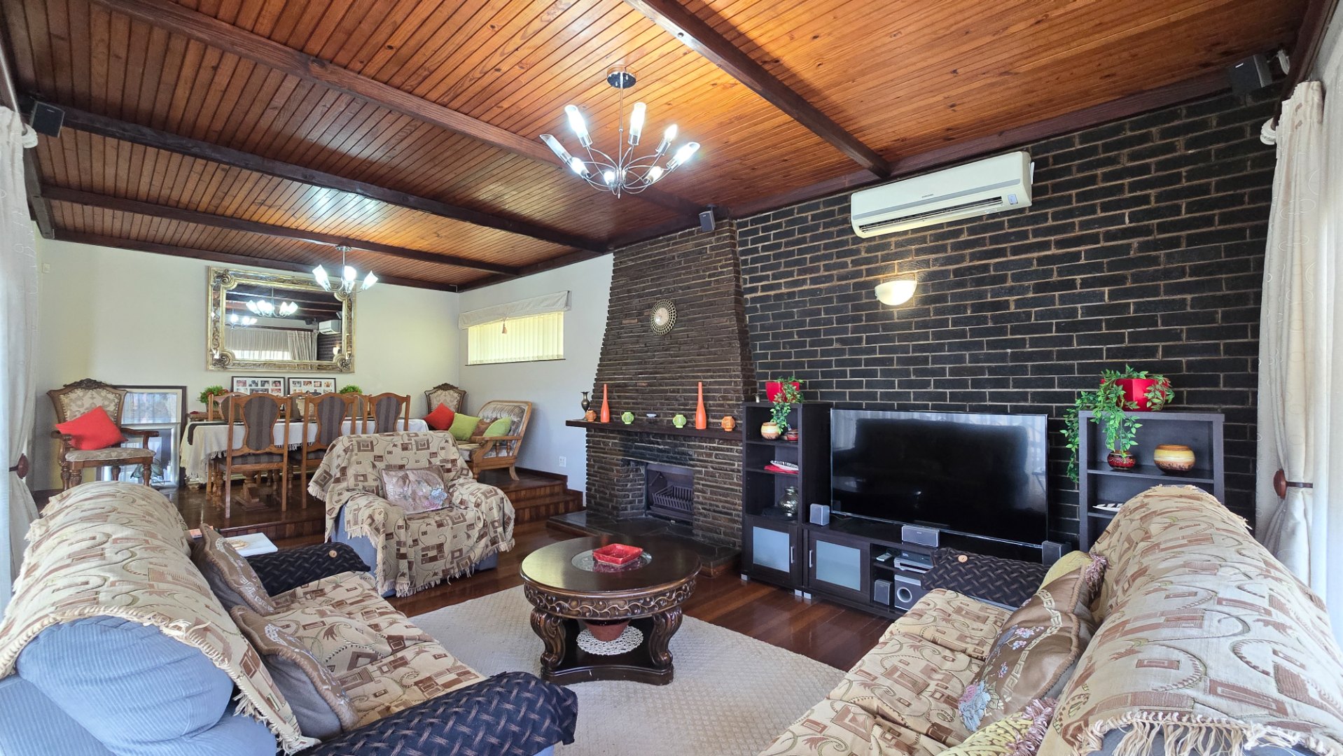 This charming property boasts four spacious bedrooms and a sunken lounge with a cozy fireplace, seamlessly extending to a