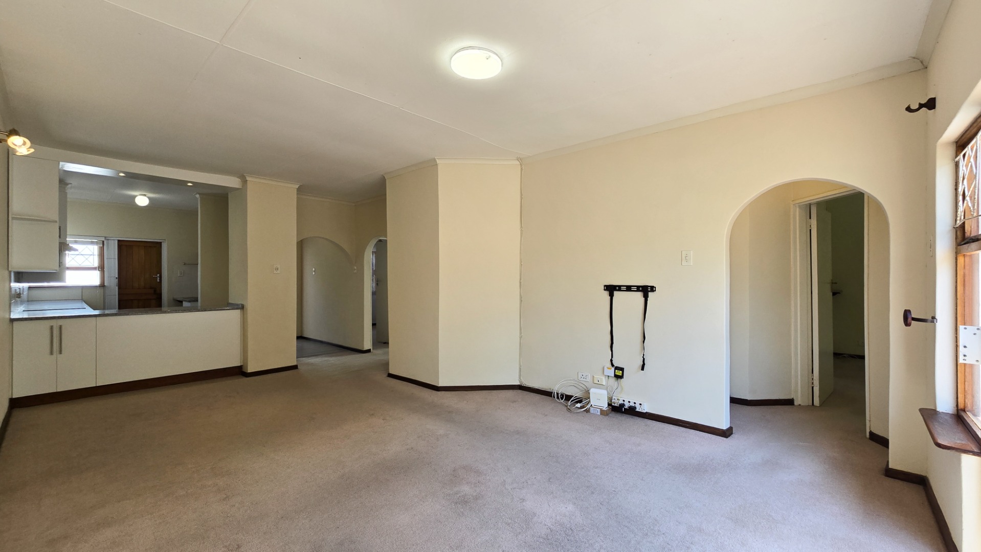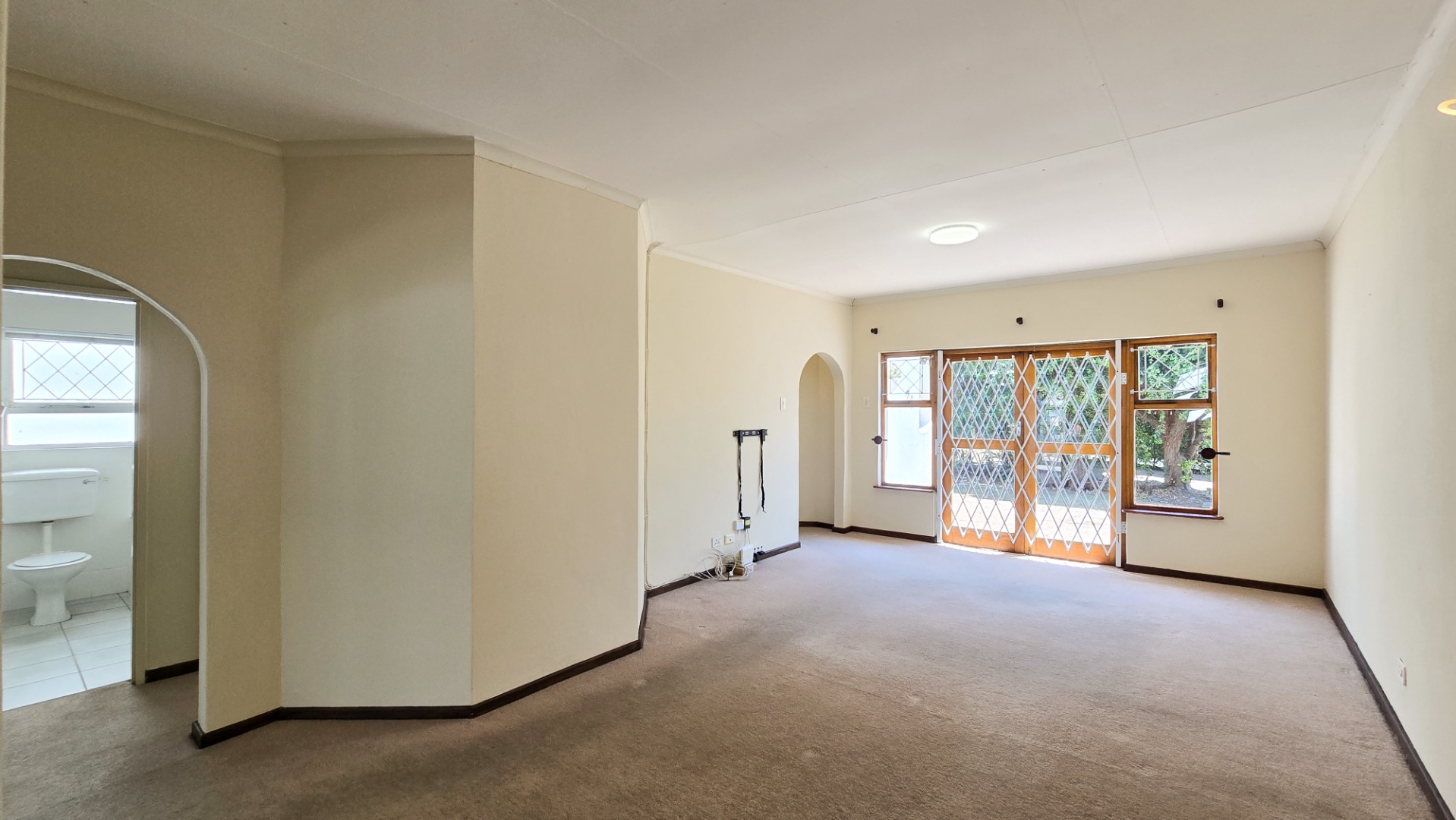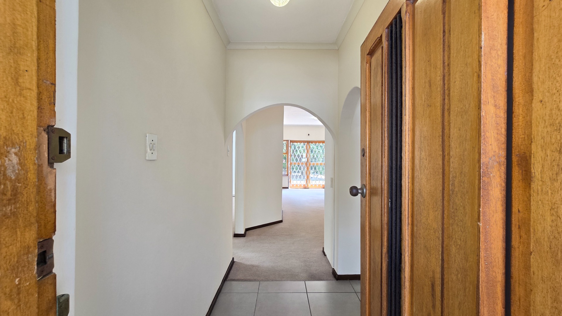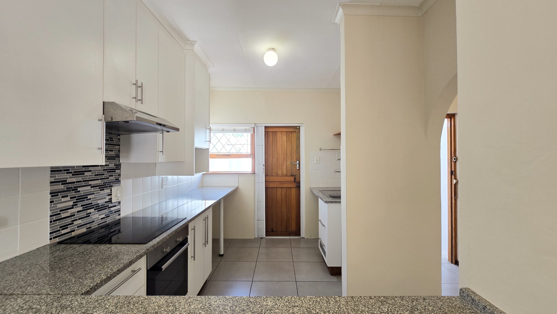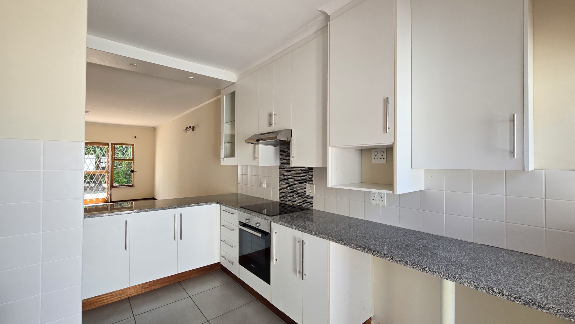 Step inside to an inviting entrance hall with tiled flooring, leading to spacious, carpeted living areas. Architectural archways add character, while large glass sliding doors and windows flood the lounge with natural light, opening onto a private patio. The open-plan design seamlessly connects to a modern kitchen, boasting sleek white cabinetry, durable granite countertops, an integrated electric hob and oven, and a stylish mosaic tile backsplash. A practical breakfast bar enhances functionality.