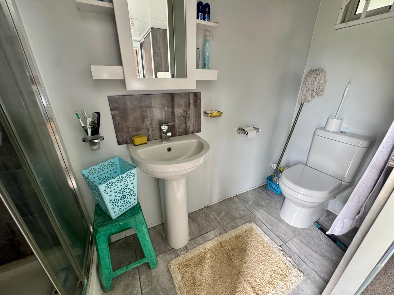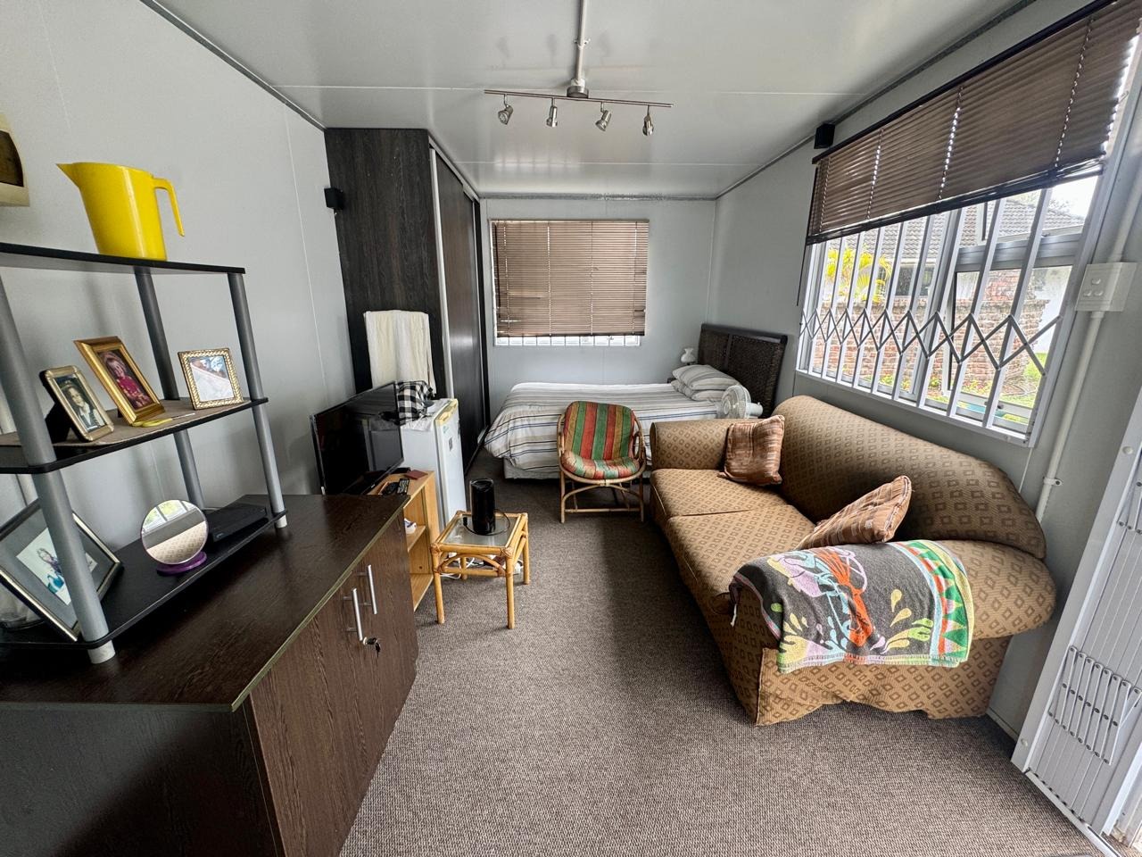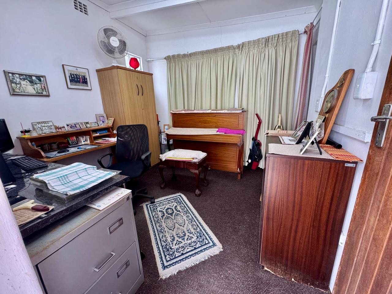 - Domestic room with a shower, currently being utilized as a home office
