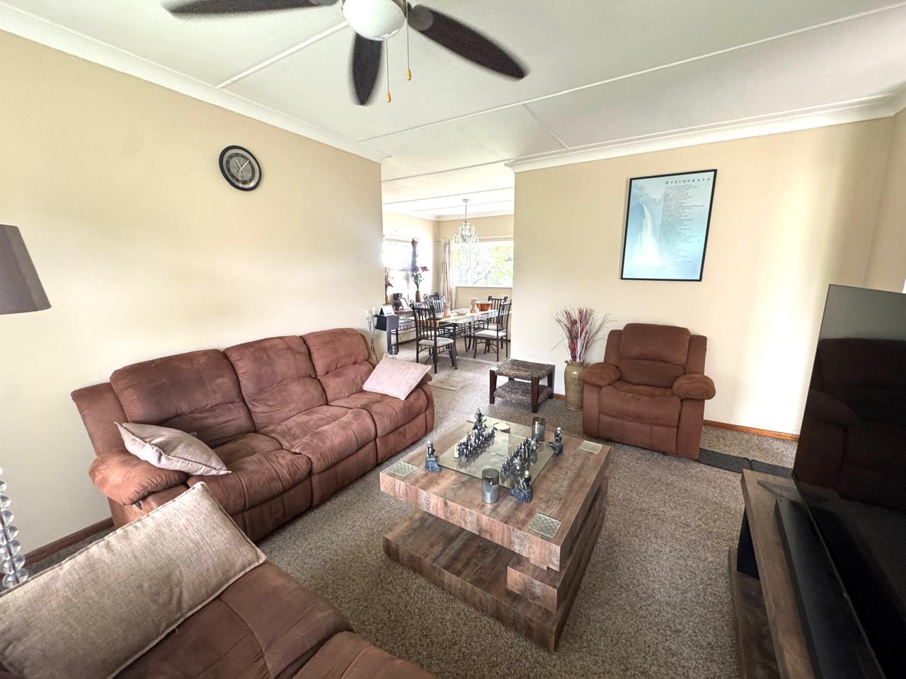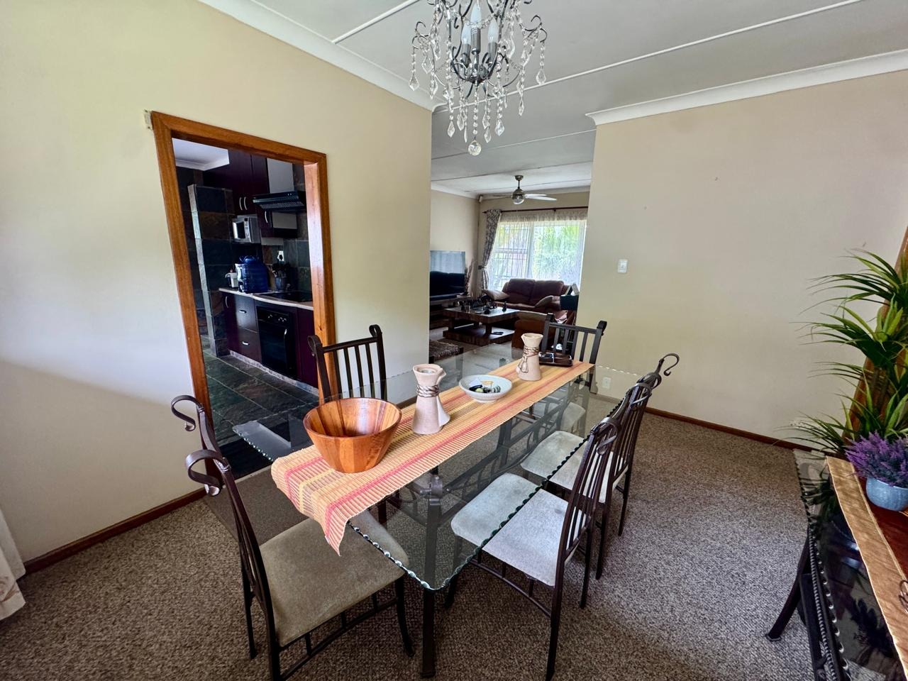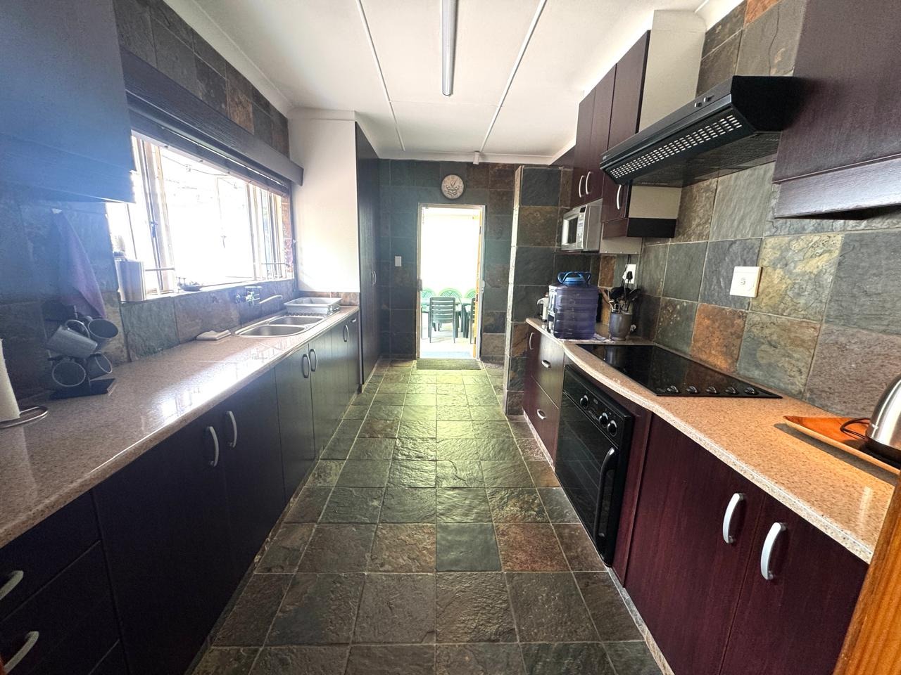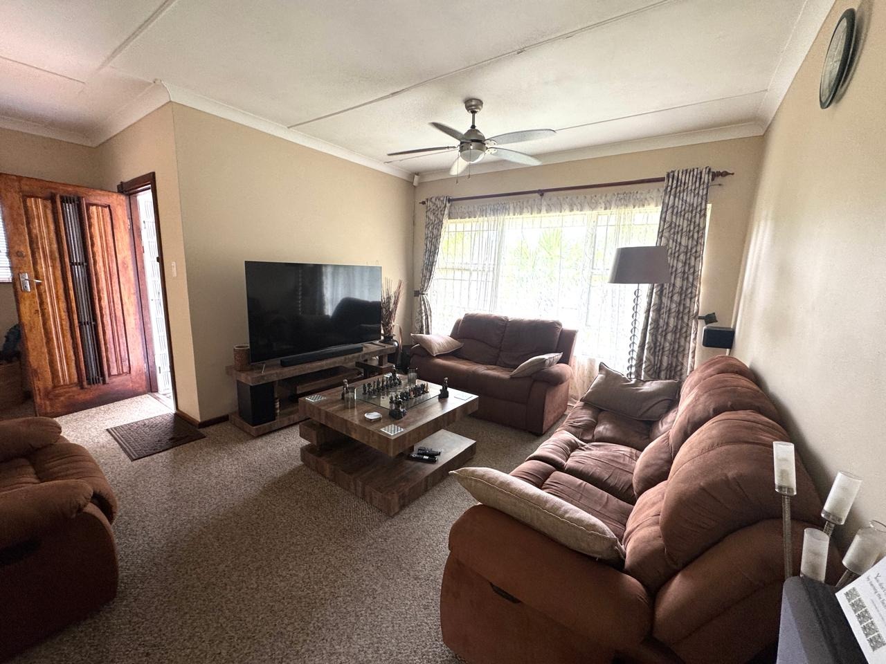 The main house features three well-sized bedrooms, all fitted with built-in cupboards, and two bathrooms. The spacious lounge and dining area create a welcoming atmosphere for family living, while the modern kitchen flows seamlessly into a covered entertainment area — ideal for relaxed gatherings and year-round entertaining.
