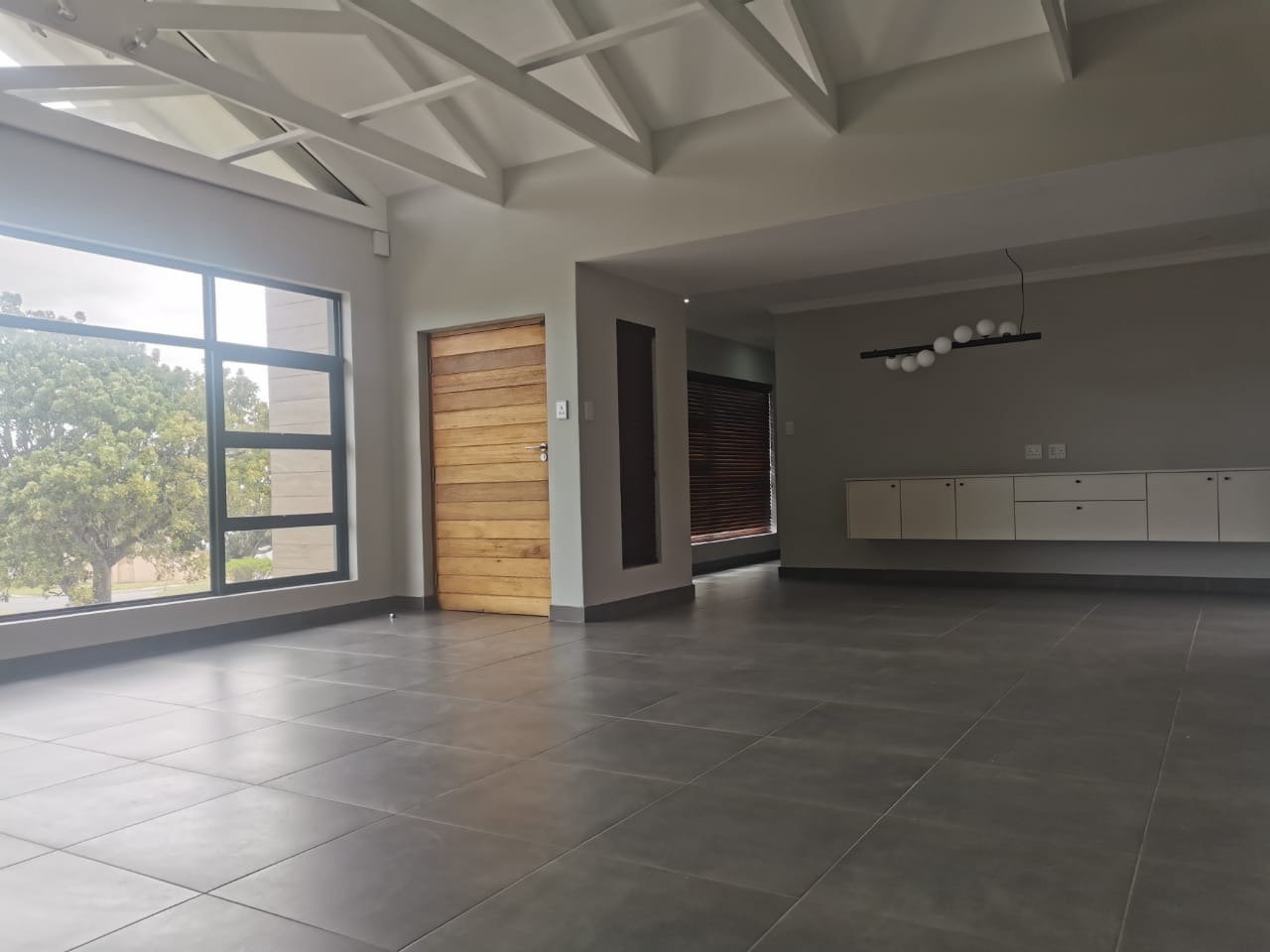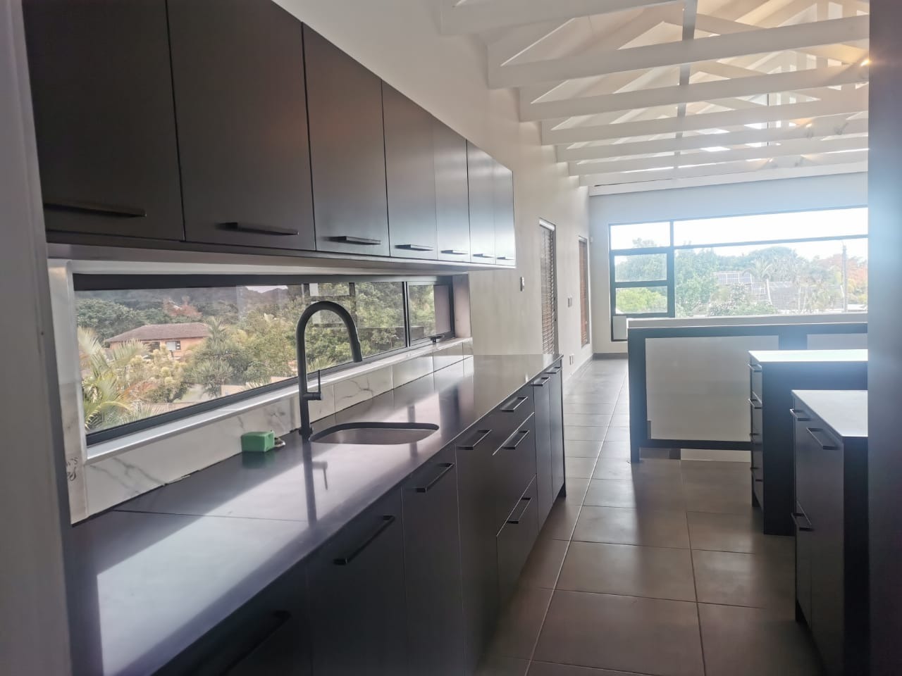 The home features a beautifully designed open-plan kitchen and dining area that flows effortlessly into the living space, overlooking the front lawn and offering scenic views of the surrounding neighborhood.