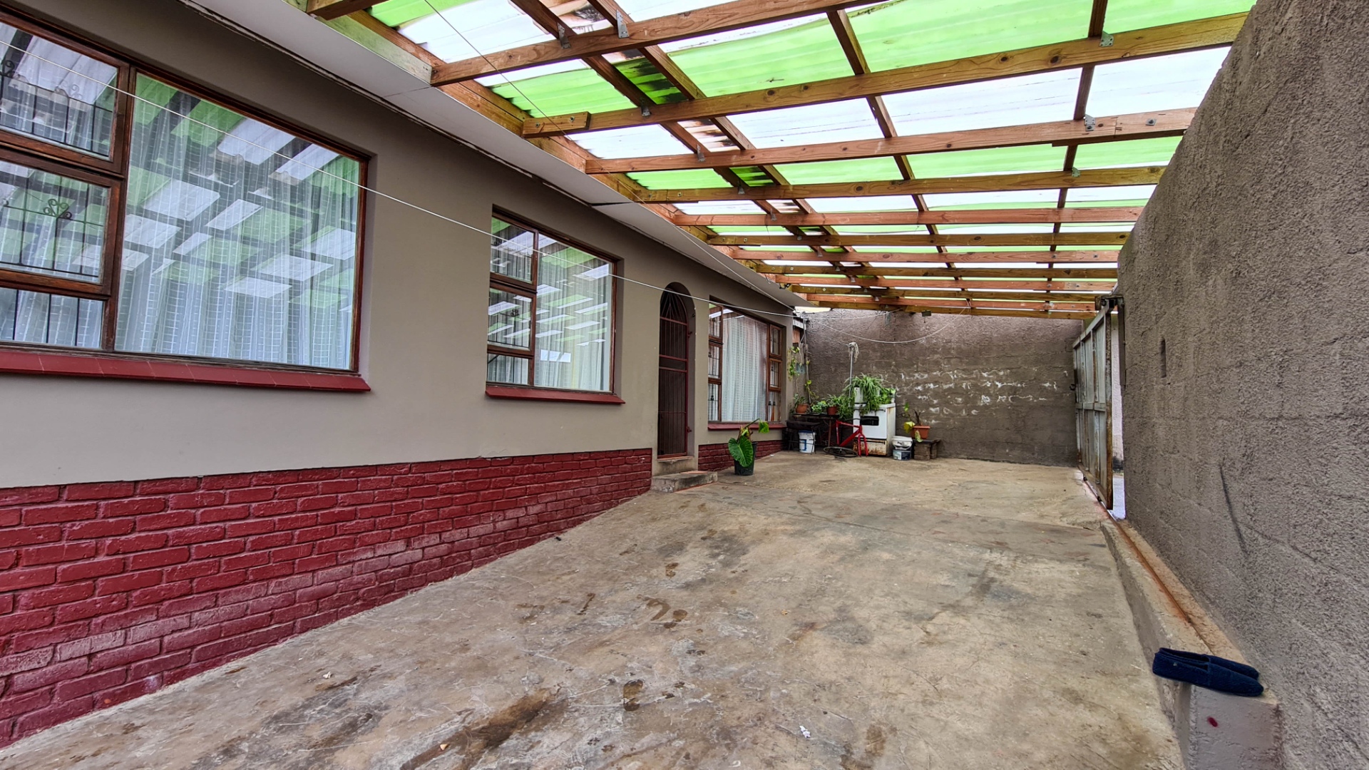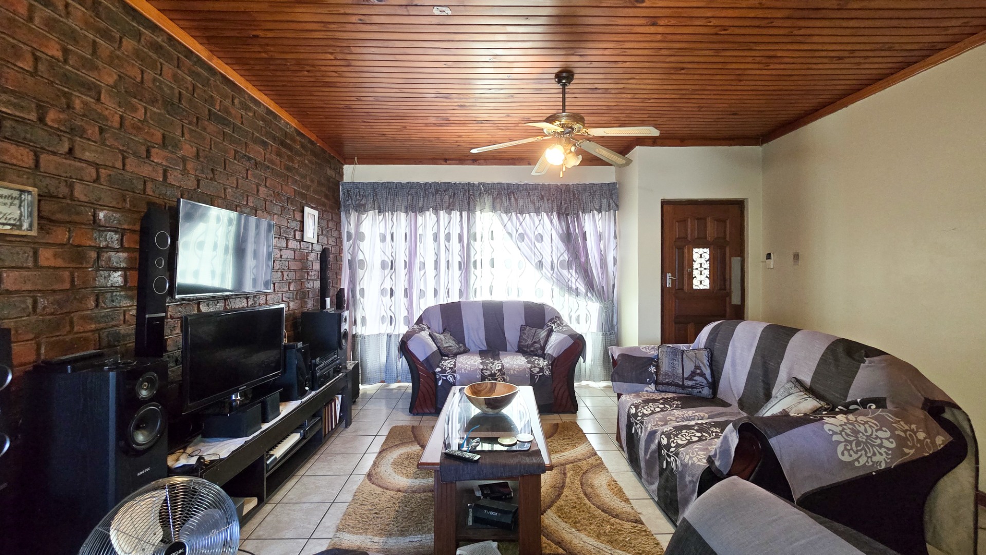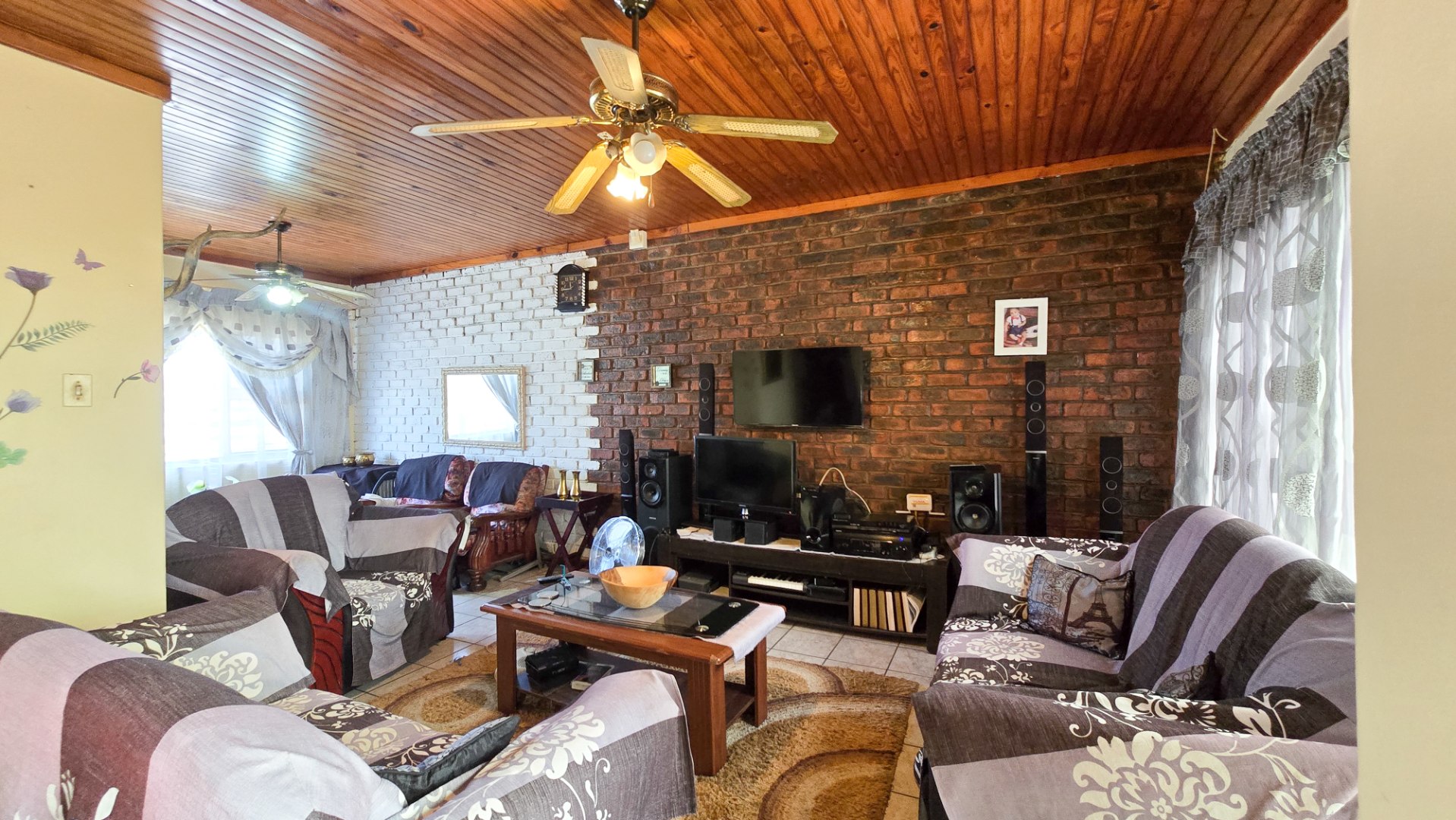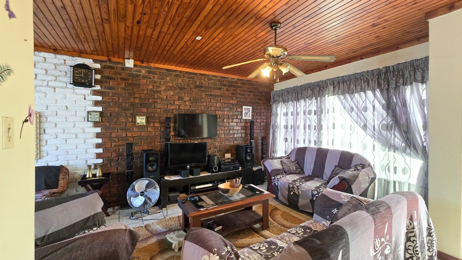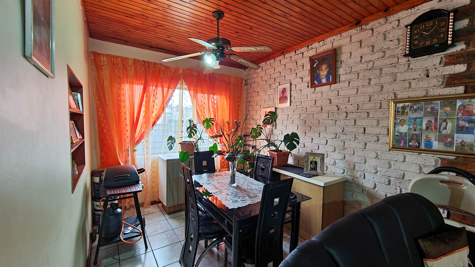The home features a welcoming lounge and dining area with a beautiful wooden ceiling and exposed brick walls, creating a cozy and homely feel. The kitchen is fitted with built-in cupboards and ample counter space, ideal for preparing family meals.